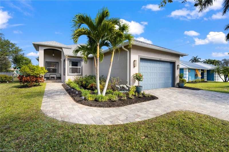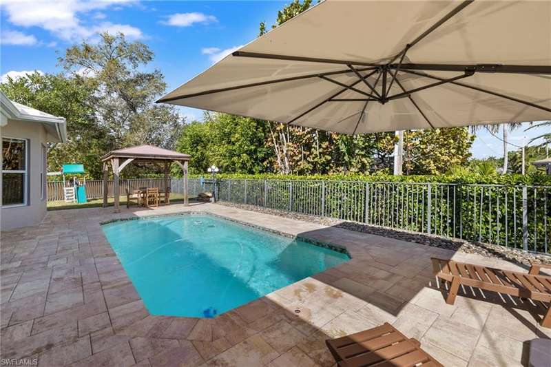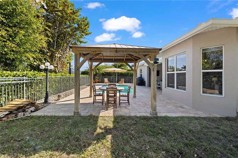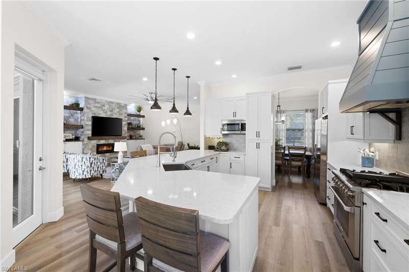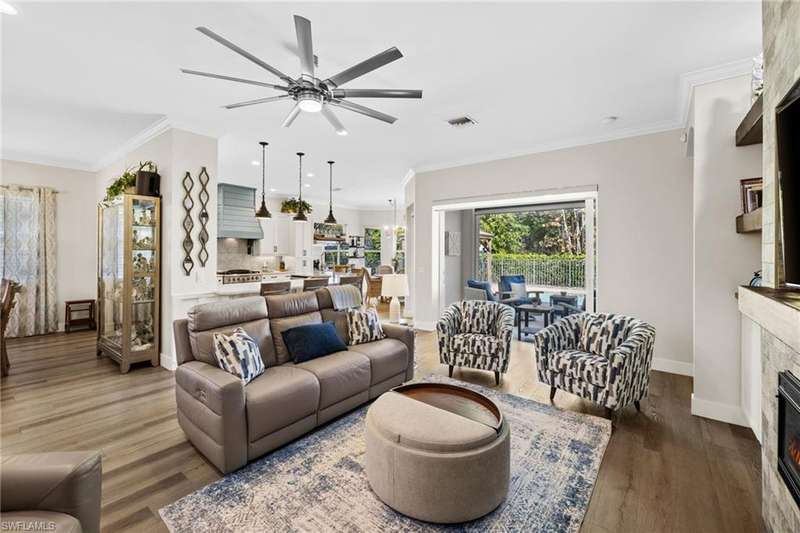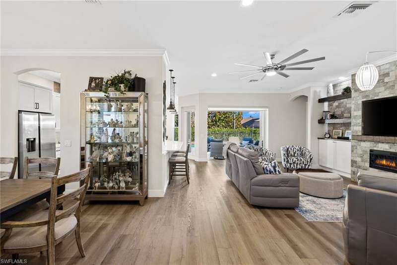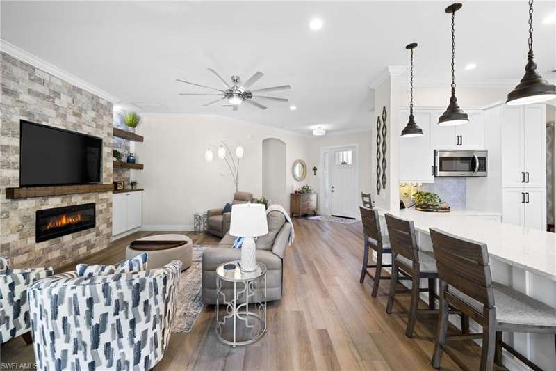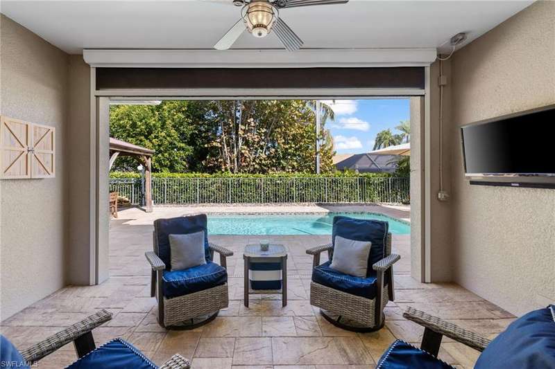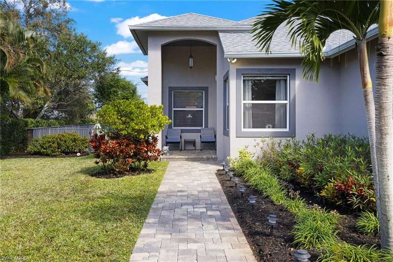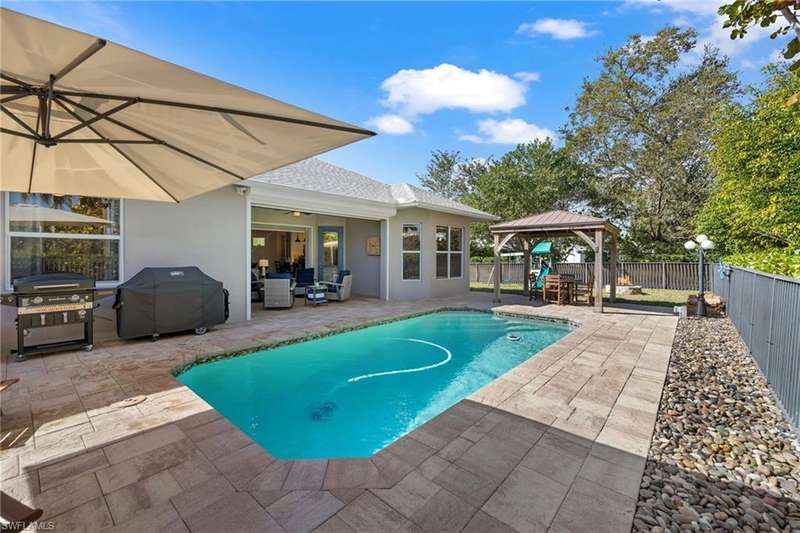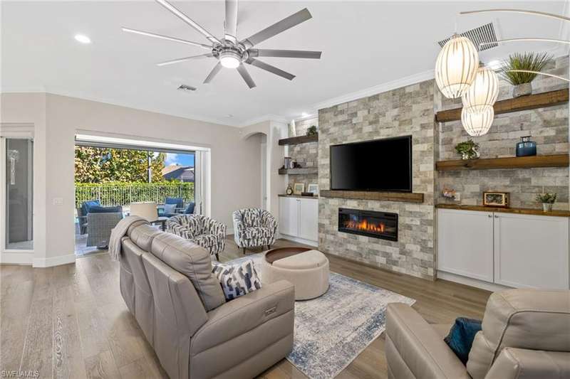 MOVE-IN READY dream home a stunning custom-designed oasis, perfectly located west of 41 in a tranquil neighborhood just a short distance from Bonita Beach. This property offers the perfect blend of coastal luxury and functionality, all without the constraints of an HOA or rental restrictions Upon entering, you are greeted by a sense of sophistication with carefully curated 8 ft 4-panel solid wood shaker doors, matching trim and baseboards, LVTP flooring, and impact glass windows that bathe the interior with natural light. The heart of this home is the stunning chef's kitchen, adorned with quartz countertops, custom cabinetry, and a 36-inch gas stove with a custom hood with a 100-gallon gas tank. The living space features a custom brick accent wall with an electric fireplace and seamlessly extends outdoors to a covered lanai with a retractable screen that leads to a fully fenced-in backyard with an ozone-treated heated pool, gazebo, and side yard. Other features include an 11x23 ft grou