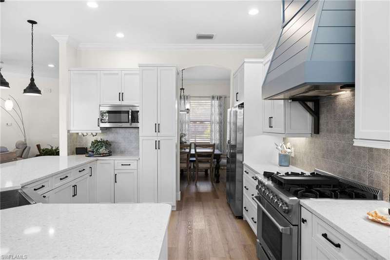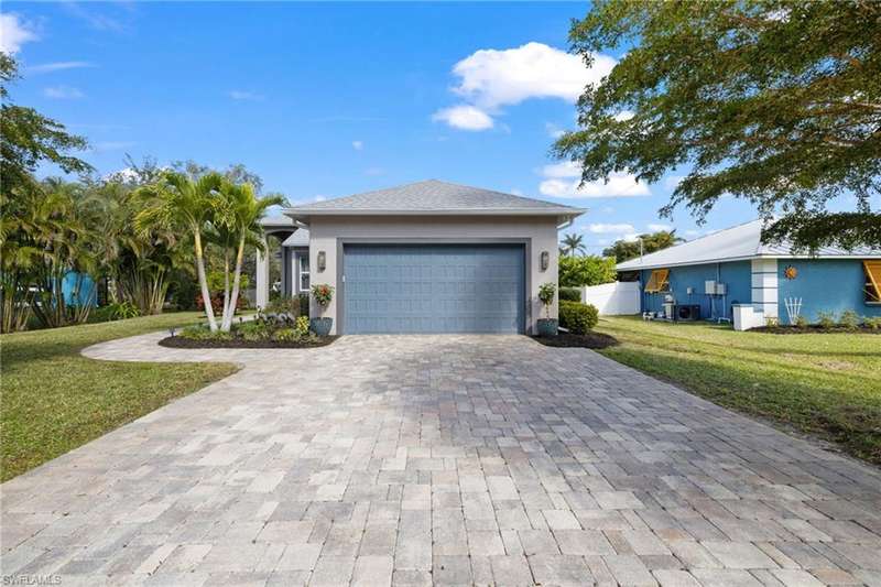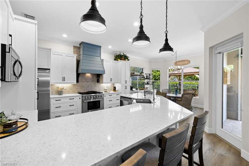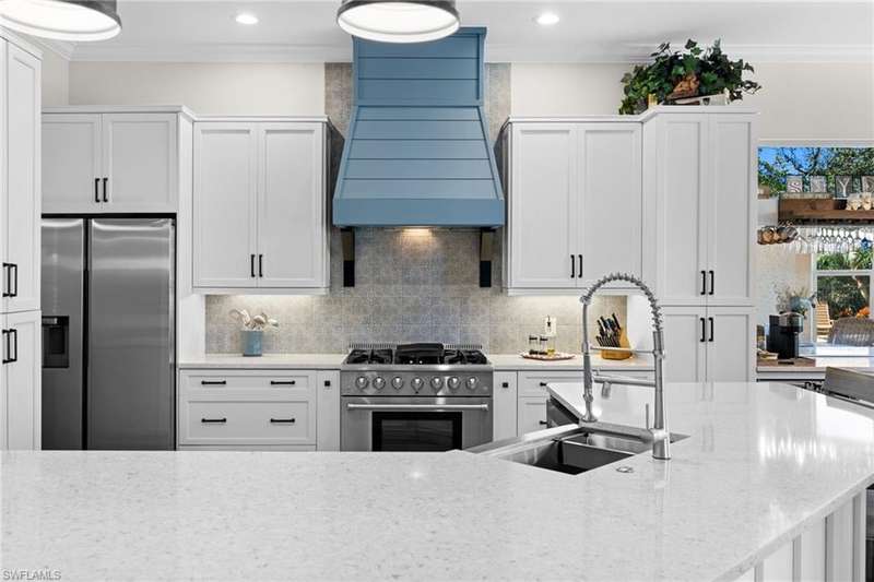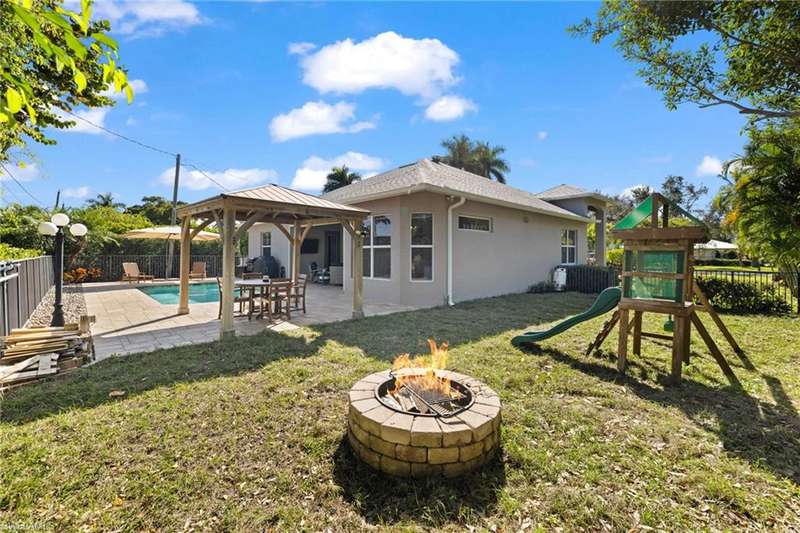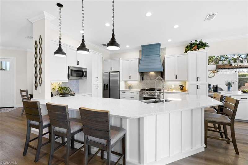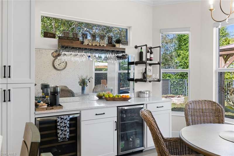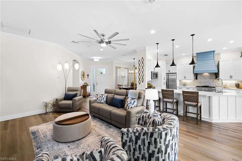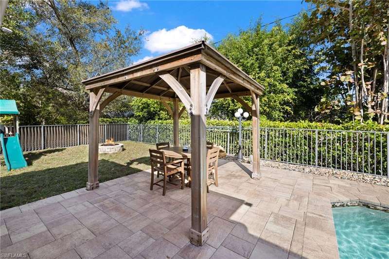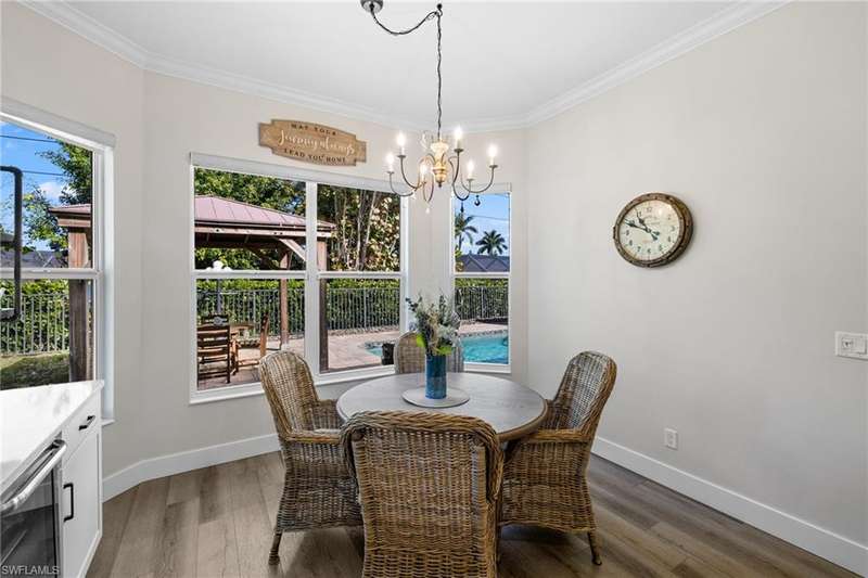 MOVE-IN READY dream home a stunning custom-designed oasis, perfectly located west of 41 in a tranquil neighborhood just a short distance from Bonita Beach. This property offers the perfect blend of coastal luxury and functionality, all without the constraints of an HOA or rental restrictions Upon entering, you are greeted by a sense of sophistication with carefully curated 8 ft 4-panel solid wood shaker doors, matching trim and baseboards, LVTP flooring, and impact glass windows that bathe the interior with natural light. The heart of this home is the stunning chef's kitchen, adorned with quartz countertops, custom cabinetry, and a 36-inch gas stove with a custom hood with a 100-gallon gas tank. The living space features a custom brick accent wall with an electric fireplace and seamlessly extends outdoors to a covered lanai with a retractable screen that leads to a fully fenced-in backyard with an ozone-treated heated pool, gazebo, and side yard. Other features include an 11x23 ft grou