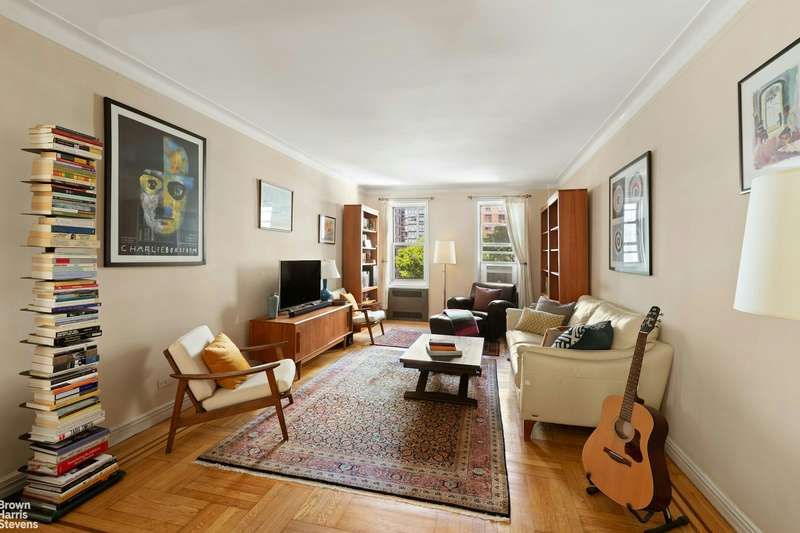 The home's renovated windowed kitchen flaunts a new refrigerator and dishwasher, quartz countertops, wall oven, and Gaggenau cook top. The living room and second bedroom boast beautiful new strip hardwood floors, and the primary bedroom has parquet hardwood  flooring. The home is further enhanced by excellent closet space and central air conditioning.
