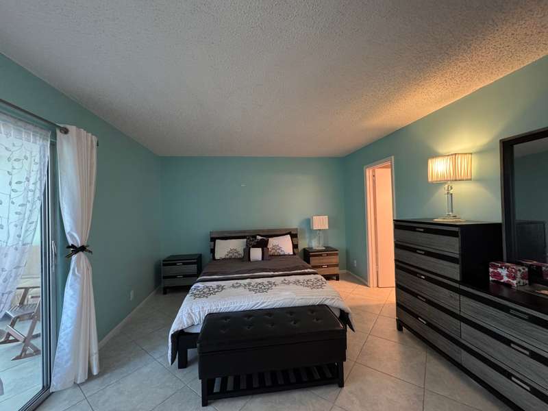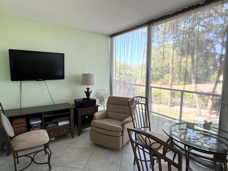 Fully furnished condo, move in ready! This beautifully updated turnkey 1-bedroom, 1.5-bath condo is located in the vibrant 55+ resort-style community of Century Village. Relax and unwind in the spacious Florida room with private garden views. The home features a newer central A/C and is conveniently located near both stairs and an elevator.Inside, enjoy an inviting open kitchen with a stylish backsplash, custom lighting, glass-top range, built-in closets for ample storage, and an extra small refrigerator for added convenience. The building also offers additional storage in the laundry room. The condo is tastefully furnished with quality furniture and features tile flooring throughout for easy maintenance. Accordion shutters provide extra security and peace of mind.
