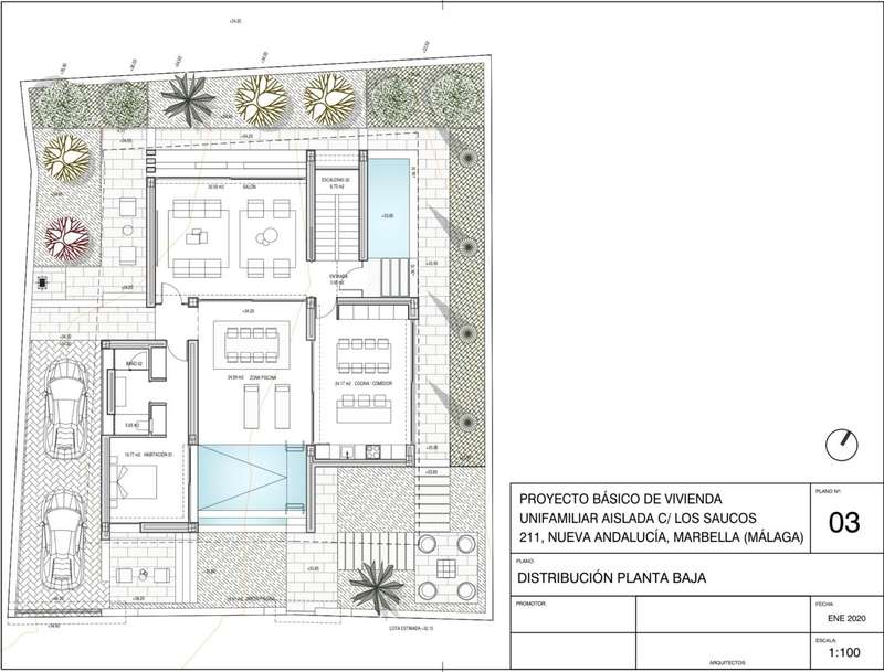 Brand new villa south facing, at present under construction in a very central position of Nueva Andalucia within walking distance to the beach and to the supermarket and restaurants. Set in a small dead end street, built to a high quality of construction with a large basement and with sea views from the upper level. The villa is a contemporary moderm design with large top quality black aluminium frame windows from floor to cealing. The ground floor is built around the pool area with it’s terrace and large windows givig a lot of light to the house. The kitchen is on open plan area with dining area and living room alongside, both opening out to a terrace beside the swimming pool. The three bedrooms with bathroom ensuite are on the first level and there is another bedroom with bathroom ensuite too, on the ground floor. This is a magnificent oportunity to live close to all amenities and just few minutes walking distance to the beach.