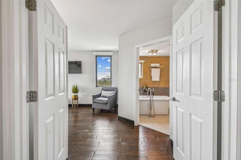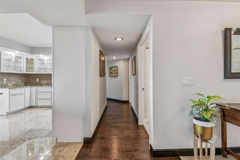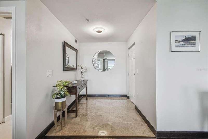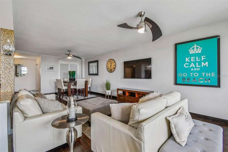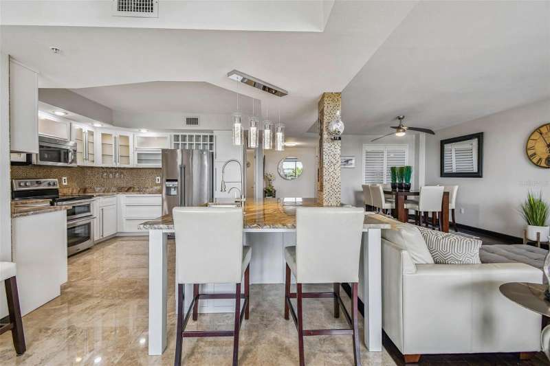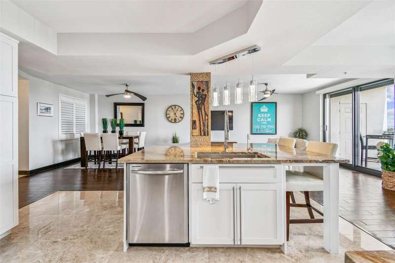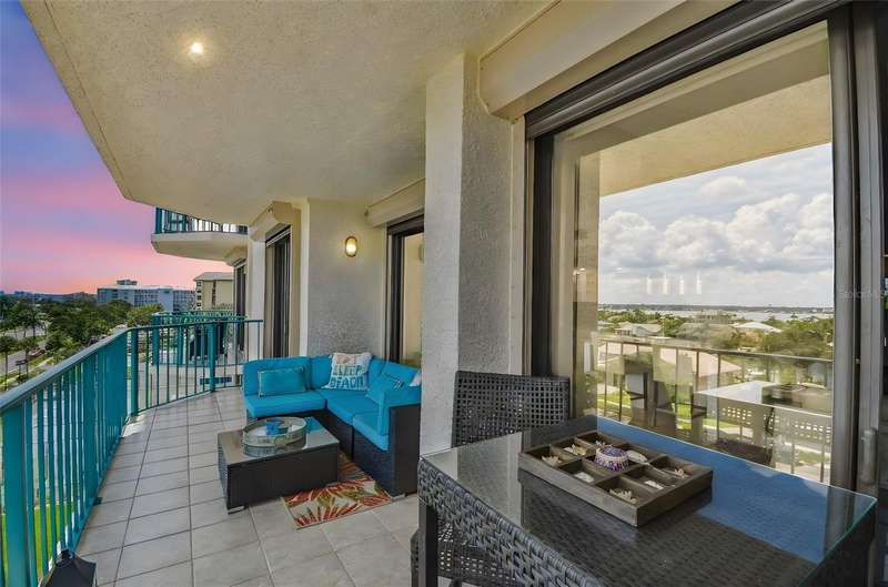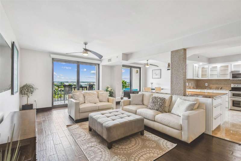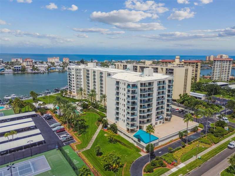 Stunning Southeast Corner Unit Condo with wrap-around BALCONY! Updated, Rare find, Kitchen Space Reimagined, Completely Open to Living and Dining. Welcome to Sunwatch Condominiums on Island Estates, 6th Floor, Water Views to the Southwest, see the Gulf and Intracoastal Water Views to the East, distant View of St. Joseph's Sound and Downtown Clearwater, the Sound Amphitheater, and to the Northeast see Dunedin too! This Condo is Move-In Ready with all large furniture staying for the new buyer! Peace of Mind and Energy Efficiency: 2022 REMOTE-controlled HURRICANE Shutters on all Sliders! And Nothing to do here! 2023 AC, 2021 Hot water tank, remodeled from one end of the condo to the other. Light and bright with an open floor plan and tile and wood floors, custom cabinets, stone tops, and high-end finishes. Specifically, to this unit UNDER BUILDING SECURE PARKING Space #45 under the building parking! Waterfront Resort Style Complex with 2 Tennis Courts, 2 Pools, Spa, Fitness Room, Billiards/Meeting Room, Party Room, 2 Covered Outdoor Pavilions, 2 Grills, Beautifully Landscaped Grounds, Guest Suites, and when available Marina Slips! Full-time property manager on site and building maintenance supervisor. Large Balcony invites you to enjoy the View of the Pools, the Passing Yachts, Personal Watercraft, Dolphins, Beach Activity, and Seasonal Sunsets. Just minutes from the Beach and just down the street from Dining, Bar and Grill, Grocery Store, UPS, Nail Salon, and Clearwater Marine Aquarium! This is a Pet-Friendly Building, Rentals allowed, One-year Minimum. This is a Great Condo Get Away, a way to End Your 1031 Exchange or a Full-Time Residence! What are you waiting for? Come Live the Lifestyle; Come Live on the Island!