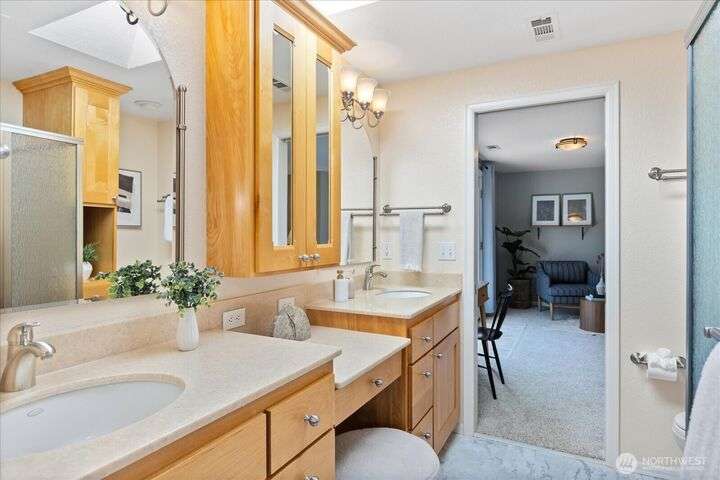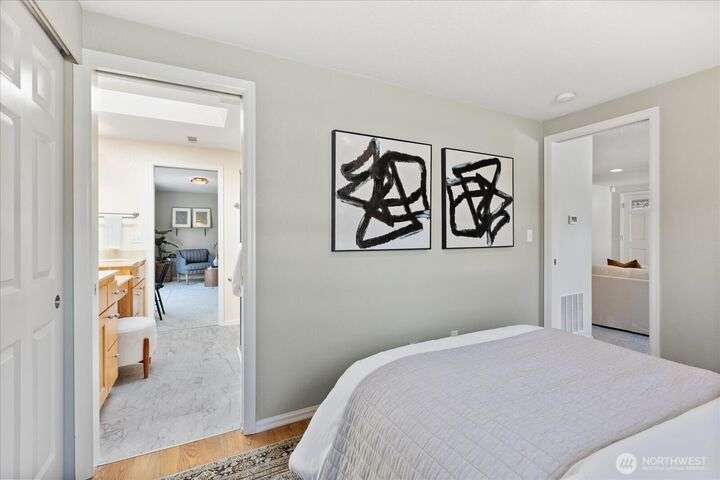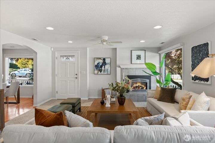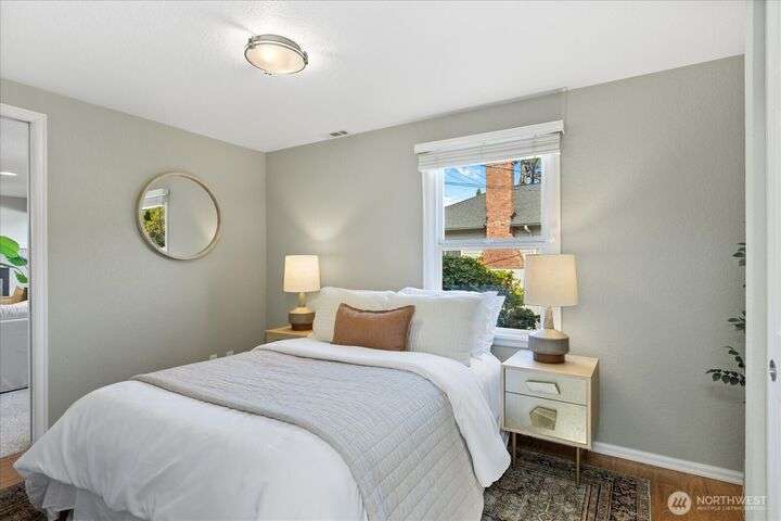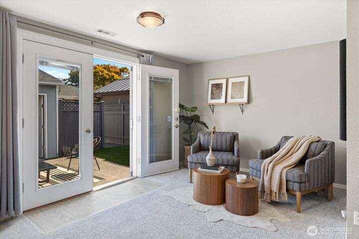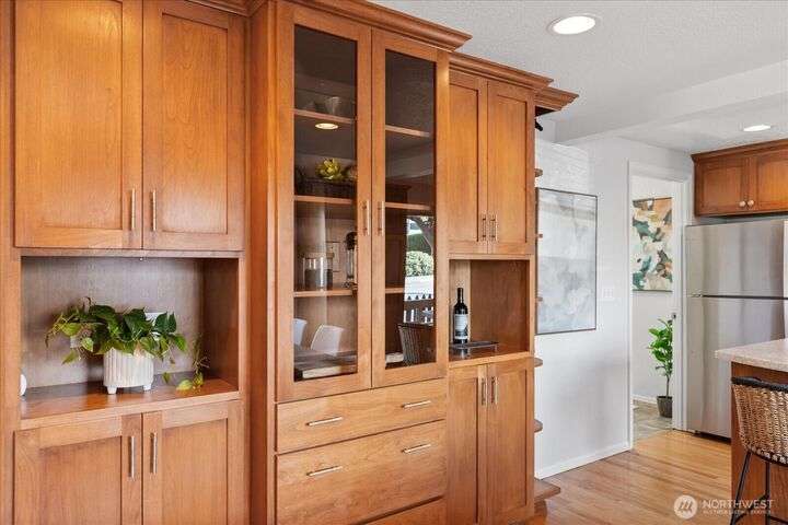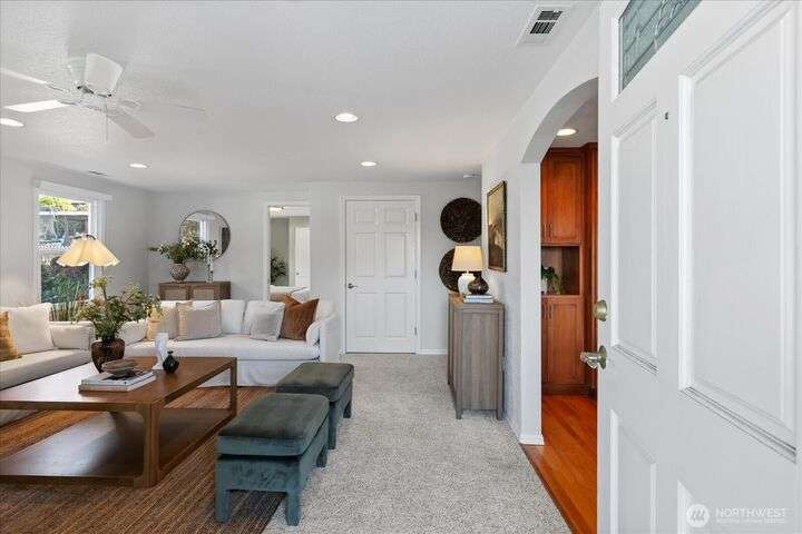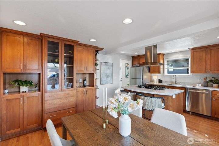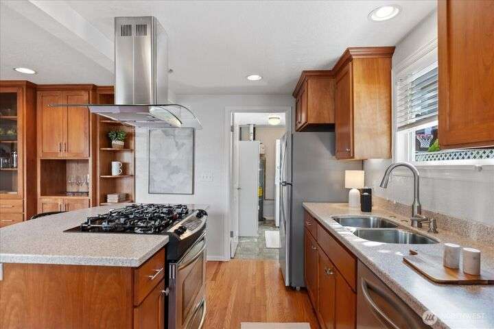 Downtown Edmonds bungalow in the heart of everything. This adorable and move in ready 2 bed home has been lovingly remodeled and maintained. Open kitchen with eat in island, adjoining dining, corian counters and many built ins. Large living area with picture windows and gas fireplace. Oversized primary suite with walk in and access to yard with turf. Remodeled bath connects to 2nd bed, perfect for guest room/office. Beautiful, easy maintenance landscape. Alley access to detached 2 car garage with work bench and overhead storage PLUS fenced RV parking. Newer roof and brand new gas furnace. Minutes to shops, restaurants, beaches, ferry, train and so much more.