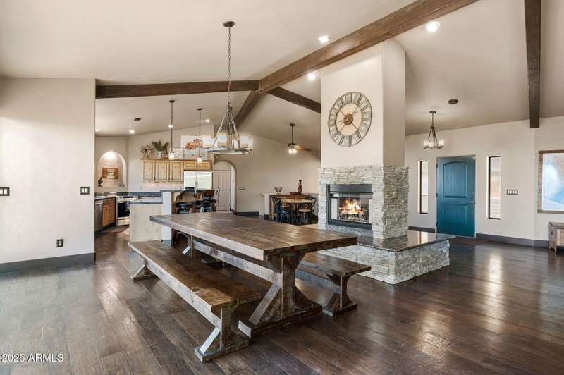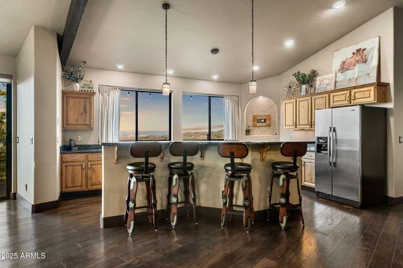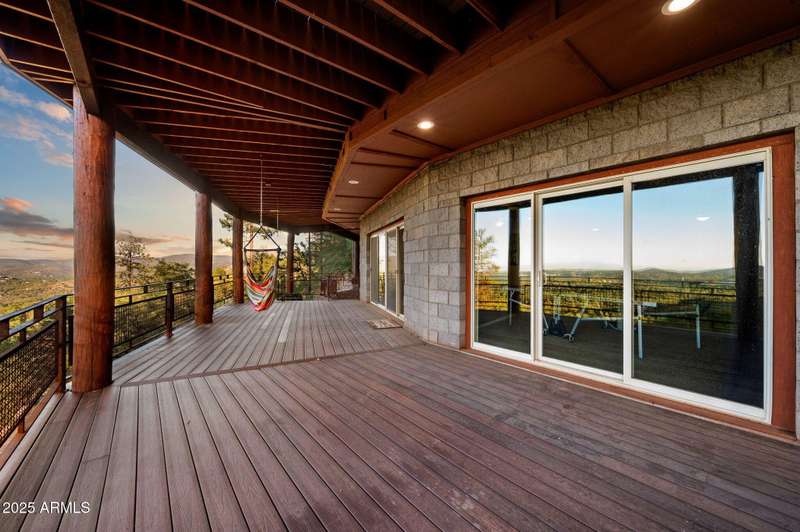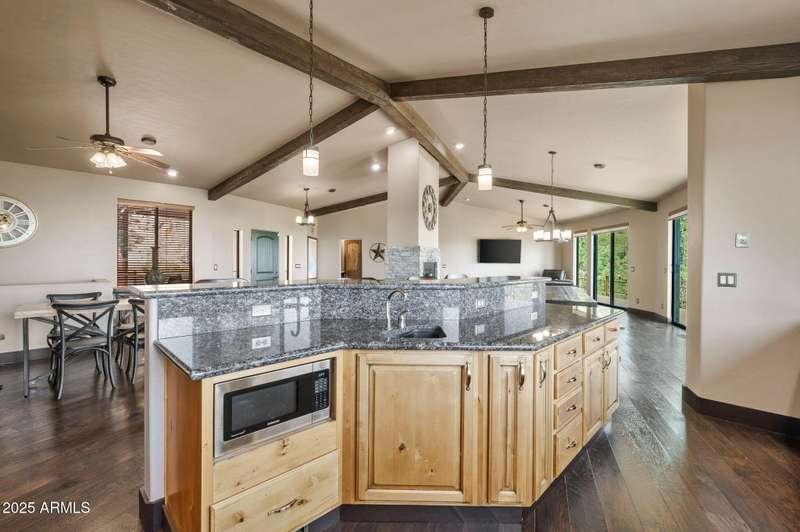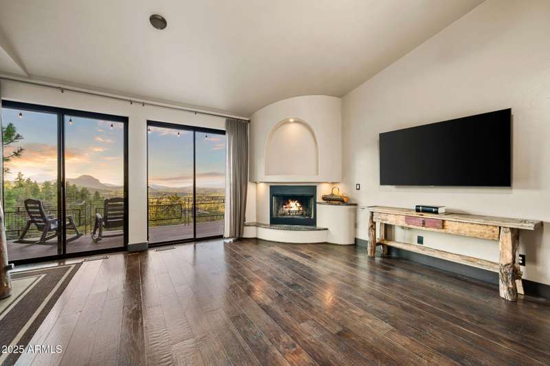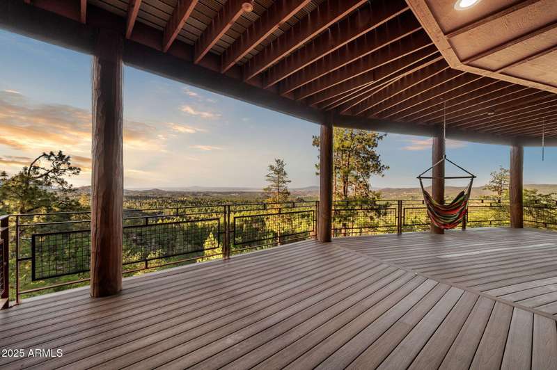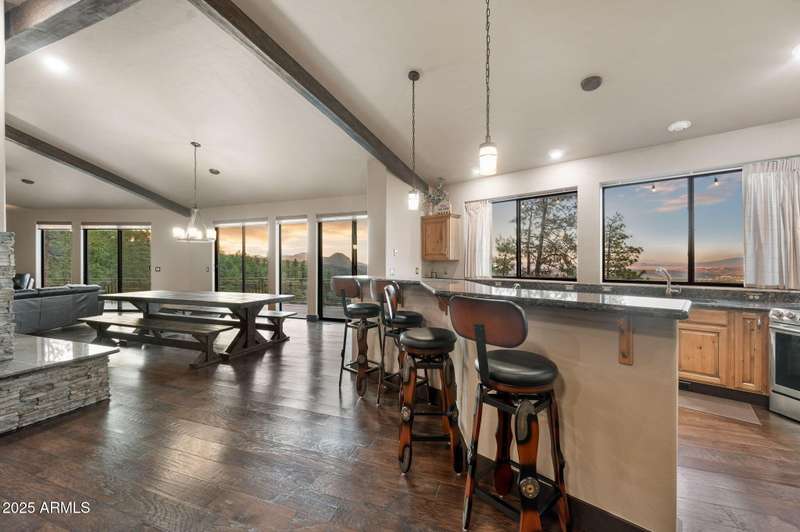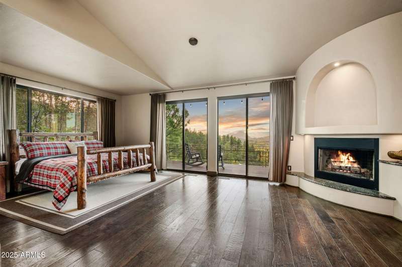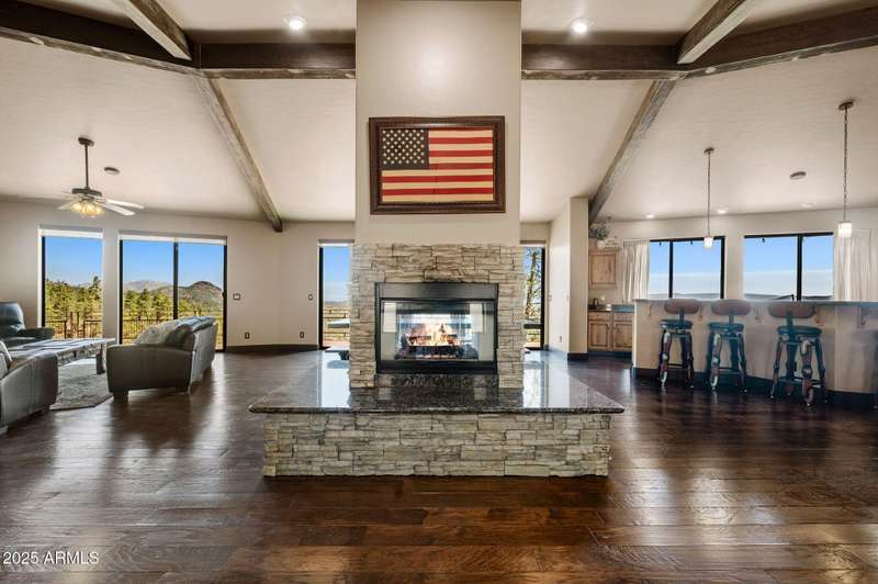 Experience life as if you're above the clouds in this breathtaking contemporary-rustic estate, perched atop a mountain and tucked into 4 acres of private forest backing directly to the Prescott National Forest. Just 10 minutes from historic downtown, this mountaintop retreat feels worlds away—offering total seclusion, paved access, and panoramic views from every single window. The setting is so peaceful, you'll hear nothing but the wind in the pines and birds overhead. And as day turns to night, the views become even more magical—revealing a blanket of sparkling city lights that stretch across the horizon. Set at the end of a quiet road and surrounded by towering Ponderosa pines, this legacy property includes a 4,251 sq ft main residence and a charming 320 sq ft guest log cabinideal for visitors, a studio, or future expansion. The cabin features its own ¾ bath, vehicle access, and sweeping views, just a short 5-minute walk from the main home. Inside, rustic elegance and thoughtful design define the space. Soaring beamed ceilings, wide-plank floors, and a dramatic floor-to-ceiling double-sided stone fireplace create a warm, welcoming atmosphere. A wall of windows frames the natural beauty outdoors, flooding the interiors with light and bringing the forest into every room. The main level is crafted for effortless living and entertaining. The spacious primary suite features a cozy wood-burning fireplace and sliding glass doors that open to a full-length deck, where the views stretch for miles. The en suite bath feels like a private spa, complete with a double vanity, soaking tub, and walk-in shower surrounded by tranquil forest scenery. You'll also find an elegant powder room, an oversized walk-in pantry, and a beautifully appointed laundry room with custom cabinetry and generous storage. The kitchen is both warm and functionalfeaturing natural wood cabinetry, granite countertops, and a large wraparound breakfast bar with seating for five. Perfectly positioned to capture the mountain views through oversized picture windows, this open-concept space flows seamlessly into the dining and living areas, making it ideal for entertaining. An oversized 2.5-car garage offers ample room for vehicles, gear, and storage. The entire main level opens effortlessly to the outdoorsperfect for al fresco dining in Prescott's temperate, pine-scented climate. Downstairs, a large family or game room with a built-in wet bar offers the ideal space to gather, along with two guest bedrooms and a full bathdesigned to accommodate up to eight beds. Whether you're seeking a full-time sanctuary or a refined seasonal escape, this home delivers the rare combination of natural beauty, timeless design, and total privacy. With unforgettable views, forested serenity, and room for guests to stay and playthis is more than a home. It's a mountaintop experience.