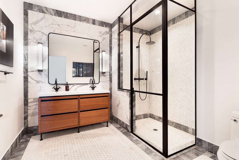 Secluded on the eastern side of the apartment is a spacious primary bedroom suite, complete with a walk-in closet, two additional closets, and a four-fixture master bathroom with double-vanity and a large step-in shower with rain head.