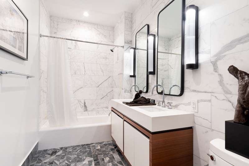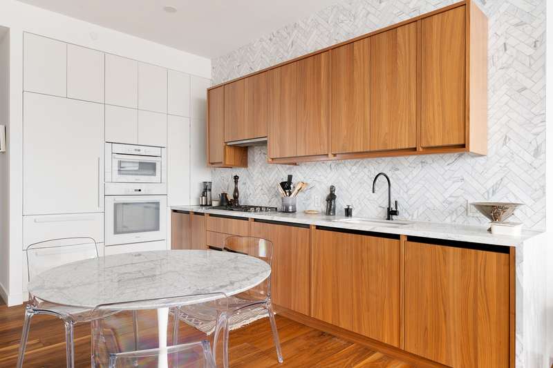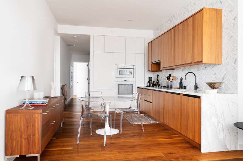 A formal entryway with two coat closets leads to a gallery, unfurling to reveal an open kitchen, dining and living space overlooking the East River with corner floor-to-ceiling windows. A large L-shaped kitchen provides bountiful storage and useful prep space in a unique two-tone design. Walnut cabinets are framed by a waterfall-edge countertop and herringbone Carrara tiles stretching to the ceiling. Opposite and conversational with this modern kitchen is a living and dining area stretching 32' wide. Ample space and flexibility provide for varied arrangements for separate dining and living areas, all gravitating towards the captivating views. There is also a powder room located off the central hallway.