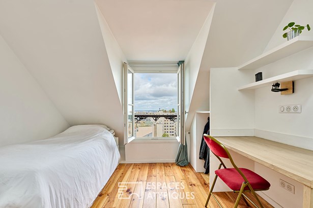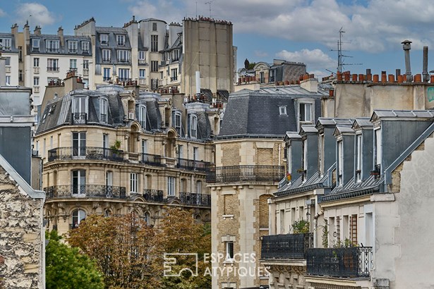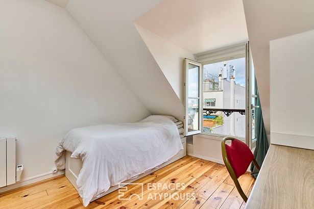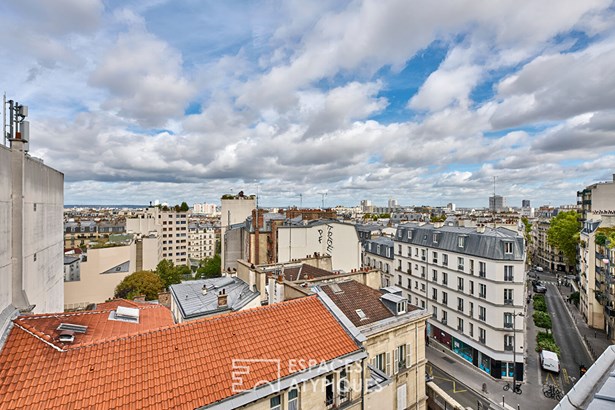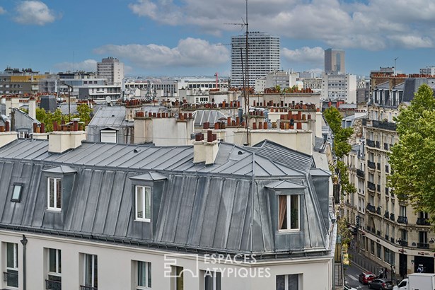Nestled on the sixth top floor of a well-maintained condominium without elevator, this newly renovated 13.53 m2 apartment (10.71 m2 Carrez) benefits from views of the Parisian rooftops and the sky through the double roof windows.