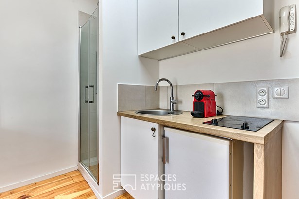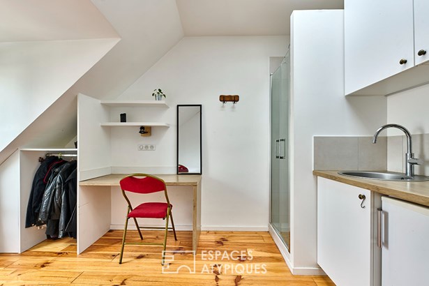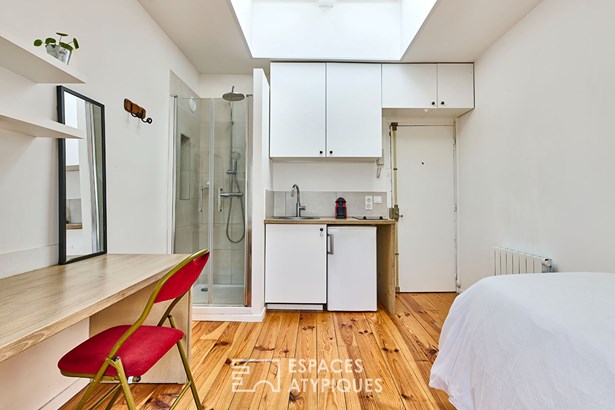 With 3.50 meters of ceiling height in its highest part, the studio has a beautiful volume and very beautiful luminosity.