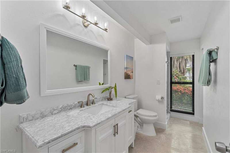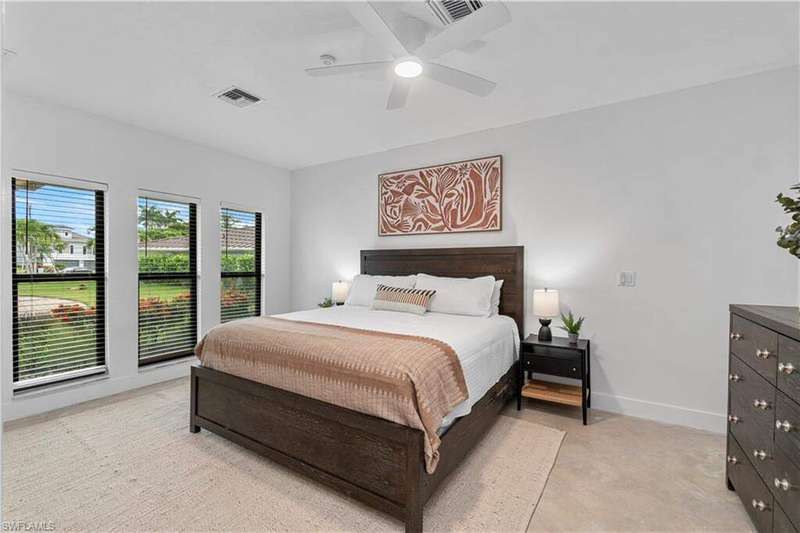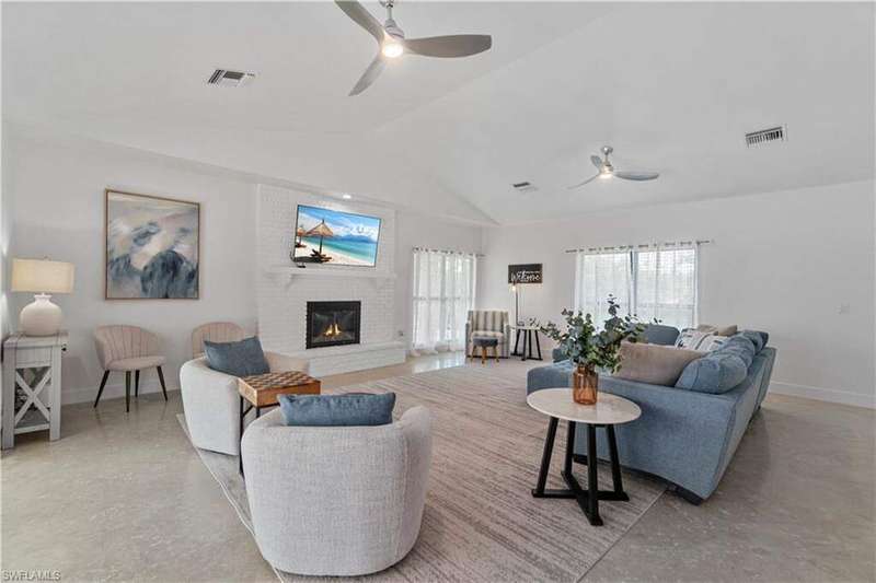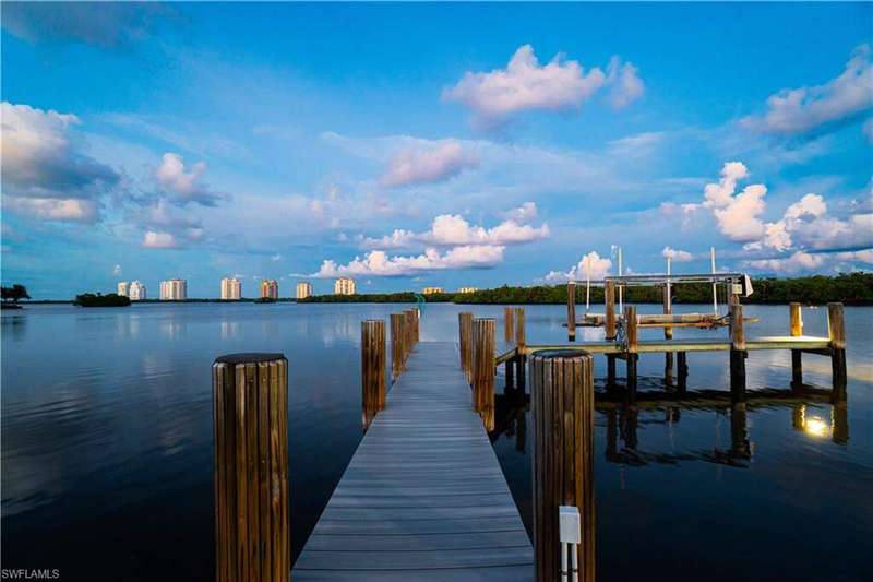 Beautiful COASTAL CONTEMPORARY estate with WIDE BAY VIEWS, perfectly positioned on a RARE OVERSIZED 0.53-ACRE LOT on the bayside of Bonita Beach. This property is truly a beach and boater's delight-JUST A 10-MINUTE WALK (0.4 miles) to the pristine sands of BONITA BEACH, with QUICK GULF-ACCESS and the ULTIMATE BOATING SET-UP. Updated in 2016, the waterfront includes a 12,000 lb boat lift (accommodating up to a 30' vessel) and a composite dock with electric and water. Built with solid concrete block construction, hurricane-impact windows and doors, and a newer roof (2019), the home offers 4 bedrooms, 3.5 bathrooms, soaring ceilings, and polished concrete flooring throughout. The chef's kitchen showcases sleek white quartz countertops, crisp white cabinetry, a breakfast bar, and breathtaking bay views. Step outside to your spacious screened lanai with an expansive solar-heated saltwater pool and abundant lounging space. Beyond the lanai, the oversized lot provides ample yard space-ideal for pets, recreation, or simply watching dolphins and manatees in the bay. The serene primary suite offers private lanai access, a large walk-in closet, and a spa-like bath with dual vanities and a frameless glass shower. With no HOA fees or rental restrictions, this property is also an excellent investment opportunity. Ideally located near top dining and shopping, just minutes from Mercato, The Promenade, Waterside Shops, Coconut Point, 5th Avenue, and the International Airport.