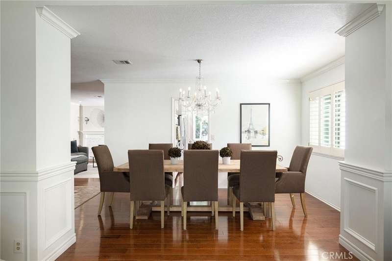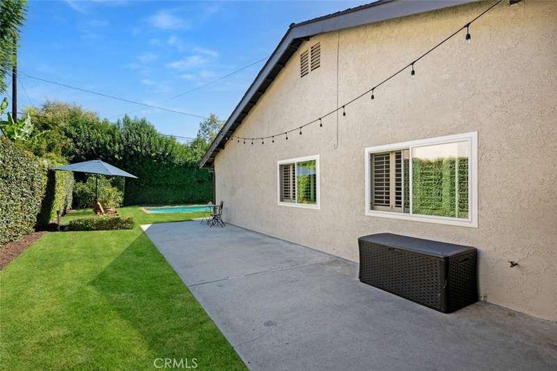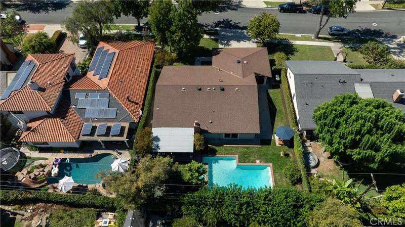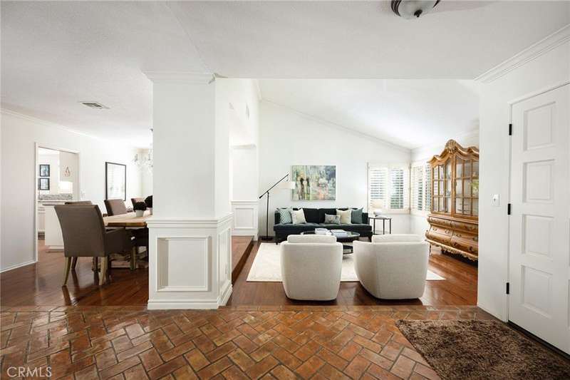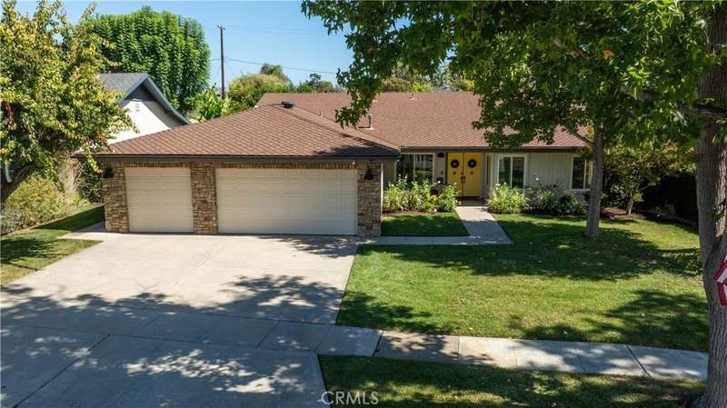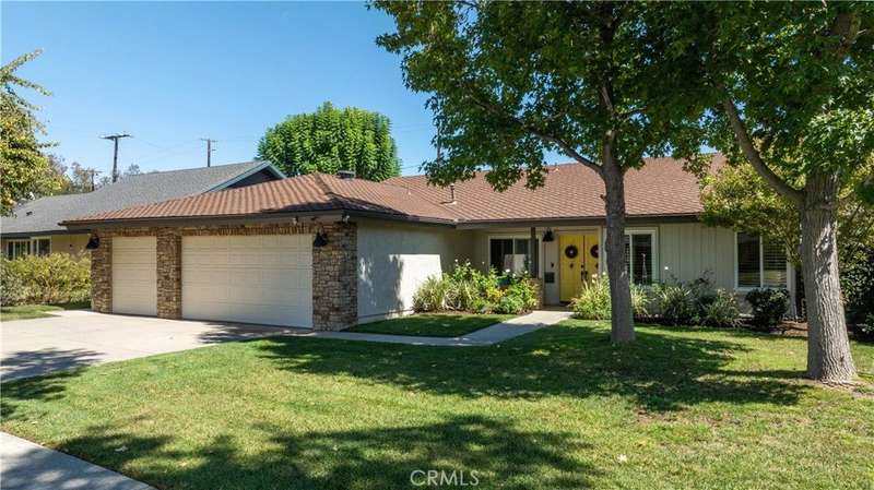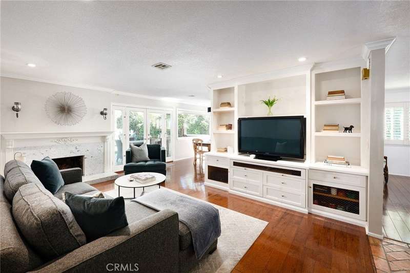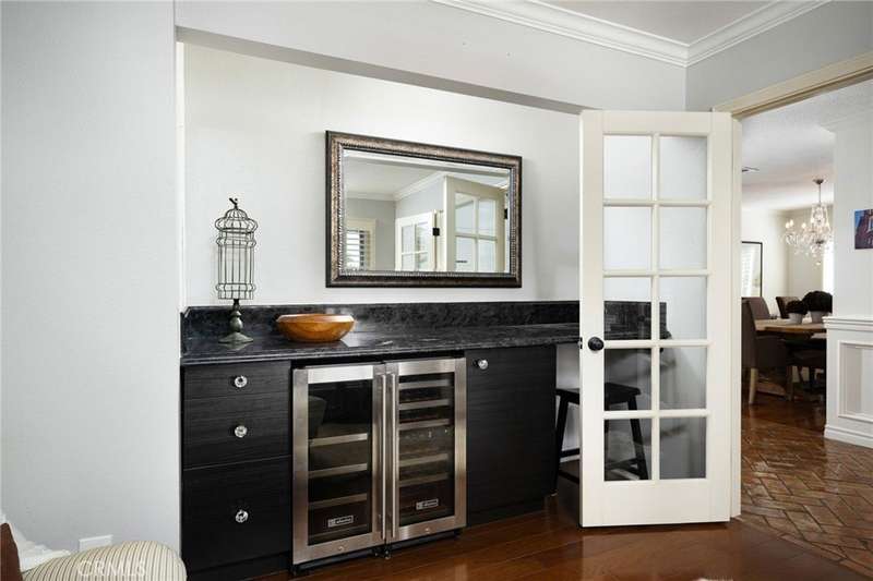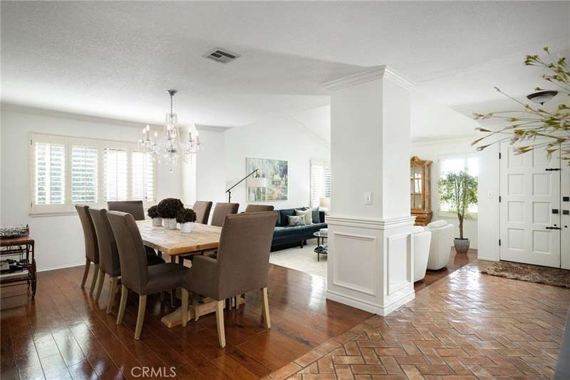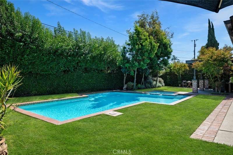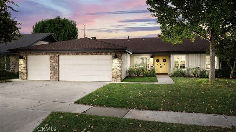 Beautifully upgraded inside and out, this stunning West Floral Park home combines modern living with timeless craftsmanship and elegant finishes. A manicured front yard and inviting porch welcome you to the double-door entry. Inside, the finished brick flooring and the Mannington dark walnut hardwood floors set the tone for the sophistication throughout. The spacious living room impresses with its cathedral ceiling with wide crown molding. The adjoining dining room, defined by a graceful ceiling change, wainscot panels and crystal chandelier, offers an intimate setting for special gatherings. Large windows and glass doors fill the home with natural light and showcase backyard and pool views from many rooms. The remodeled kitchen features crisp white cabinetry, stainless steel appliances, crown molding, and luxurious Coliseum granite counters with a casual eat-in bar. The breakfast nook, complete with its own chandelier, opens to the family room and freshly rebuilt covered patio, perfect for outdoor dining and poolside entertaining! The family room centers around a marble fireplace with carved wood mantle and a wall of custom built-in cabinetry, creating a warm and inviting space to gather. 4 bedrooms and 2 upgraded bathrooms, including a serene primary suite with cathedral ceiling, ample closet space, view of the sparkling pool, and private bath with dual sinks, stone counters, and a step-in shower. The front bedroom, currently used as an office, has a built-in with granite countertop. A wide hallway includes built-in cabinetry with granite counters and glass display doors for added storage and style. Quality upgrades include newer Anlin windows and glass doors, upgraded interior doors, a new tankless water heater, and plantation shutters. The oversized three-car garage offers abundant storage and a rare custom pass-through door to the backyard. Outdoors, the sparkling pool and spa are surrounded by brick accents, lush lawn, and vine-covered walls, offering both beauty and privacy. The expansive covered patio is ideal for relaxing or entertaining in true California style. Located in the highly desirable West Floral Park neighborhood, known for its friendly atmosphere, mid-century and ranch-style homes, and community events such as Open Garden Day and holiday celebrations. Centrally located near the 5, 22, and 57 freeways, only minutes to Orange County School of the Arts, Downtown Santa Ana, and Old Towne Orange—this exceptional home is not to be missed!