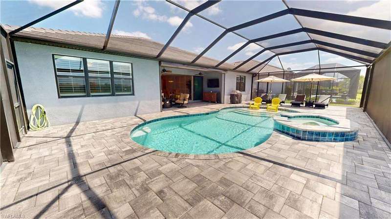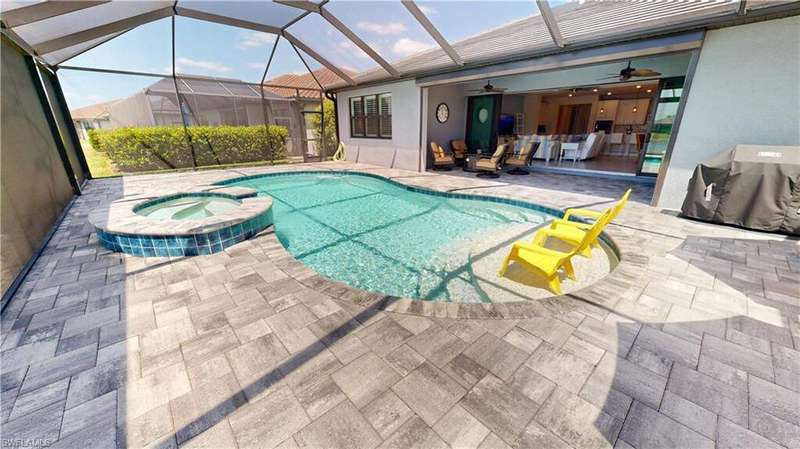 Del Webb Naples, Exceptionally Optioned "Stardom" Model Estate/Echelon Series Home w/Heated Custom Pool & Spa, Impact Windows & Doors, on Premium Water Lot, Stunning Lake Views, Stone Front Elevation, 2318 Sq.Ft. 2815 Total Sq.Ft. 2 Bedrooms, Den, 2 Full Baths, 1 Half Bath, 20' x 20'1" 2 Car Garage with additional 11'2" x 14'8" Garage Storage Area Perfect for Golf Cart or Workshop. GOLF MEMBERSHIP INCLUDED. Options; Heated Pool & Spa w/Saltwater System, Panoramic Rear Screen Enclosure, Impact Zero Corner Sliders, Whole House Impact Glass, Walk-In Shower at Master Bath, Shower ILO Tub Bath 2, Gourmet Kitchen Option, SS Kitchen Aid Appliances & Exhaust Hood, 42" Kitchen Cabinets w/Crown/Convenience Pckg/Soft-Close/Rollout Trays, Quartz Tops, Tile Backsplash, 20" Porcelain Tiles on Diagonal Throughout, 8' Interior Doors, Glass French Doors at Den, Finished Laundry Rm w/Utility Sink, Epoxied Garage Floor, Overhead Storage. Too Many Options to List. Property Complimented by Oasis Club Resort Style Amenity Center, Resort Pool/Lap Pool/Jacuzzi, Fitness Center, 12 Pickleball Courts/Tennis Courts/Bocce Courts, Hall, Golf Sim, Movement Rm, Activities Director. Championship Golf Course, Pro Shop. "Come Experience the Beauty that is Ave Maria"