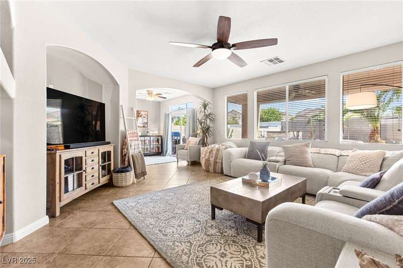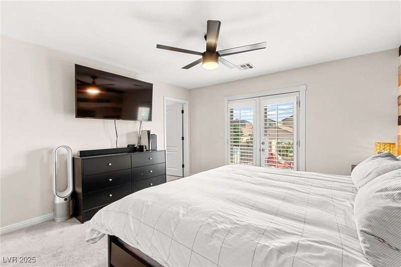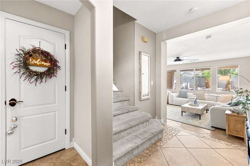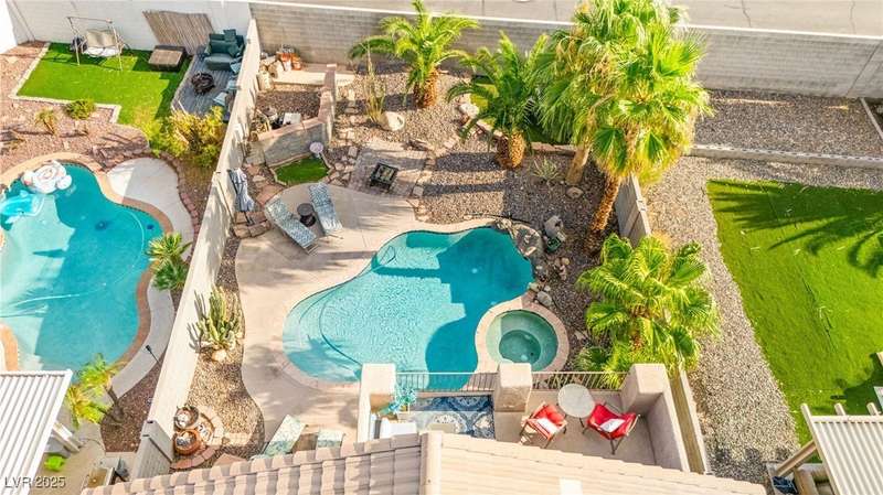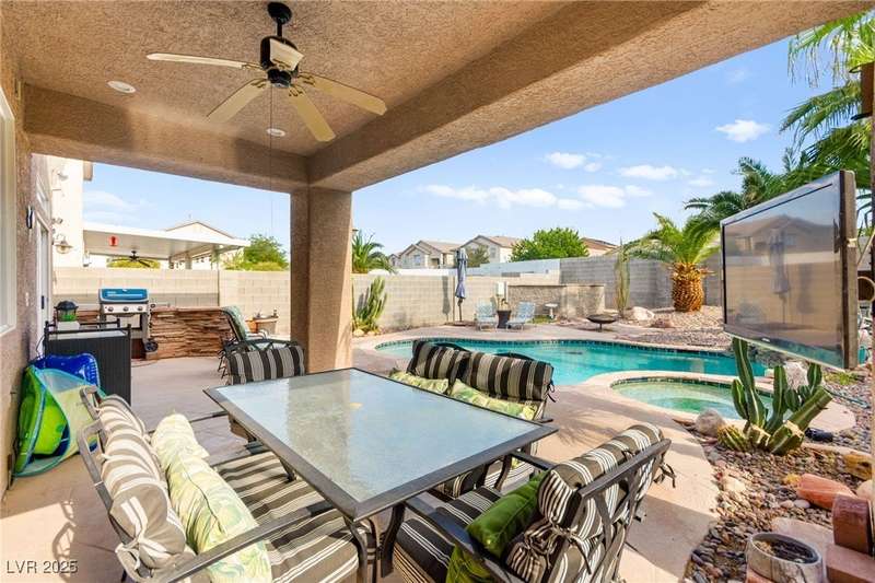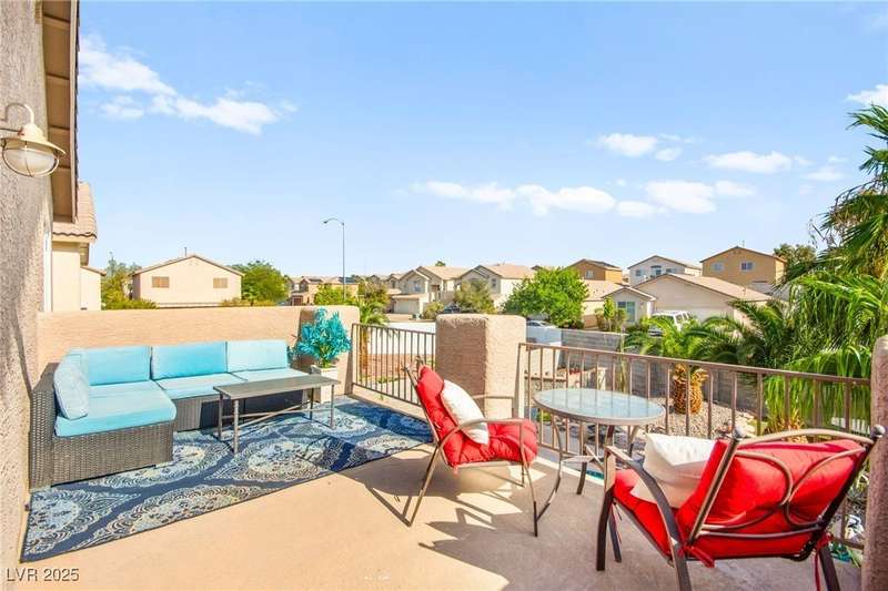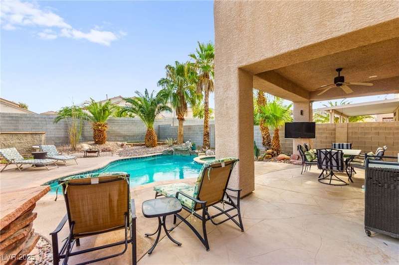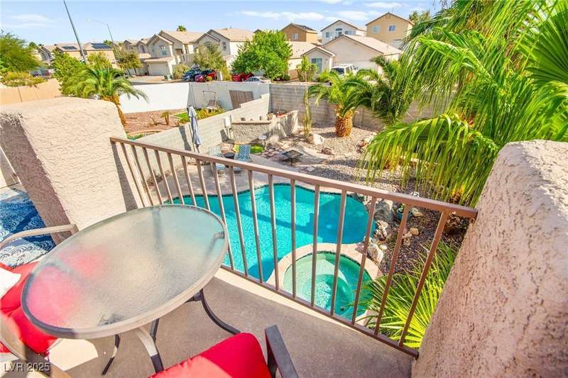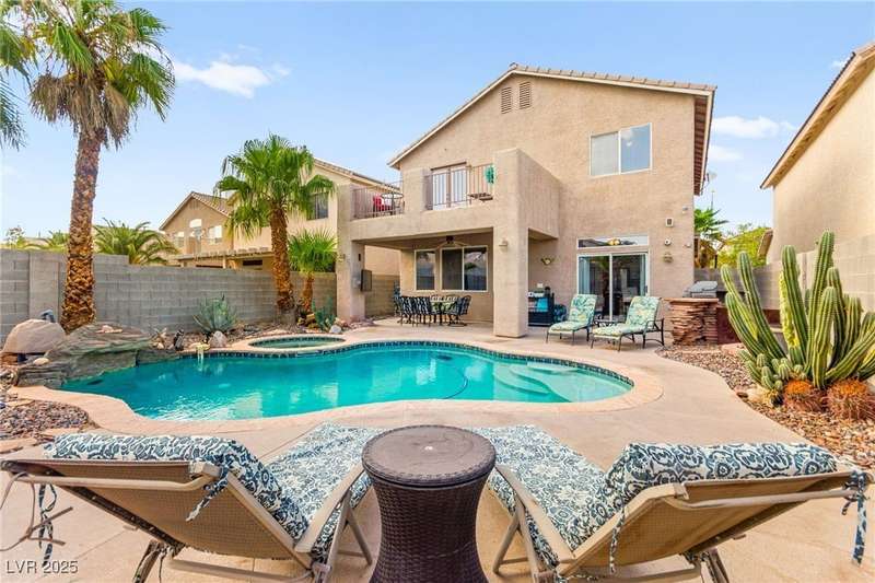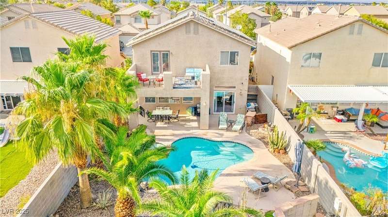 Located on a deep lot with no rear neighbors in the desirable Canyon Trails community, this bright and airy home offers the perfect mix of comfort, privacy, and upgrades. The resort-style backyard includes a pool, spa with waterfall, built-in BBQ, and covered patio, surrounded by low-maintenance desert landscaping. Inside, natural light flows through open living spaces. The updated kitchen features granite counters, custom backsplash, stainless steel appliances, a glass double-door pantry, and a breakfast bar. Upstairs, the owner’s suite includes a custom walk-in closet, modern ensuite bath, and French doors to a private balcony with mountain views. All bedrooms have ceiling fans, and the home’s paid-off solar panels help reduce energy costs. Conveniently located near Durango Station, Wet N Wild, shopping, dining, and freeway access—this home offers privacy, style, and everyday convenience. Don’t miss your chance to make it yours!