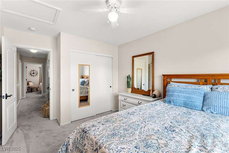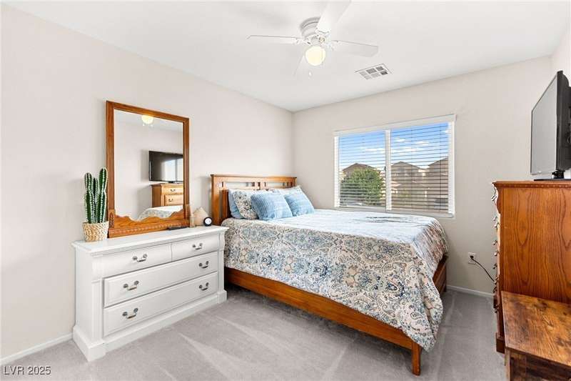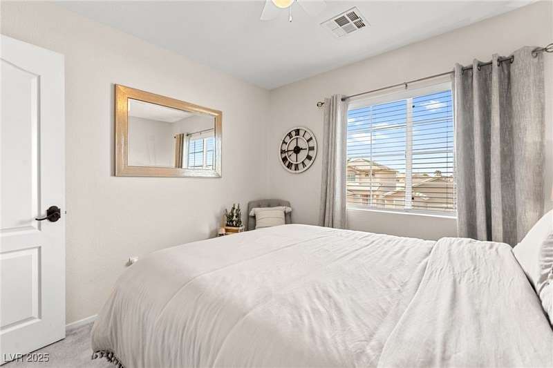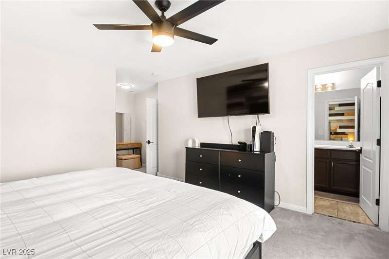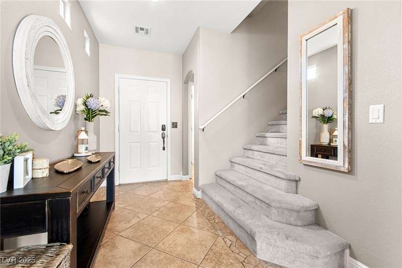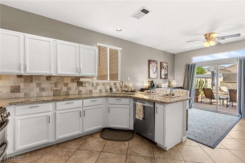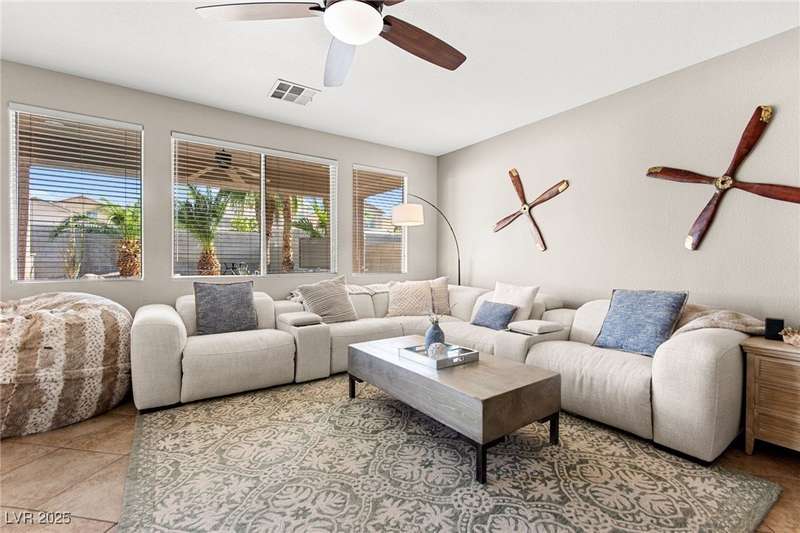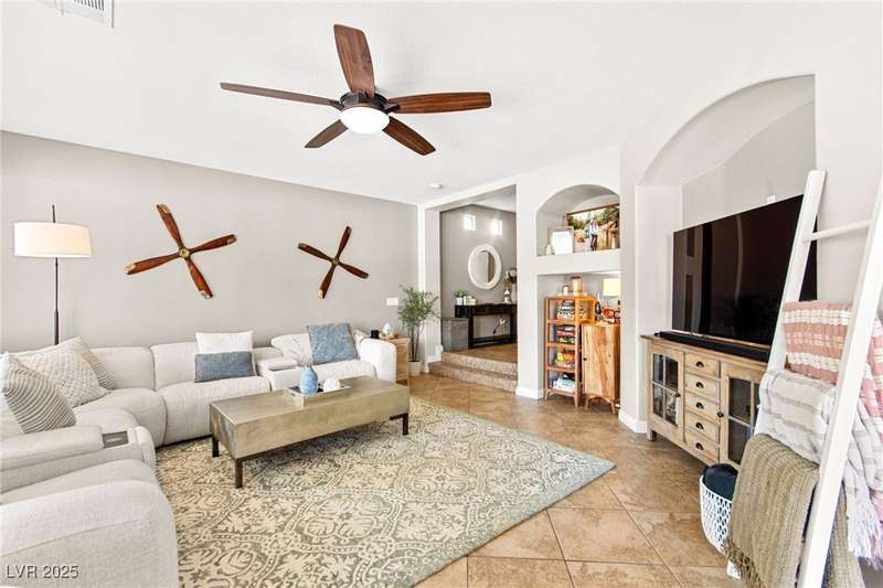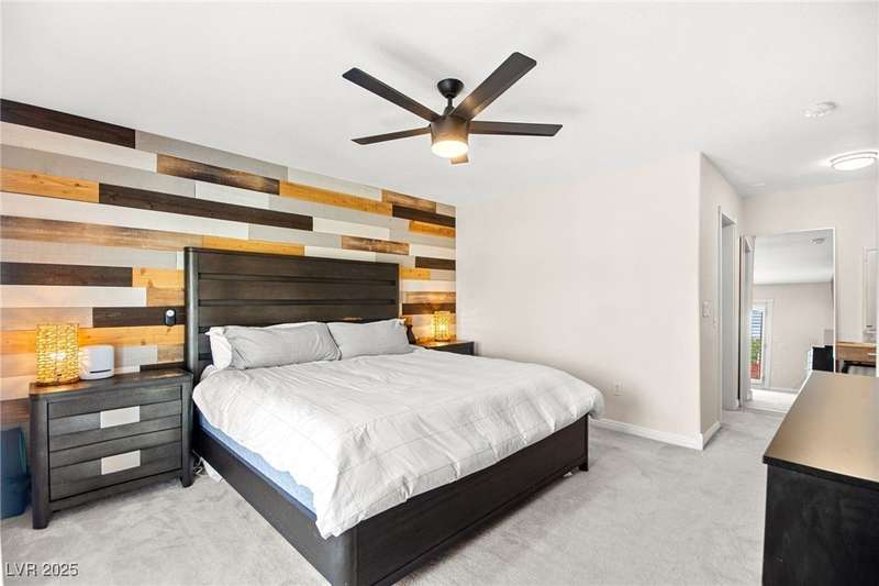 Located on a deep lot with no rear neighbors in the desirable Canyon Trails community, this bright and airy home offers the perfect mix of comfort, privacy, and upgrades. The resort-style backyard includes a pool, spa with waterfall, built-in BBQ, and covered patio, surrounded by low-maintenance desert landscaping. Inside, natural light flows through open living spaces. The updated kitchen features granite counters, custom backsplash, stainless steel appliances, a glass double-door pantry, and a breakfast bar. Upstairs, the owner’s suite includes a custom walk-in closet, modern ensuite bath, and French doors to a private balcony with mountain views. All bedrooms have ceiling fans, and the home’s paid-off solar panels help reduce energy costs. Conveniently located near Durango Station, Wet N Wild, shopping, dining, and freeway access—this home offers privacy, style, and everyday convenience. Don’t miss your chance to make it yours!