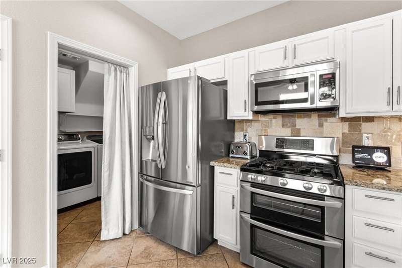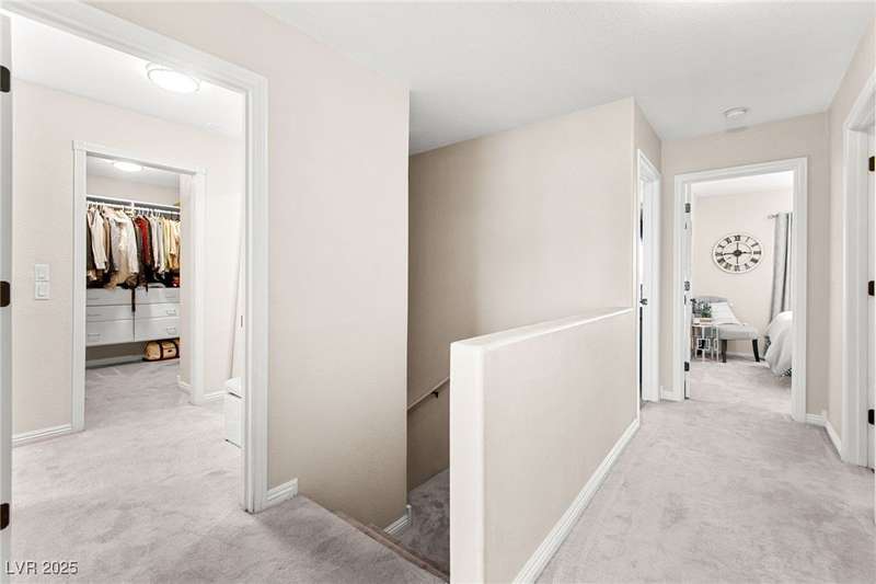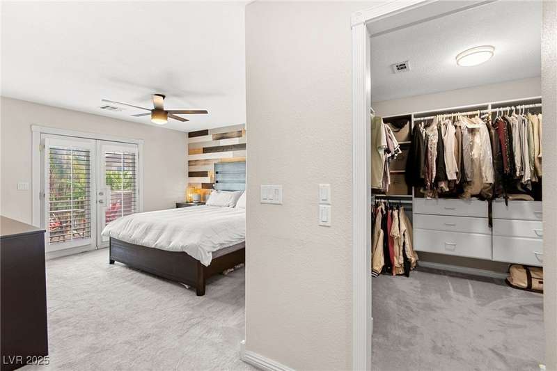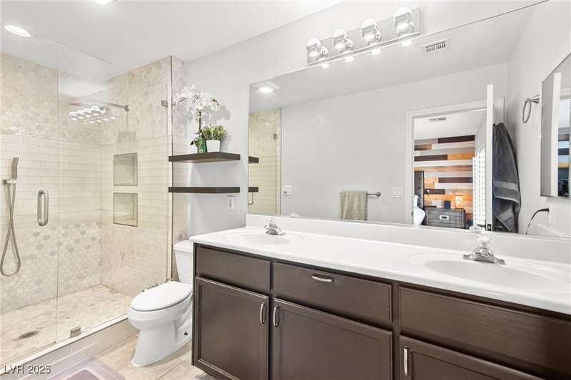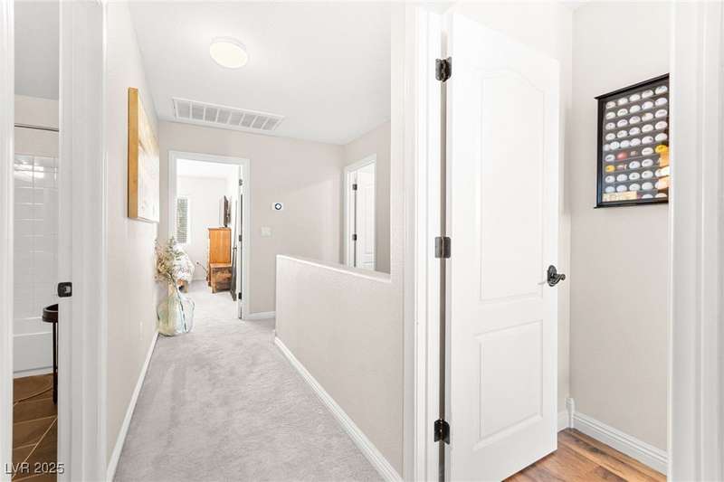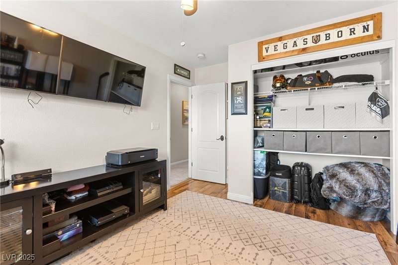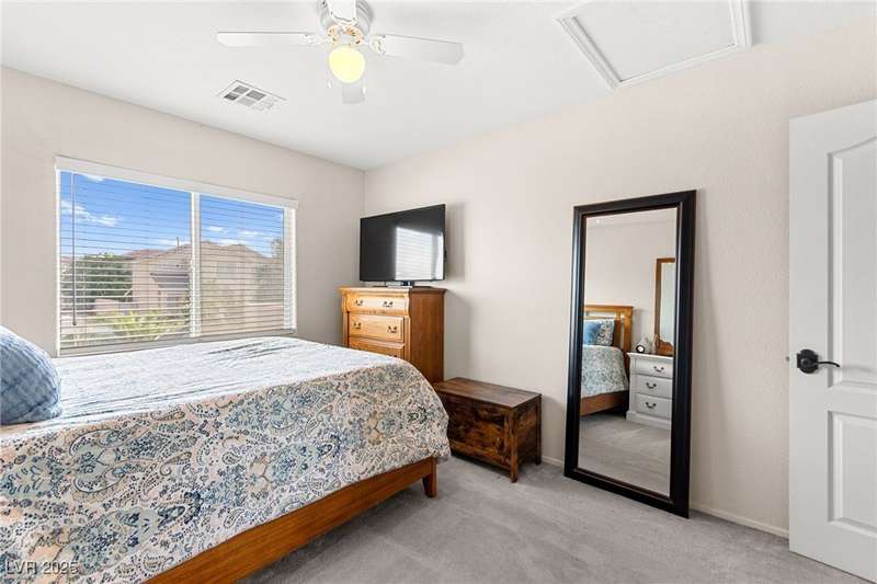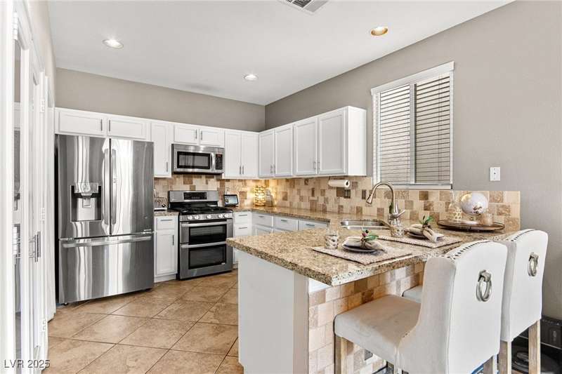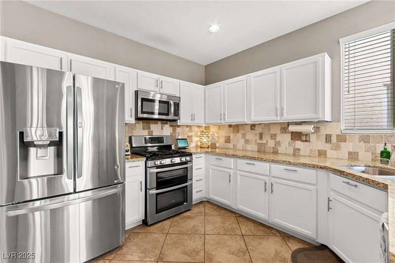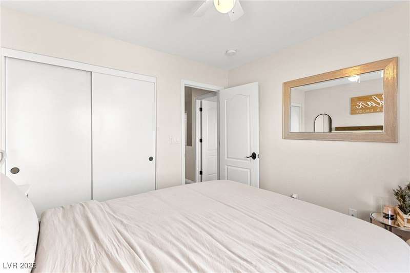 Located on a deep lot with no rear neighbors in the desirable Canyon Trails community, this bright and airy home offers the perfect mix of comfort, privacy, and upgrades. The resort-style backyard includes a pool, spa with waterfall, built-in BBQ, and covered patio, surrounded by low-maintenance desert landscaping. Inside, natural light flows through open living spaces. The updated kitchen features granite counters, custom backsplash, stainless steel appliances, a glass double-door pantry, and a breakfast bar. Upstairs, the owner’s suite includes a custom walk-in closet, modern ensuite bath, and French doors to a private balcony with mountain views. All bedrooms have ceiling fans, and the home’s paid-off solar panels help reduce energy costs. Conveniently located near Durango Station, Wet N Wild, shopping, dining, and freeway access—this home offers privacy, style, and everyday convenience. Don’t miss your chance to make it yours!
