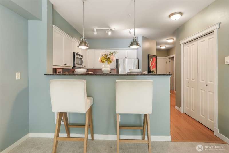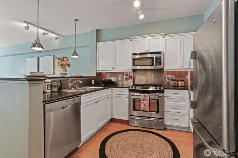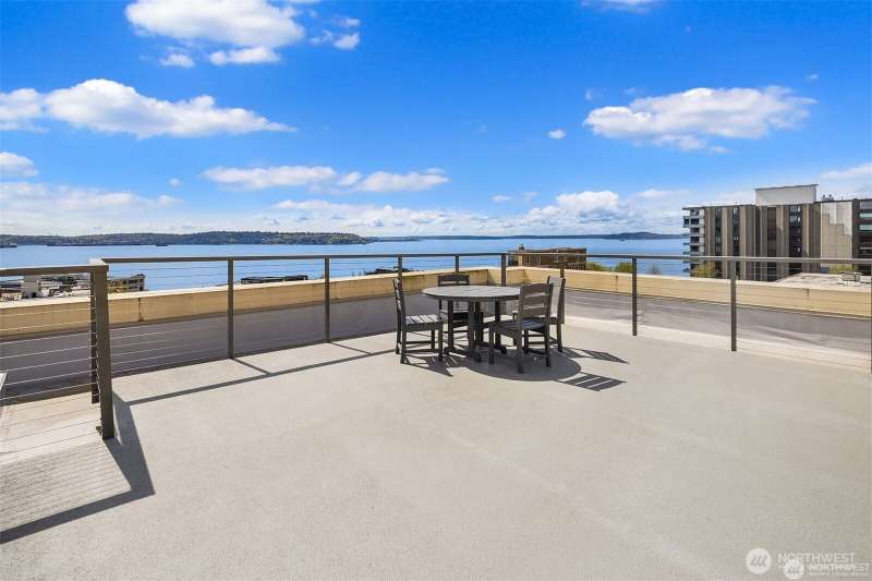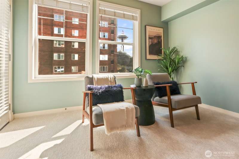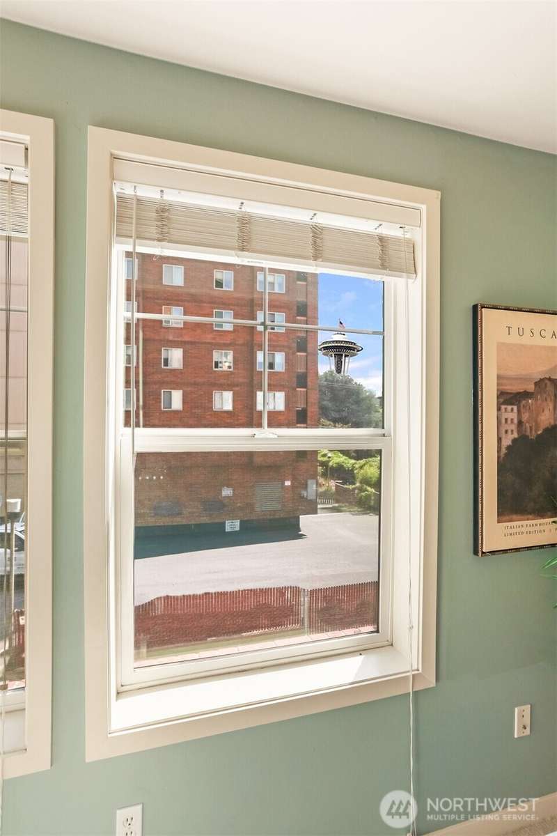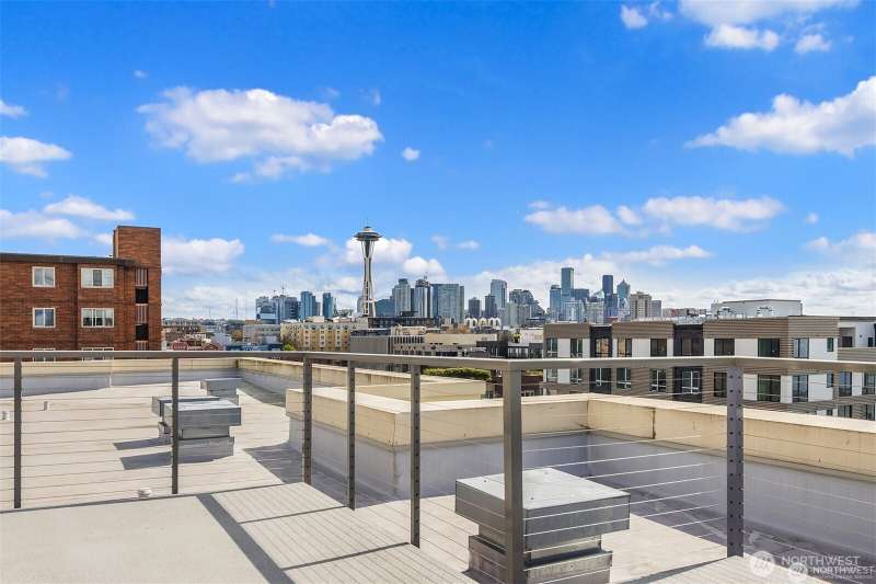 Say hello to this stylish one bedroom condo with a view of The Space Needle. This light, bright and affordable unit is located on lower Queen Anne where you'll enjoy the walkability of the neigborhood with transit, entertainment, shopping and more at your doorstep. Walk to events at The Seattle Center. Lots of updates - carpet, bamboo flooring, appliances, hot water heater. Washer/dryer in the unit. Your own private deck to sip your morning coffee or your evening cocktail. One parking spot and extra storage space in the secure garage. Amazing rooftop deck for hanging out and enjoying the massive water and city views. Welcome Home!