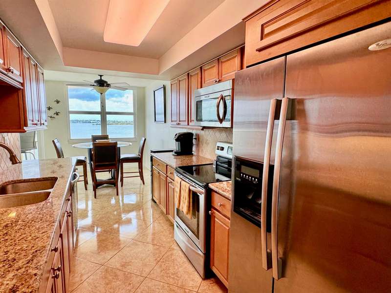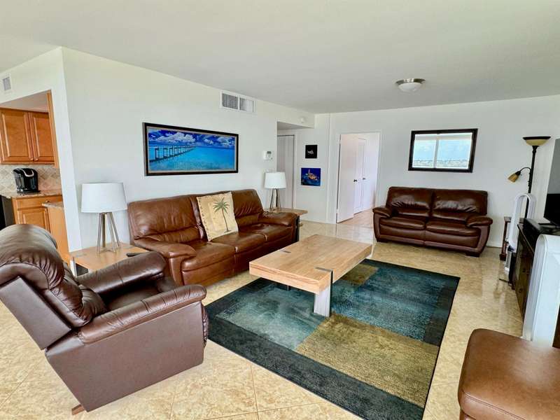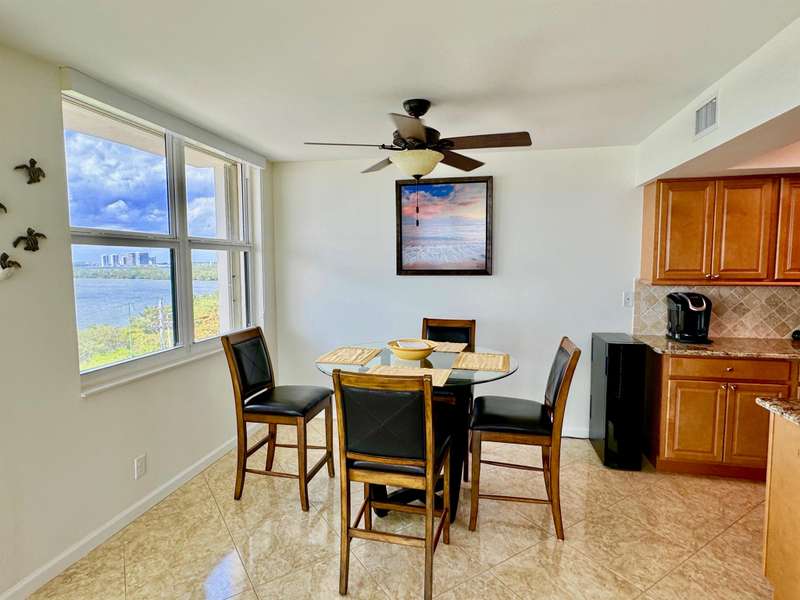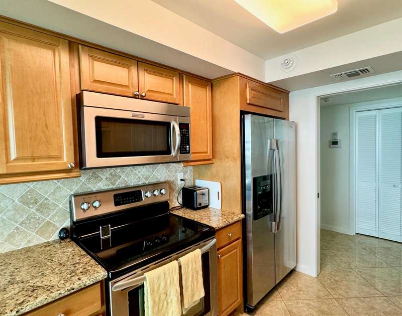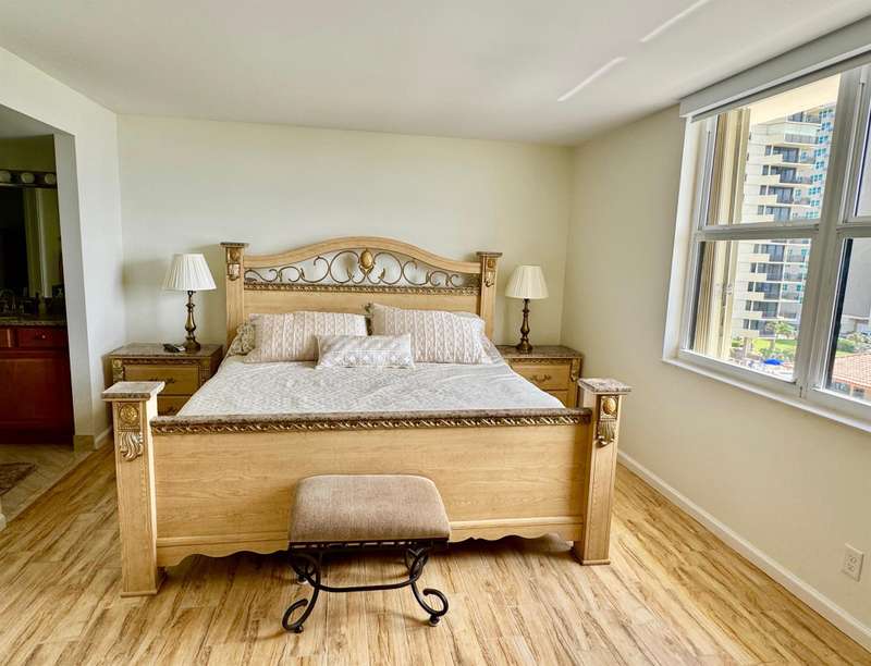 Lovely Season 2026 5th floor corner unit w panoramic Intracoastal & sunset views, & the reflection of city lights across the wide waterway. Monthly cleaning service included. ABSOLUTELY NO SMOKING ANYWHERE. This remodeled condo includes a split BR floor plan, updated kitchen w/granite countertop, stainless steel appliances, double door refrigerator & custom cabinetry. Electric shades. Both bedrooms have adjustable bed, walk-in closet, tv, & water view. Separate dining area with great views. 2 parking spaces - B5C covered & #29 open assigned. Shared free laundry on each floor, adjacent to unit. Amenities include a heated pool between 2 Towers, residents clubhouse w/party catering facilities, sauna, fitness area + BBQ's. Enjoy direct beach access thru private beach walkover.