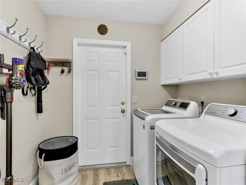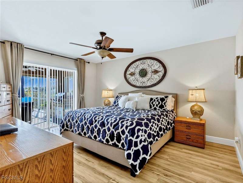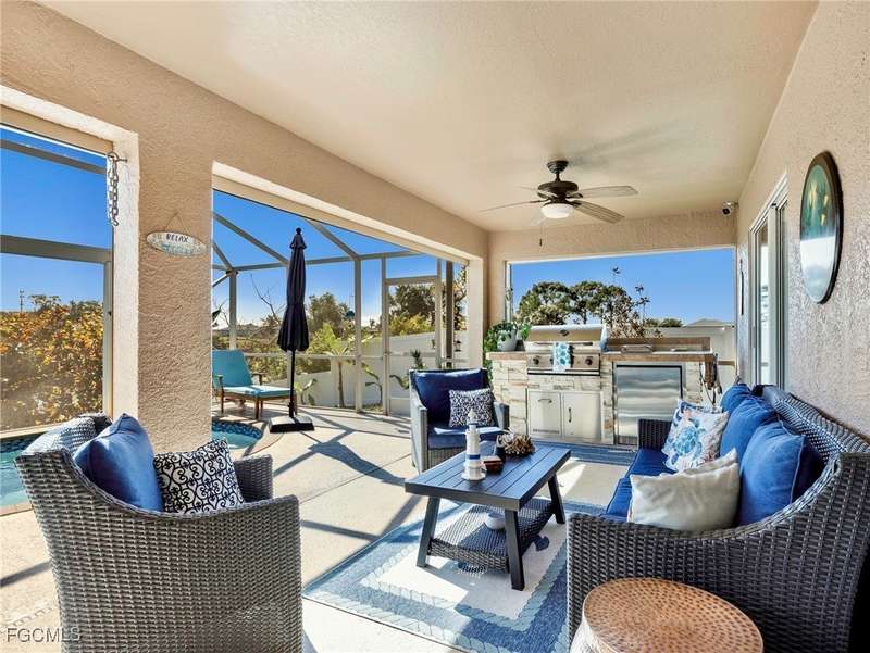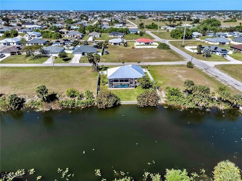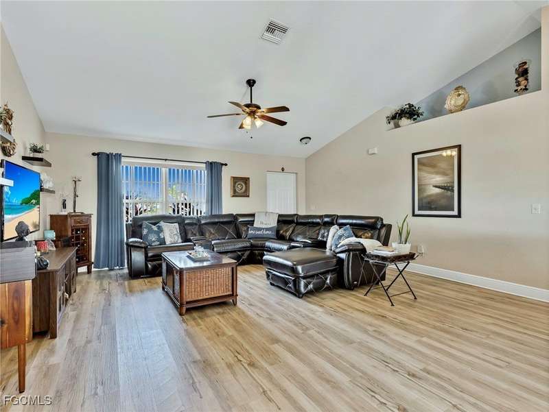 Situated along a waterfront canal, this impressive 4-bedroom, 2-bath saltwater pool home is move-in ready. The residence features an open, bright layout with vaulted ceilings, new flooring throughout the main living areas, and tile in the bathrooms. Bedrooms are split for privacy, and both bathrooms have been updated. The open floor plan provides ample space for gatherings and family activities. The kitchen includes granite countertops, a center island with designer pendant lighting, newer Samsung stainless steel appliances, and overhead LED lighting to accommodate culinary enthusiasts. Outside, a landscaped tropical setting offers mature avocado, mango, and banana trees. The spacious lanai and "picture frame" screen at the water's edge create a tranquil environment beside the heated saltwater pool, which features an auto-pilot system for low-maintenance upkeep. This outdoor area is ideal for entertaining and is pre-wired for an outdoor television and kitchen. Additional amenities include lush landscaping with a privacy fence and 80 feet of waterfront views as well as an outdoor shower. Recent updates include a new metal roof (2023), new water heater (2022), new outdoor fence (2023), a fully updated well system (2022), and seamless gutters around the entire house. The property is equipped with a whole-house water softener and filtration system (replaced in 2022), storm protection shutters, Fabric-Tech Storm Smart electric shutters poolside, and a garage with built-in sink, countertops, cabinets, an additional stove, refrigerator, and Tesla/RV charging station. Home automation allows for app control of the A/C, alarm, and lighting systems. This home is ready for immediate occupancy. You are now HOME!