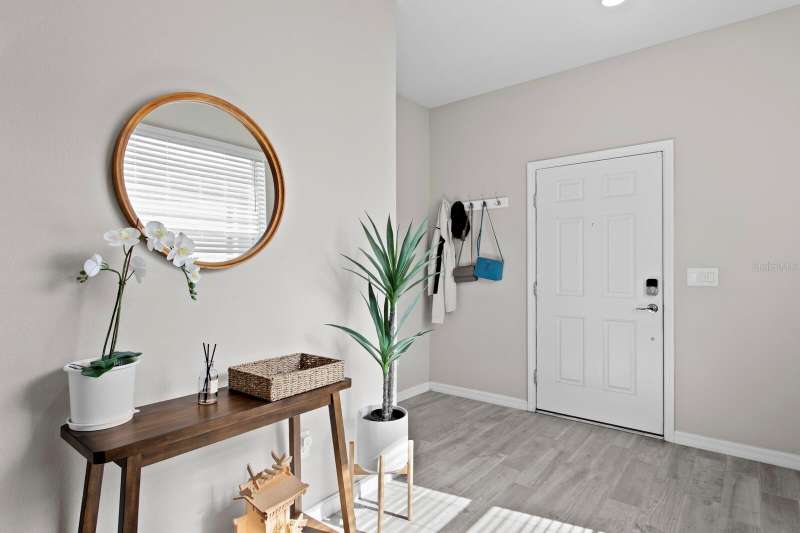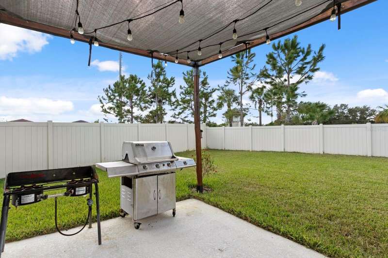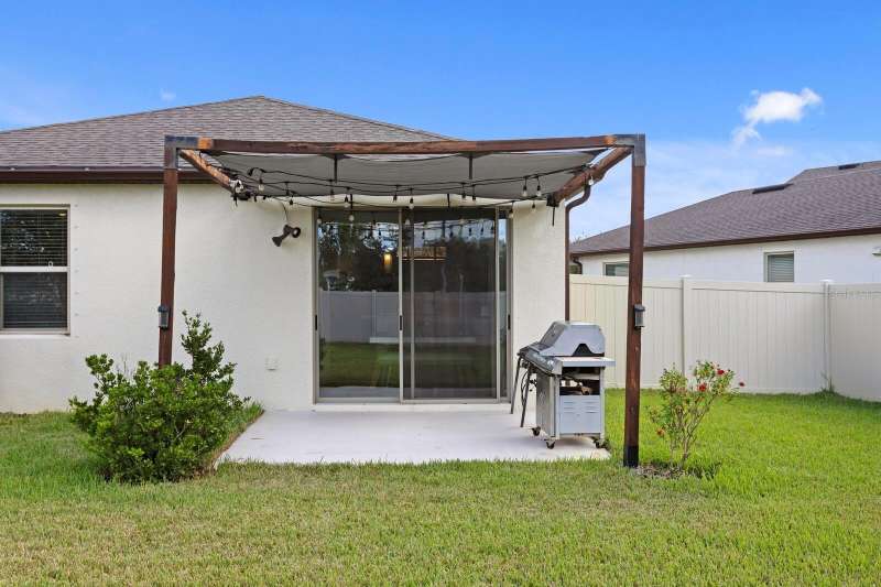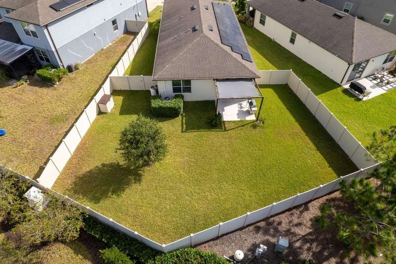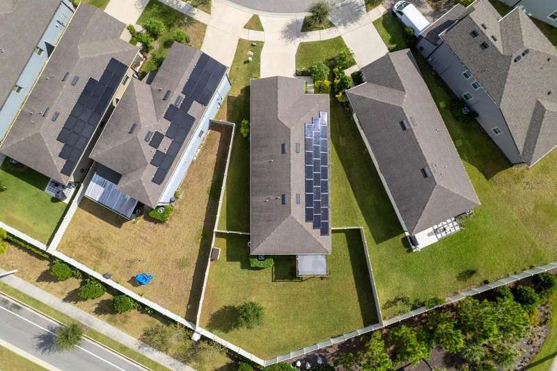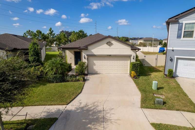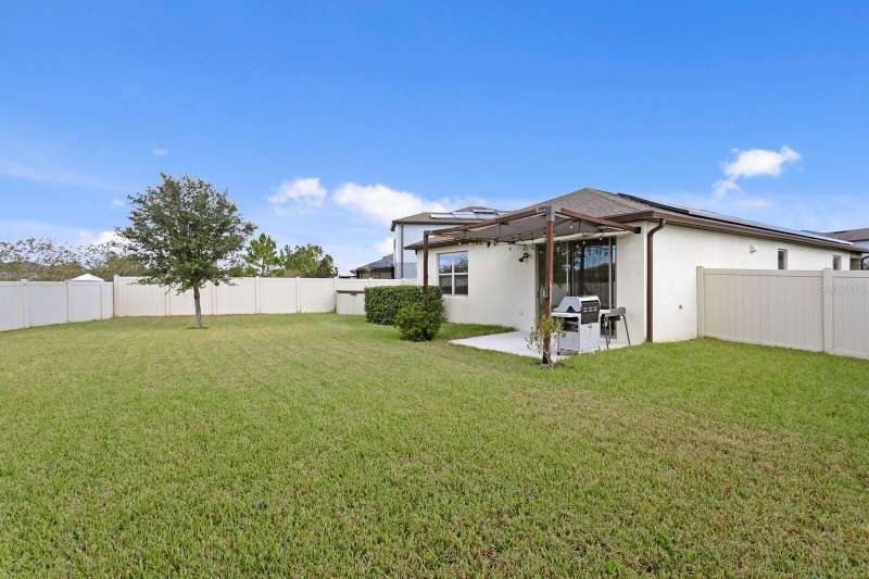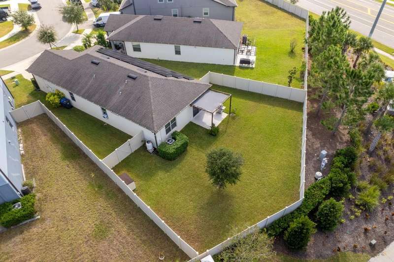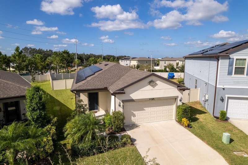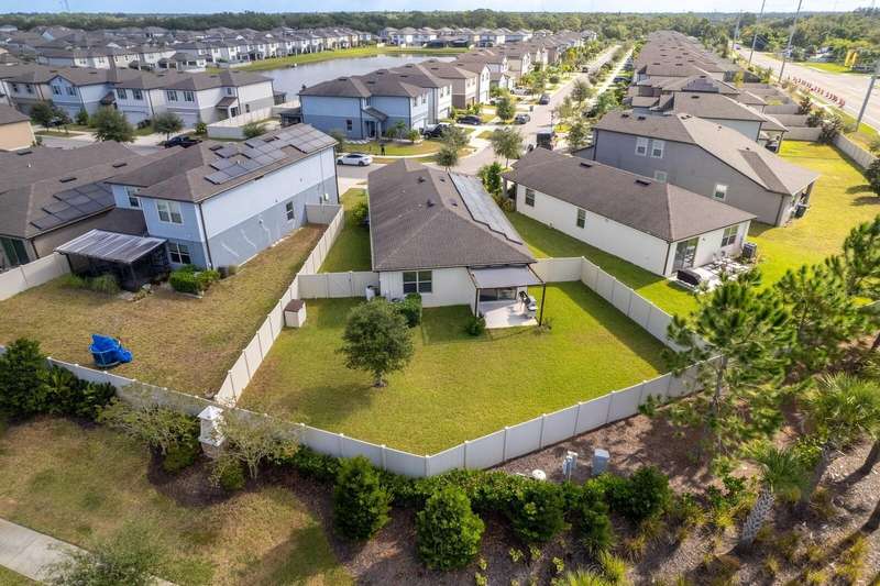 Act now to claim this fully upgraded, like-new 3-bedroom + den/flex, 2 bathroom home - featuring seller-included $35,000+ of solar panels - $0 electric bills and a “Tesla Powerwall battery which equals storm backup peace of mind, for unmatched energy efficiency, savings”. Situated on one of the largest lots in the community, fully fenced with a covered patio, this home is packed with premium upgrades and is priced to sell. From the moment you step through the 8-foot front door, you'll notice the 9'4" ceilings, elegant 8-foot interior doors, and a tray ceiling that adds a touch of sophistication to the family room. The upgraded center island kitchen stands out with Quartz countertops, 42" light-painted cabinetry, and stainless-steel appliances - including the refrigerator. Throughout the main living areas, you'll find wood-like tile flooring, with plush carpet in the bedrooms and den for added comfort. The owner's suite is a private retreat with a luxurious walk-in shower, while the laundry room includes both the washer and dryer - ready to go from day one. Additional features that make this home a standout include an Ecobee smart thermostat, a new A.O. Smith water softener (installed in 2022), a Square D whole-home surge protection system, an additional 240V outlet in the garage for EV connections, and pre-wired security camera locations, providing you with flexibility and peace of mind. Step outside to your covered patio overlooking a spacious backyard, perfect for relaxing, grilling, or entertaining guests. Enjoy the community's resort-style amenities - a sparkling pool, brand-new pickleball courts, playground, and a walking trail circling the scenic lake. Located just minutes from top-rated charter schools, AdventHealth Hospital, and plenty of shopping, dining, and entertainment, this home also offers easy access to I-75, US 301, and US 41, making your commute to downtown Tampa, MacDill AFB, Tampa International Airport, and the Gulf beaches effortless. Don't miss your opportunity to own this stunning, energy-efficient home - schedule your private showing today before it's gone!