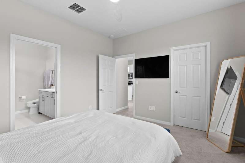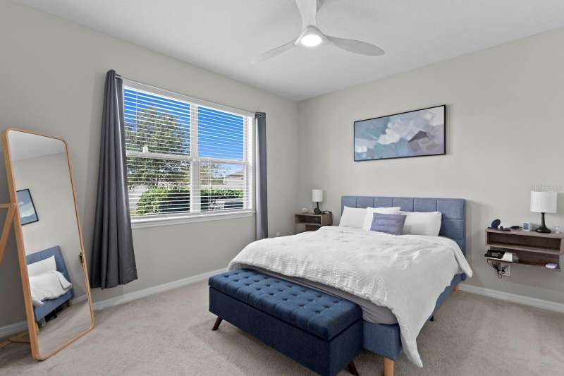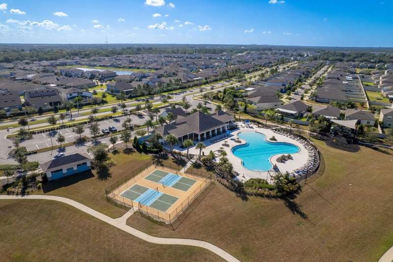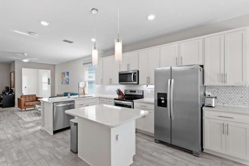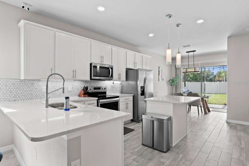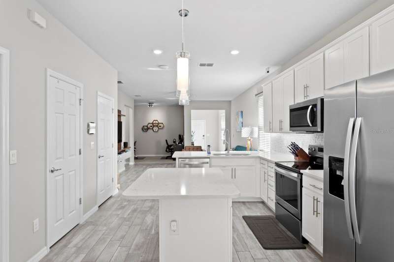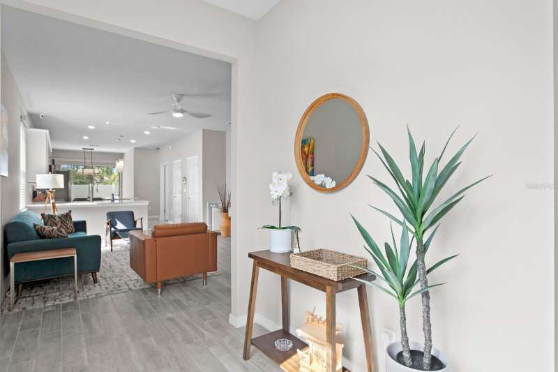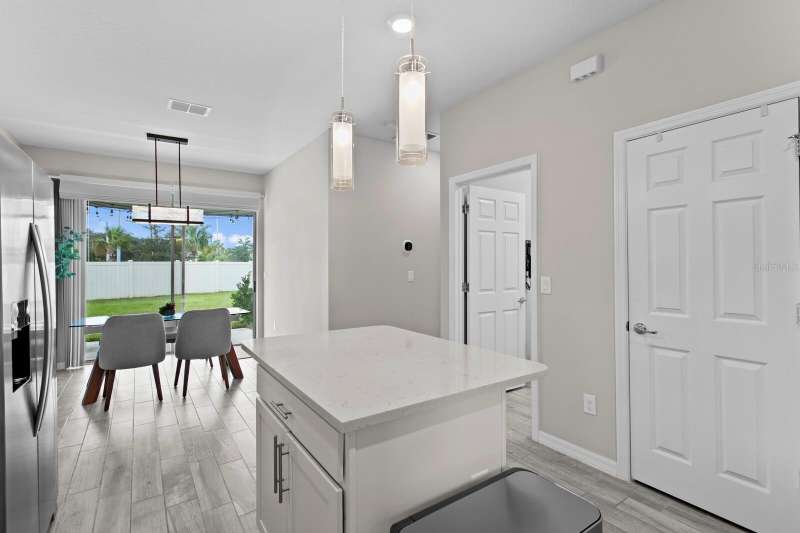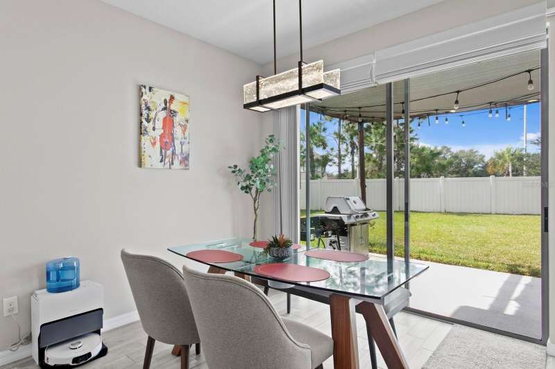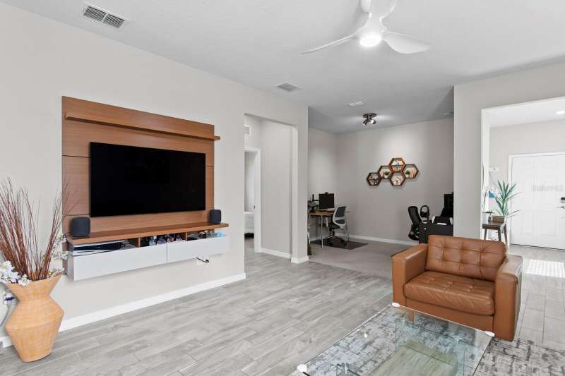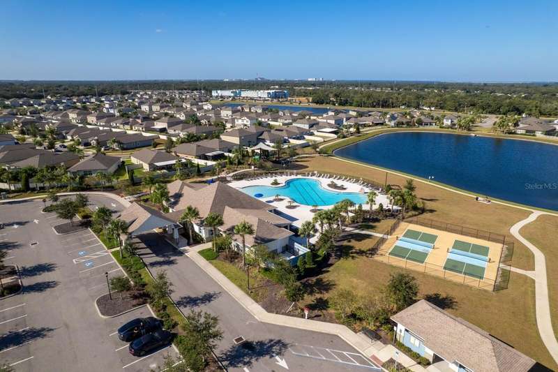 Act now to claim this fully upgraded, like-new 3-bedroom + den/flex, 2 bathroom home - featuring seller-included $35,000+ of solar panels - $0 electric bills and a “Tesla Powerwall battery which equals storm backup peace of mind, for unmatched energy efficiency, savings”. Situated on one of the largest lots in the community, fully fenced with a covered patio, this home is packed with premium upgrades and is priced to sell. From the moment you step through the 8-foot front door, you'll notice the 9'4" ceilings, elegant 8-foot interior doors, and a tray ceiling that adds a touch of sophistication to the family room. The upgraded center island kitchen stands out with Quartz countertops, 42" light-painted cabinetry, and stainless-steel appliances - including the refrigerator. Throughout the main living areas, you'll find wood-like tile flooring, with plush carpet in the bedrooms and den for added comfort. The owner's suite is a private retreat with a luxurious walk-in shower, while the laundry room includes both the washer and dryer - ready to go from day one. Additional features that make this home a standout include an Ecobee smart thermostat, a new A.O. Smith water softener (installed in 2022), a Square D whole-home surge protection system, an additional 240V outlet in the garage for EV connections, and pre-wired security camera locations, providing you with flexibility and peace of mind. Step outside to your covered patio overlooking a spacious backyard, perfect for relaxing, grilling, or entertaining guests. Enjoy the community's resort-style amenities - a sparkling pool, brand-new pickleball courts, playground, and a walking trail circling the scenic lake. Located just minutes from top-rated charter schools, AdventHealth Hospital, and plenty of shopping, dining, and entertainment, this home also offers easy access to I-75, US 301, and US 41, making your commute to downtown Tampa, MacDill AFB, Tampa International Airport, and the Gulf beaches effortless. Don't miss your opportunity to own this stunning, energy-efficient home - schedule your private showing today before it's gone!