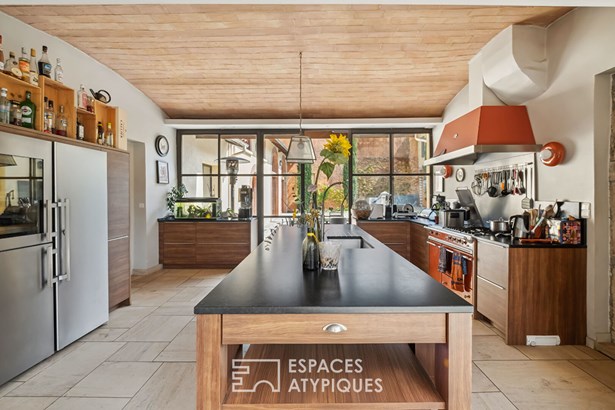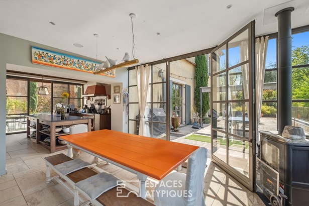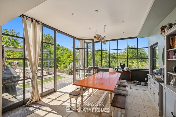 The entrance announces the unique character of the residence. The ground floor distributes a large office, a convivial kitchen bathed in light thanks to a southwest-facing glass roof, extended by a dining room opening onto the exterior. A double living room with a wood-burning fireplace and exposed beams, a laundry room, a wine cellar, as well as a bedroom overlooking the interior courtyard, in the orangery, enrich this first level. Upstairs, a staircase leads to six bedrooms, including a suite with a private bathroom, several shower rooms, an 11 sqm dressing room, and a fitted library. The authenticity of the old materials combines here with generous volumes, providing a warm and functional living environment.