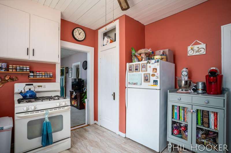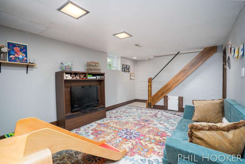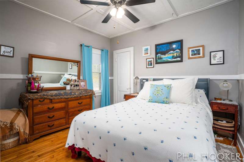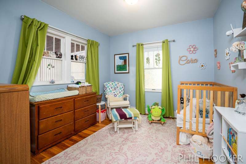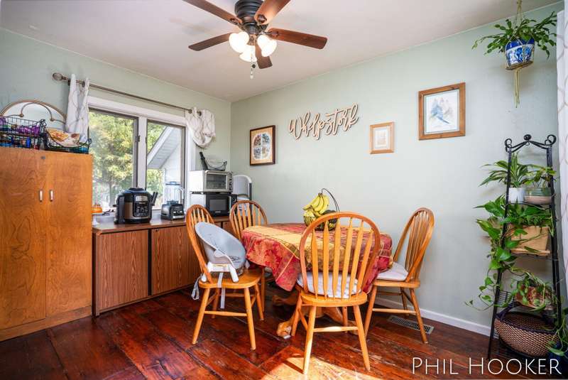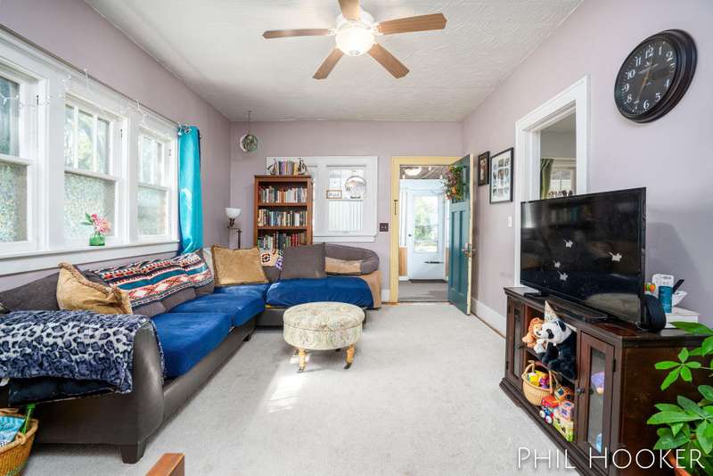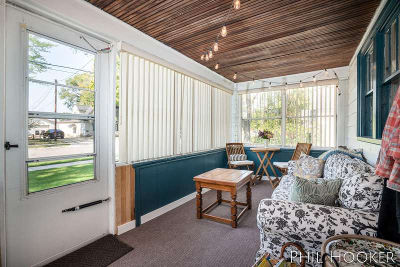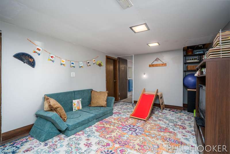 Cute Bungalow refreshed with a primary bedroom, second bedroom, living room - all with hardwood flooring under the rugs/remnants; then also a full bathroom with a new window, a dining room with wide plank wood flooring and a nice 3 season covered front porch. Basement has a comfortable family room, full bathroom, laundry closet and a reasonable size office; 4 new windows in basement that are 27.5' x 20'. 2 stall attached garage (use opener) with larger side yard and small red barn for storage. Updated Home Acres Park is just minutes away - huge set of play equipment, patio with free wifi, skate board park and open space!
