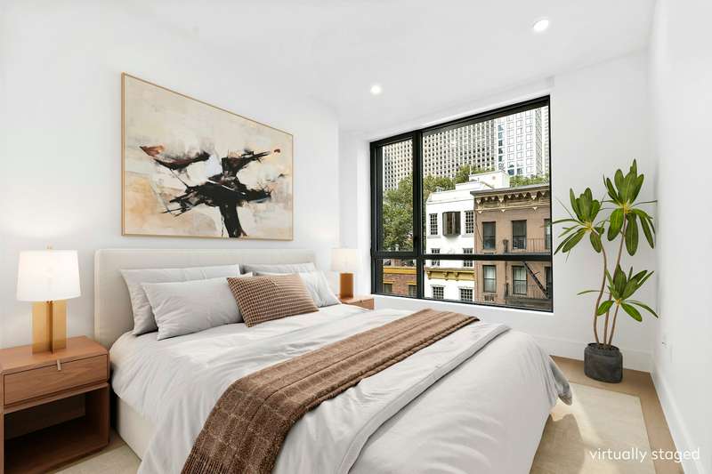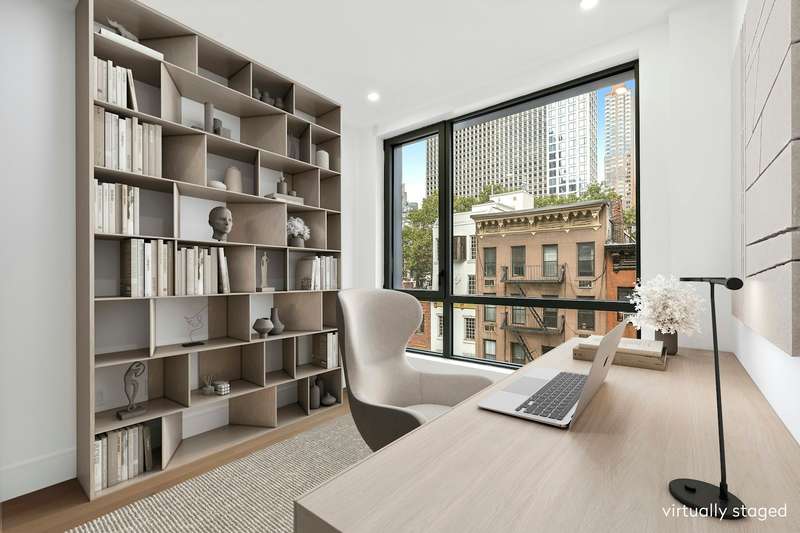 This majestic north and east facing primary suite includes an oversized window with skyline views and a walk-in closet with room for significant storage and dressing space. The beautifully appointed primary bathroom, with radiant heated floors, features North Pearl marble, a custom vanity and recessed medicine cabinet by BOTTEGA, and Hansgrohe chrome fixtures.