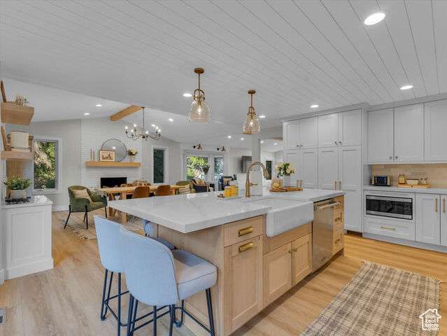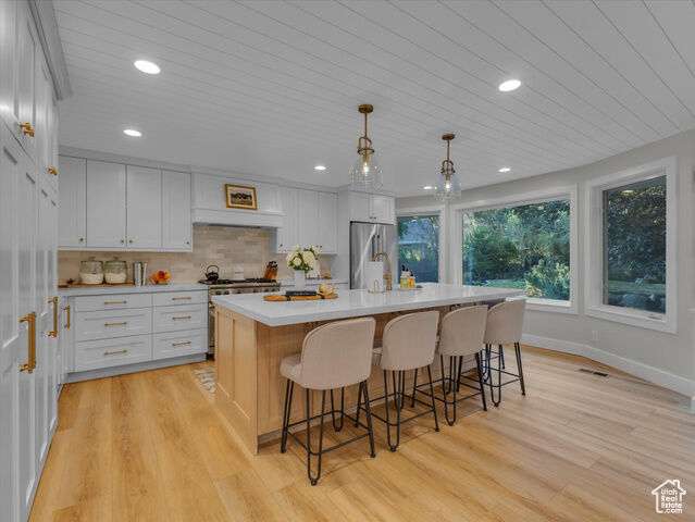 Fully remodeled home with stunning Bell Canyon views in an established neighborhood surrounded by mature pines and fruit trees. Large windows fill the vaulted great room with natural light, creating a warm and inviting space. Originally built as the builder's personal residence, the home offers exceptional quality and has been thoughtfully updated throughout. The home features custom cabinetry with a blend of white and white oak, complemented by a new kitchen with a large island, quartz countertops, tile backsplash, and high-end appliances. Each of the bathrooms is finished with designer tile and quartz countertops, while the primary suite includes a Euro-glass shower and a freestanding soaking tub. Built-in lockers add everyday function with a white oak bench detail. Additional updates include wide-plank oak-look flooring, new carpet, new doors, baseboards, and casing, plus fresh exterior paint that harmonizes beautifully with the brick and stone. The basement offers a built-in bar with a beverage fridge-perfect for entertaining. Outside, enjoy shady landscaping and close proximity to Granite Elementary, Bells Canyon, and Dimple Dell trailheads, with Little Cottonwood just five minutes away and Big Cottonwood ten minutes away-an ideal retreat for both everyday living and mountain adventure