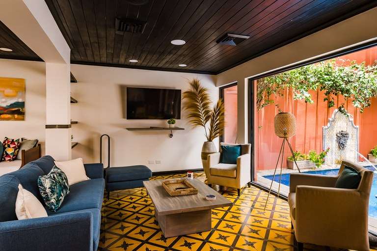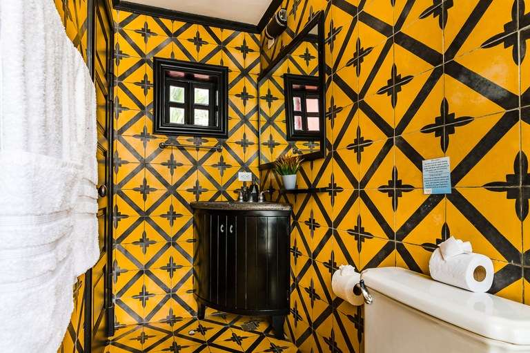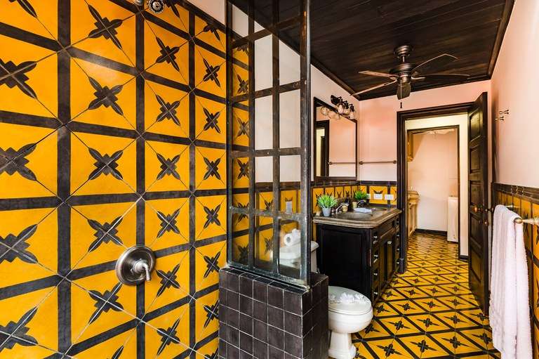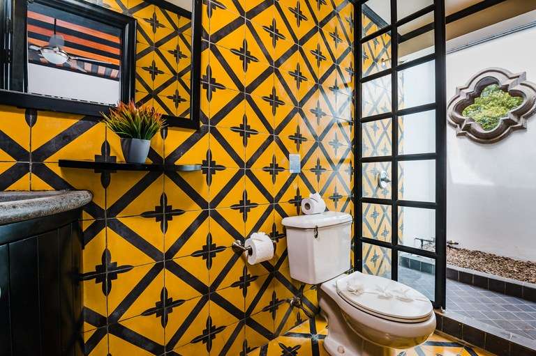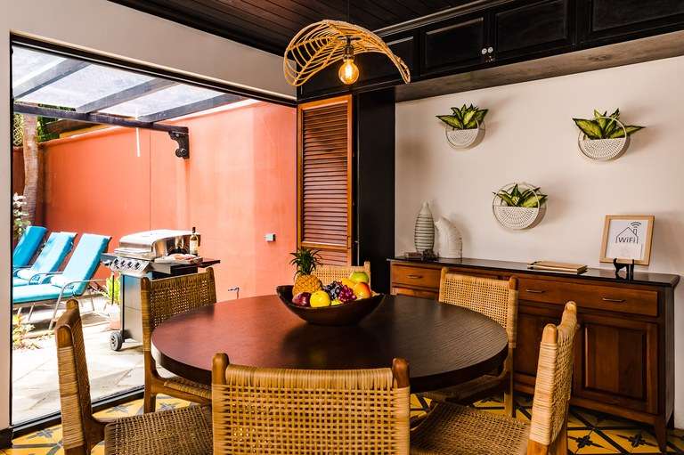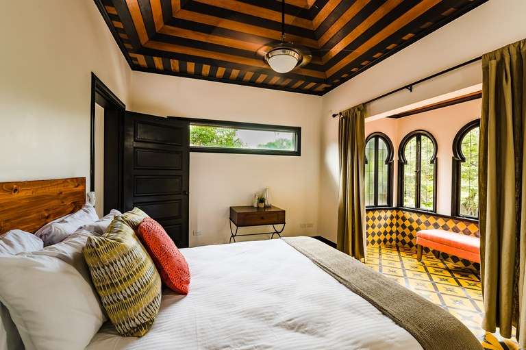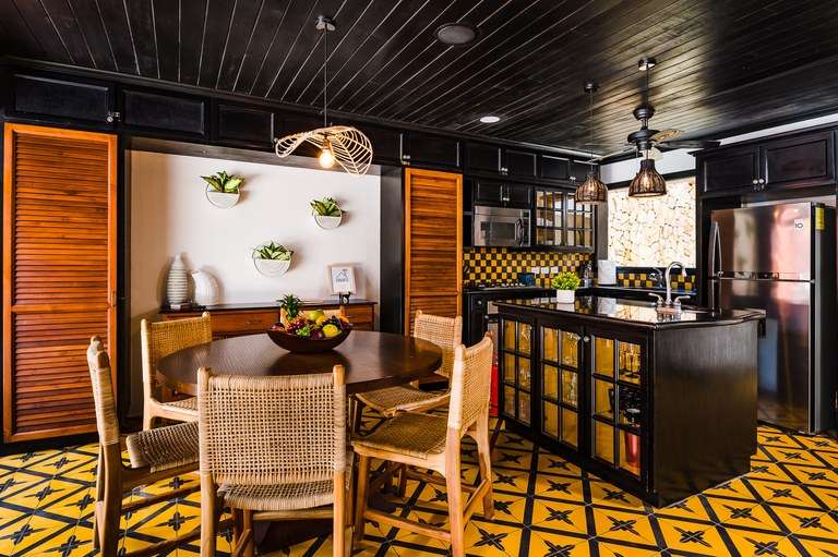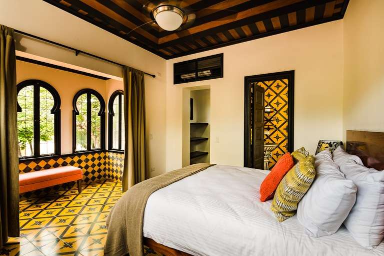 Designed with attention to detail, the home features hand-painted tile flooring throughout, arched Moorish-style windows, rich wood ceilings with exposed beams, and a warm color palette that captures the essence of tropical living. Two of the spacious bedrooms include king-size beds, while the third offers a cozy queen bed, all beautifully appointed and thoughtfully laid out for comfort.