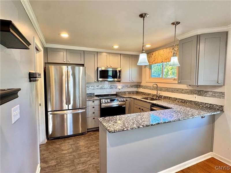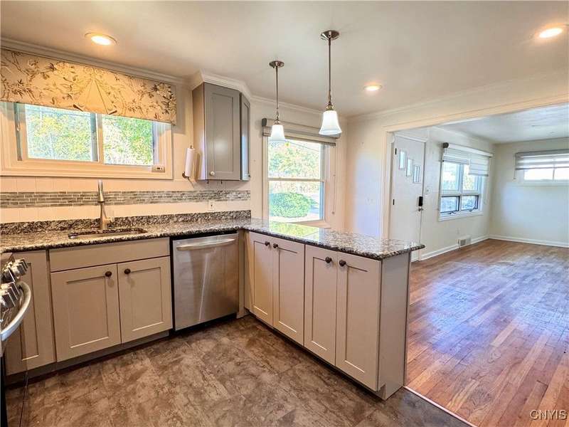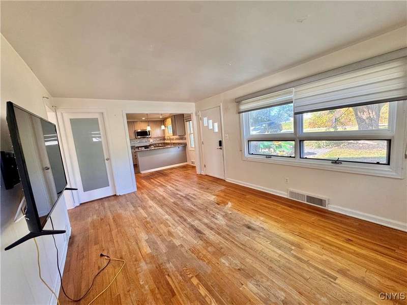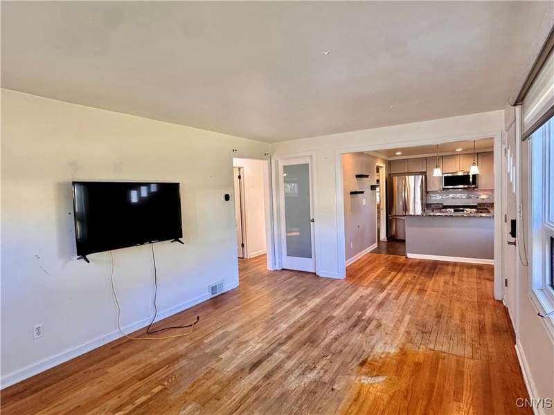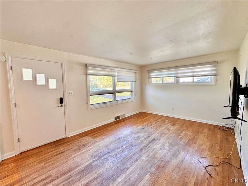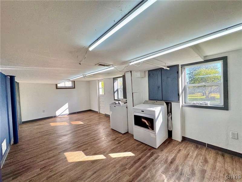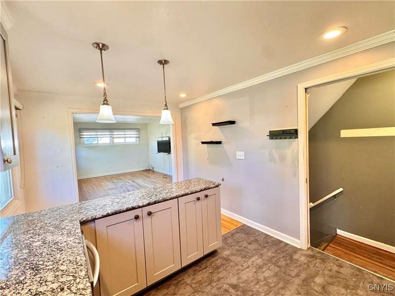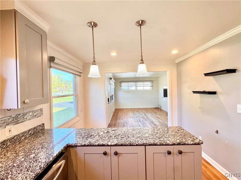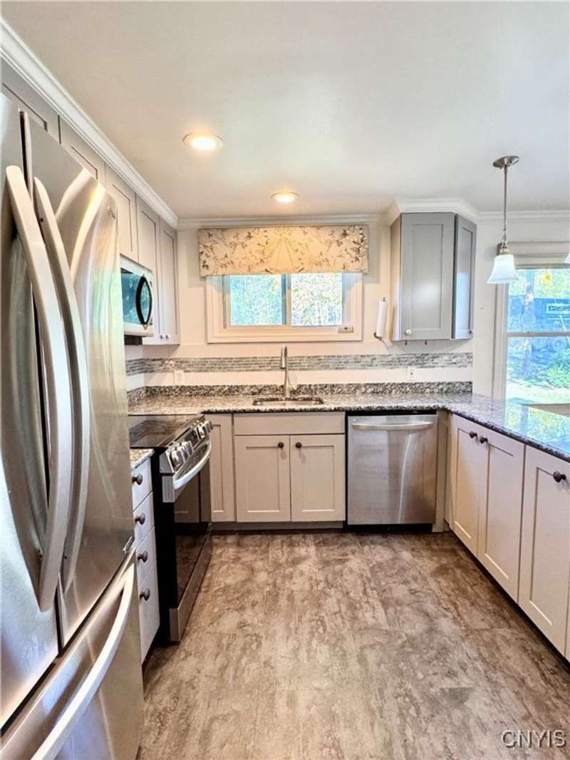 Welcome to this lovely 3-bedroom, 2-bathroom home situated on over 4.5 acres in Fleming, New York. Located just outside the Auburn city limits, you'll enjoy all the conveniences of the city without paying city property taxes.The home features an open-concept layout connecting the kitchen, dining, and living areas?perfect for modern living and entertaining. The kitchen is highlighted by beautiful granite countertops, adding both style and functionality. Two bedrooms and a full bathroom are conveniently located on the first floor, while the spacious upstairs bedroom offers additional storage space.The lower level provides even more flexibility with a full bathroom, a workshop area, and an extra finished room with a walkout to the backyard?ideal for a home office, guest space, or hobby area. A one-car attached garage adds convenience and practicality.Set on a generous lot with plenty of space to enjoy, this property combines comfort, functionality, and a great location just minutes from Auburn and the Finger Lakes region.