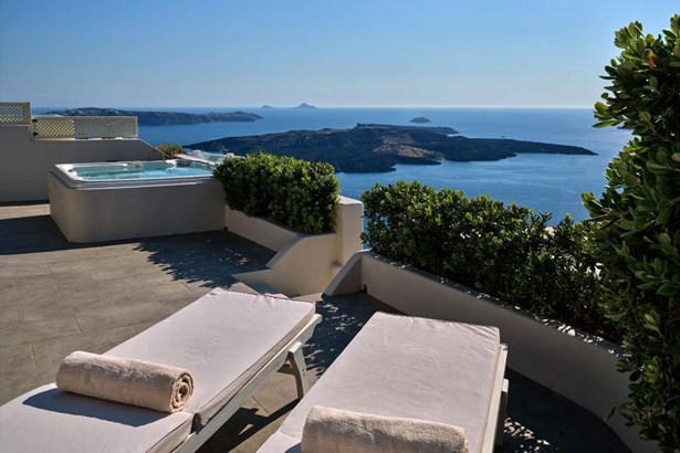 An expansive terrace oasis with breathtaking views, a 24 sqm shaded pergola, and a Jacuzzi—ideal for enjoying Santorini’s iconic sunsets.