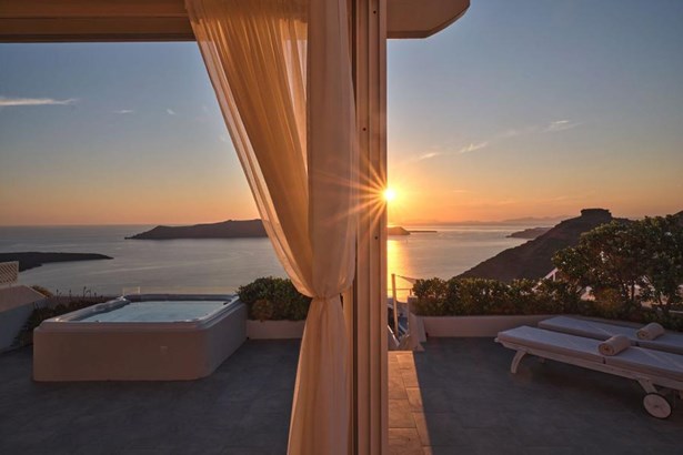 Perched on the cliffs with unobstructed Caldera views, this 170 sqm villa spans two levels: