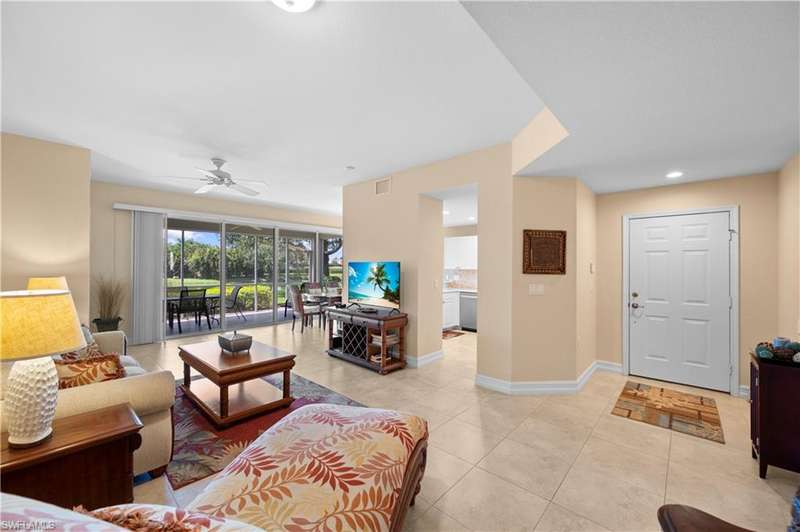 Loving Lely Resort! You will love the panoramic views of the lake and Mustang Golf Course from the large screened lanai. Highly desirable first floor 3 bedroom turnkey furnished condominium. Located across from the community pool and a short distance to the Lely Country Club. Tile floors throughout, newer furniture in the living room & dining room, and stainless steel appliances. ASCOT is a pristine neighborhood and the buildings have NEW TILE ROOFS. This condominium comes with a transferable membership to the Players Club and Spa for a nominal fee. The Player's Club features 3 resort pools with waterfalls, full-service dining with an indoor/outdoor bar, bocce courts, 13 Har-Tru tennis courts, and a full-service spa and fitness center. Lely Resort is home to 3 championship golf courses, with THE MUSTANG and THE FLAMINGO being public golf courses. Restaurants, Lowes, Publix, pharmacies, banks, gas stations, and other conveniences are nearby. AVAILABLE SPRING, SUMMER AND FALL IN 2026.