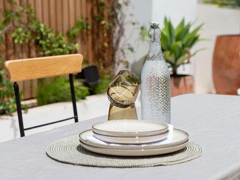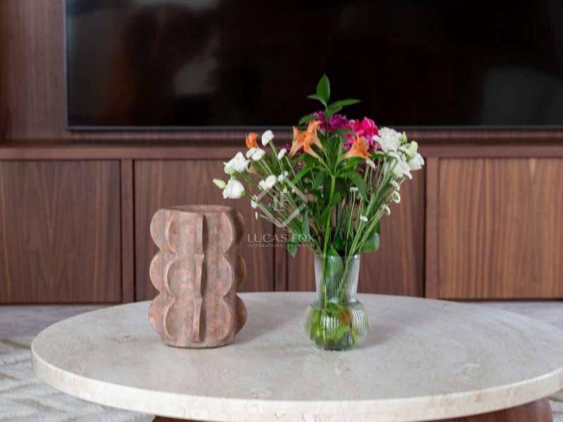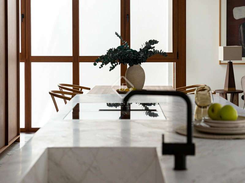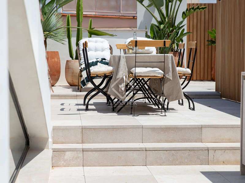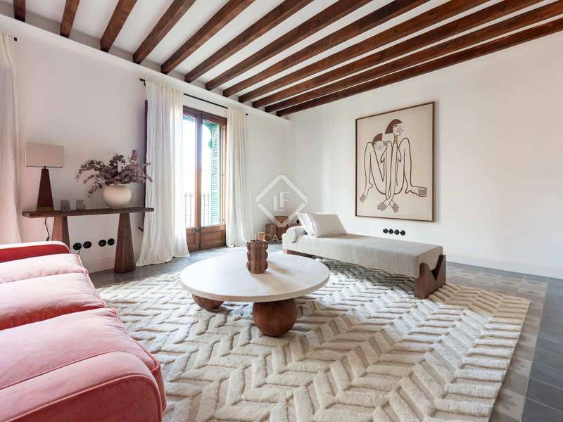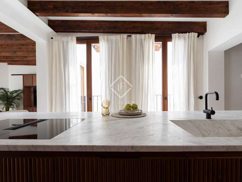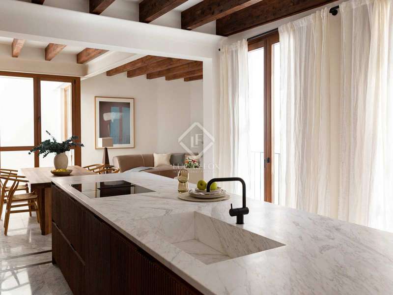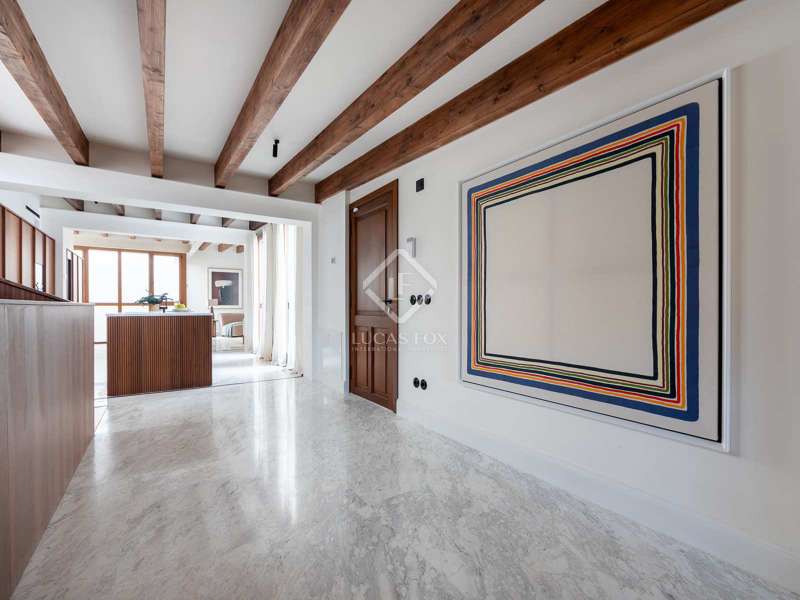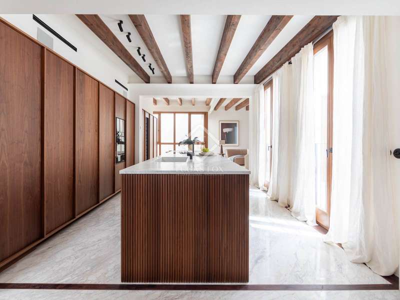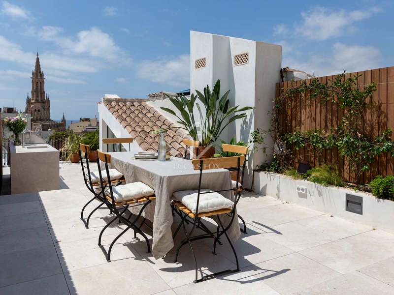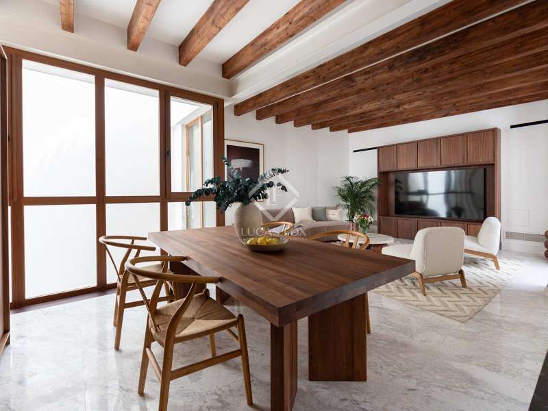 This exceptional 3-bedroom, 3-bathroom duplex occupies the top two floors of the building and boasts a sensational roof terrace with expansive views over the city’s rooftops. On the lower level, a spacious and light-filled living room with antique floor tiles and exposed wooden beams is situated at the front of the building, featuring two balconies that overlook the street. At the rear, you will find two generous bedrooms, each with en-suite bathrooms. The main bedroom offers windows facing the central patio, built-in wardrobes, and Mallorquin tile flooring, while the second bedroom includes glass-panelled doors to welcome light from the patio. Both bathrooms are luxuriously finished with Volakas marble and walnut wood, featuring walk-in showers and double vanities with integrated marble sinks. The upper level hosts an open-concept kitchen, dining, and living area that wraps around two sides of the central patio. Full-height windows facing the courtyard and a light well at the rear ensure this space is bathed in natural light. The sleek kitchen, finished in walnut wood with a marble-topped island and integrated sink, is equipped with high-end Gaggenau appliances, including a wine fridge. This level also includes a large third bedroom with a sloping ceiling, an en-suite shower room, and a storage room. Volakas marble floors with wood trim and exposed wooden beams run throughout this level, giving it a timeless, elegant appeal. From here, stairs lead up to a sunny 76 m² terrace offering panoramic views of Santa Eulalia church, the Cathedral, and Bellver Castle. Spread across varying levels, this terrace is the perfect place to soak up the sun on winter days and enjoy warm summer nights high above the city’s bustle. Please contact us for further information.