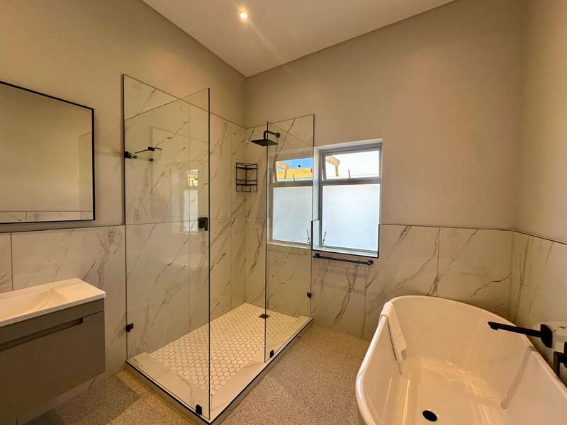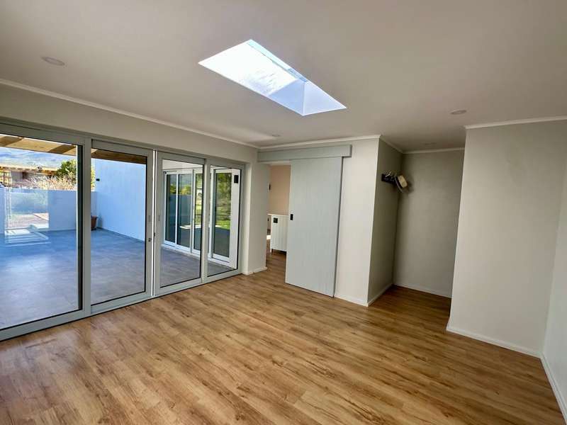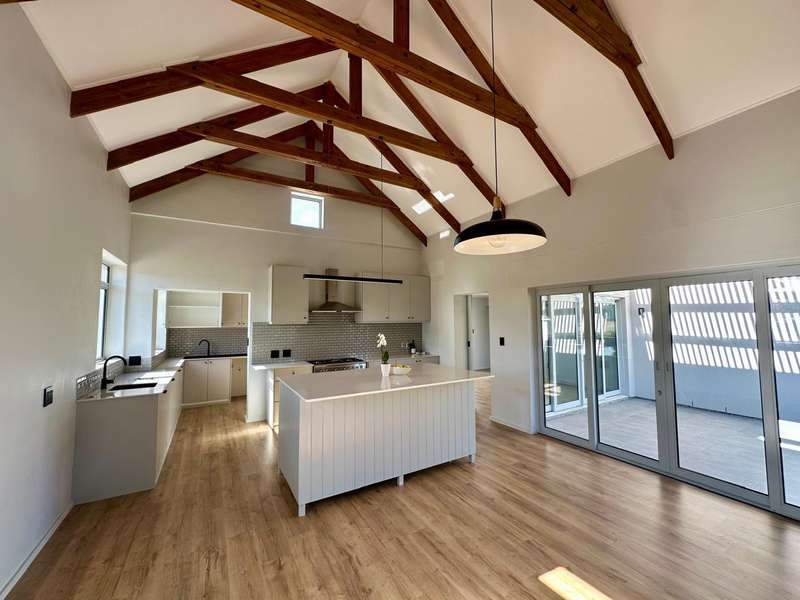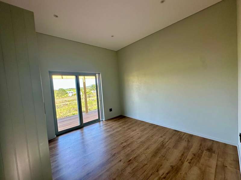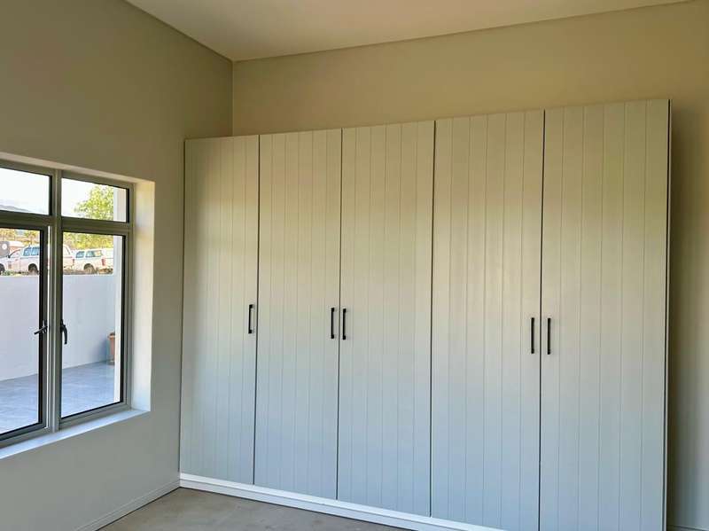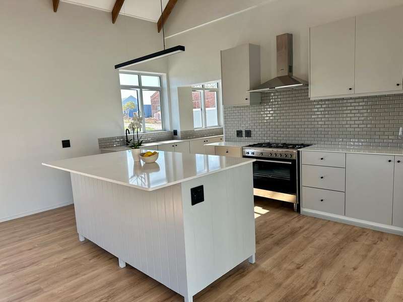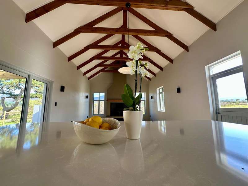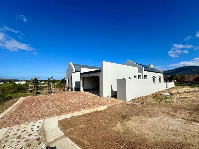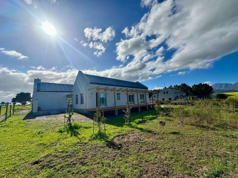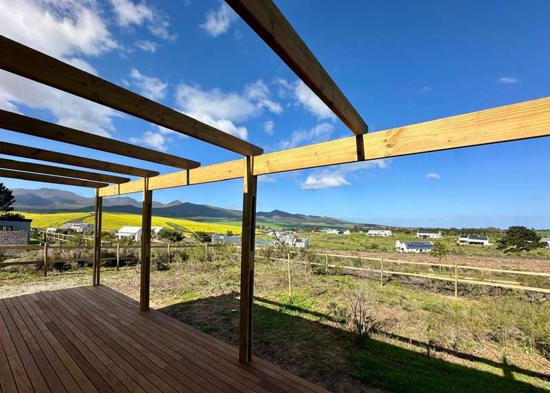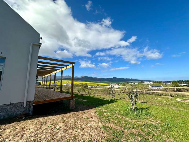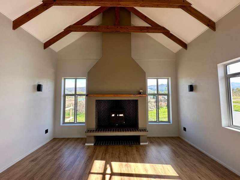 Thoughtfully designed by the resident developer to suit Western Cape weather, this single-story home maximizes natural light and panoramic views from its elevated plot. The 82.5m bedroom wing features a main bedroom with an en-suite bathroom and two additional bedrooms sharing a bathroom, all opening onto a south-facing stoep overlooking a dam. The 111.5m northern wing includes an open-plan living, dining, and kitchen area with a scullery, laundry, and double garage. The wings are connected by a light-filled 16.5m enclosed stoep and a spacious central outdoor stoep, sheltered from summer''s southeast wind. Each 400m plot includes an additional 600m exclusive-use area, enhancing the sense of space and farm-style living. The home features premium finishes such as: Laminated wood flooring in bedrooms 2 and 3, and the lounge Carpet in the main bedroom Quartz carpet flooring in bathrooms LED lighting throughout 7kW solar inverter with 5kW batteries Double-glazed aluminum doors and windows 12kW enclosed wood-burning fireplace Melawood kitchen cupboards and MDF built-in bedroom cupboards Detailed finishes and approved plans are available upon request. This is a unique opportunity to own a newly built home in a secure estate, blending remote farm-style charm with convenient access to major towns.