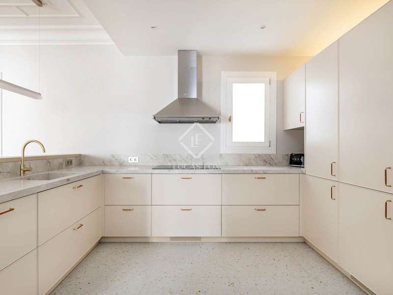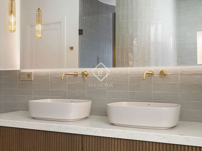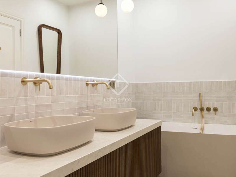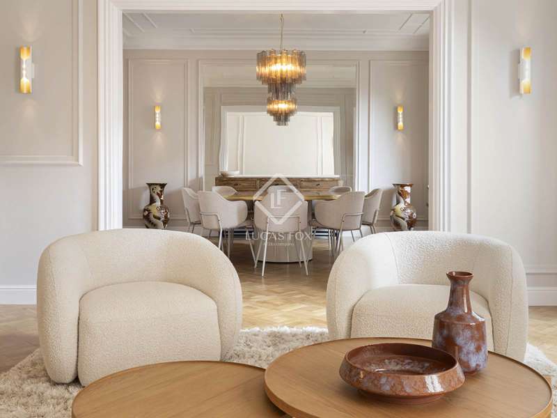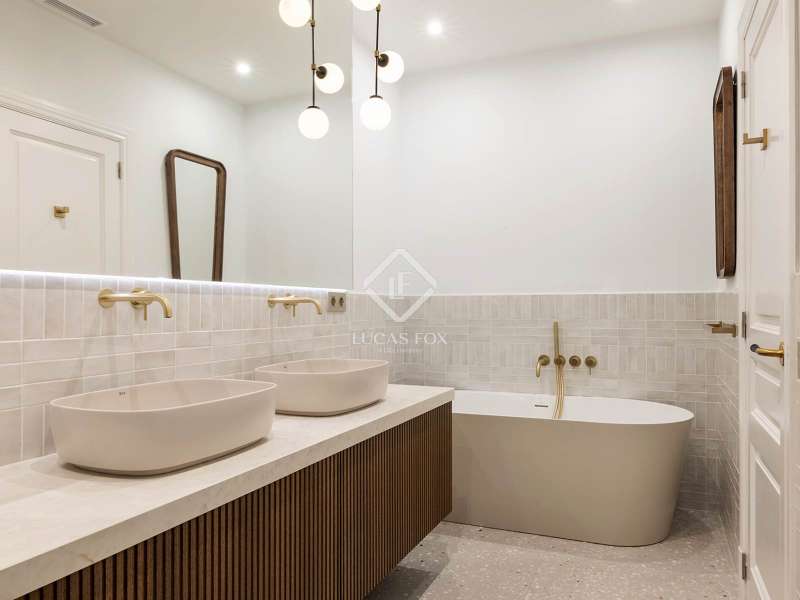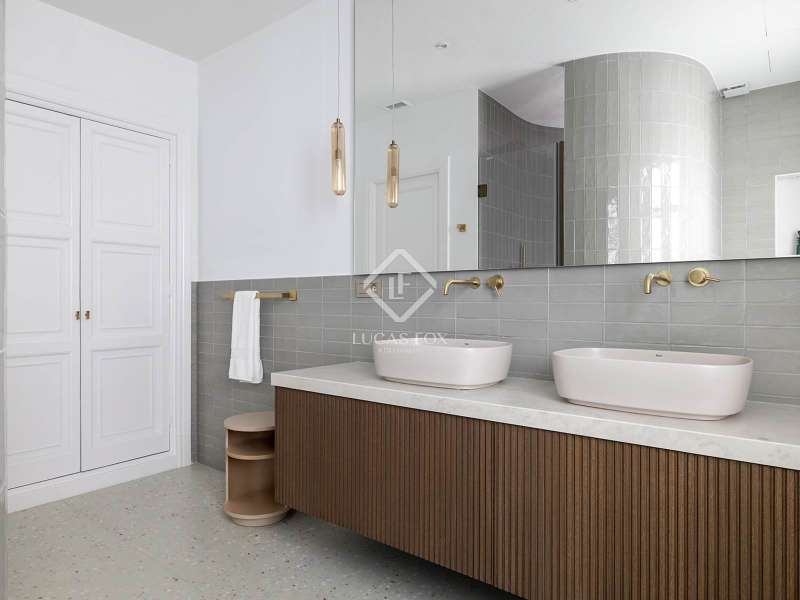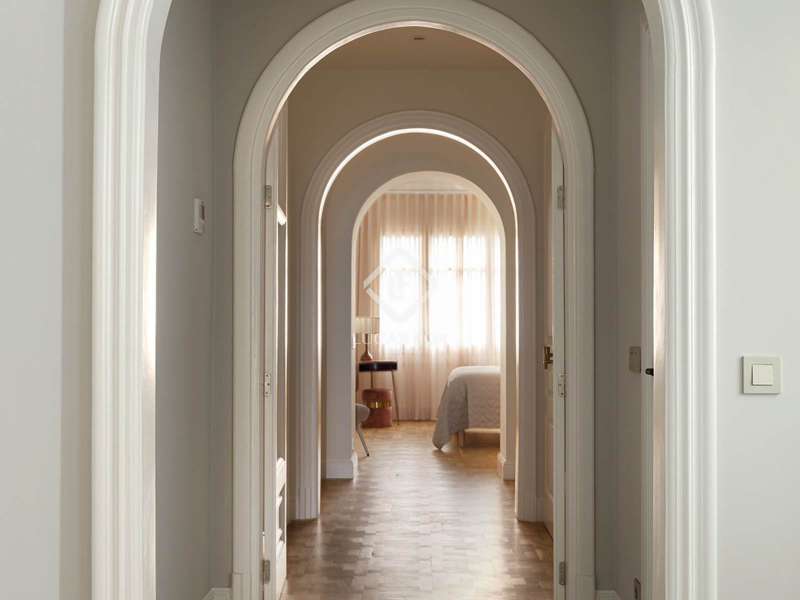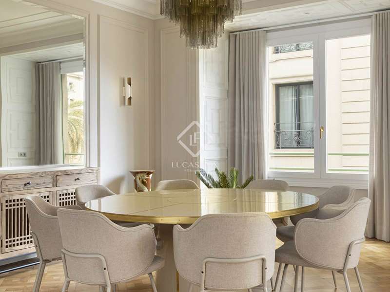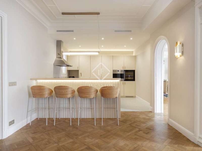 Nobohome has just completed the renovation of this impressive 250 m² apartment on the 3rd floor, which boasts stunning views of Muntaner Street from its prime location on Diagonal Avenue. The modernist building boasts a spectacular lobby, with a lift thanks to the concierge's careful maintenance. A second service elevator at the end of the lobby enhances the building's comfort. The apartment has been meticulously redesigned and renovated, ensuring maximum comfort and style. The spacious living room , overlooking Diagonal Avenue, blends seamlessly with the spacious dining room. The high-end kitchen, equipped with SMEG appliances , features an elegant breakfast bar and a cozy breakfast nook, perfect for informal dining. To the rear of the apartment, a stunning arched corridor leads to three generously sized double bedrooms, each with its own dressing room and luxurious private bathroom.