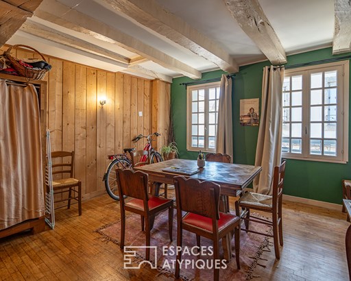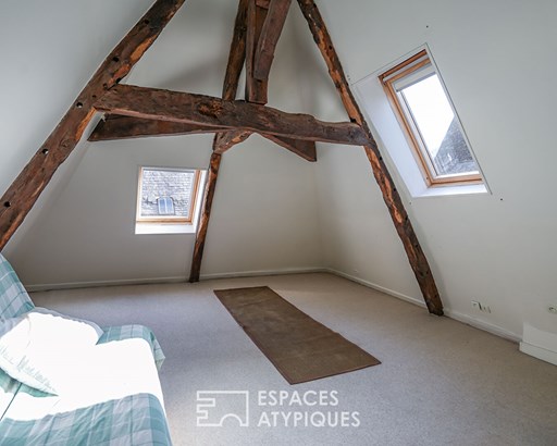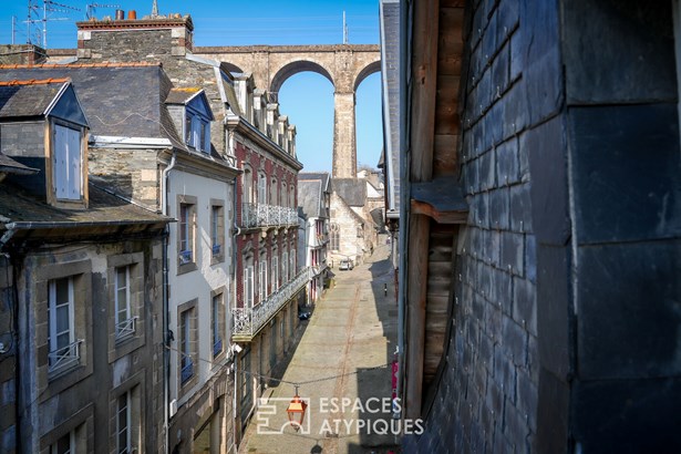 Located in the heart of the historic center of Morlaix, mixing historic buildings and picturesque alleys, this magnificent half-timbered house called Pondalez, embodies all the charm of local architecture. With its slate-covered facade, its stone ground floor and its corbels, it bears witness to the rich heritage of the city. Its unique environment makes it a privileged place to live for lovers of history and authenticity. The building is spread over several levels and includes a triplex of character, two independent studios and a commercial premises. A real rare gem, it will seduce lovers of authentic and atypical places. Accessible by its independent entrance, the 148.76 sqm triplex located on the first floor, offers a real journey through time. From the entrance, the ceiling height impresses, sublimated by exposed beams decorated with period paintings. The remarkable architectural elements, such as the majestic fireplace, the exposed stone, the oak frame and the cross-shaped timber framing, give this space a unique atmosphere. The 27 m2 kitchen and the 32 m2 living room offer a warm living environment full of history. On the first floor, a large bright bedroom as well as a bedroom with its own shower room, a bathroom and a laundry room make up a functional and family space. Under a splendid exposed frame, on the top level, two other bedrooms enjoy a breathtaking view of the roofs and the viaduct, offering a panorama worthy of a postcard. On the ground floor, a very beautiful commercial premises of 58.90 sqm (Carrez law), currently rented, constitutes an opportunity for immediate profitability. Two independent studios enrich the potential of this property: one, furnished and rented, offers a surface area of 33.68 sqm, while the second, of 26.04 sqm, remains to be finalized according to needs. A storage room can also be used to store bicycles. At the crossroads of history and investment, this exceptional residence will appeal to heritage lovers looking for a unique property. Its privileged location, in the city center and a few steps from shops and picturesque alleys, makes it an ideal choice for a family residence, a pied-a-terre or an investment with high potential. The entire property is for sale. Technical characteristics: No co-ownership, connection to fiber optics and mains drainage.