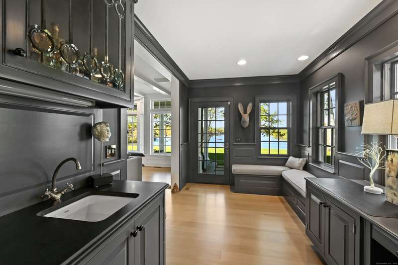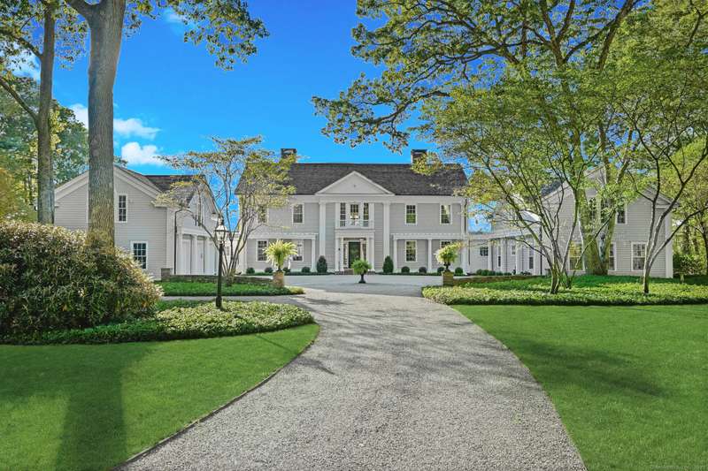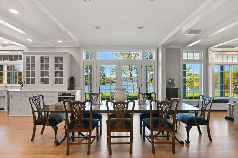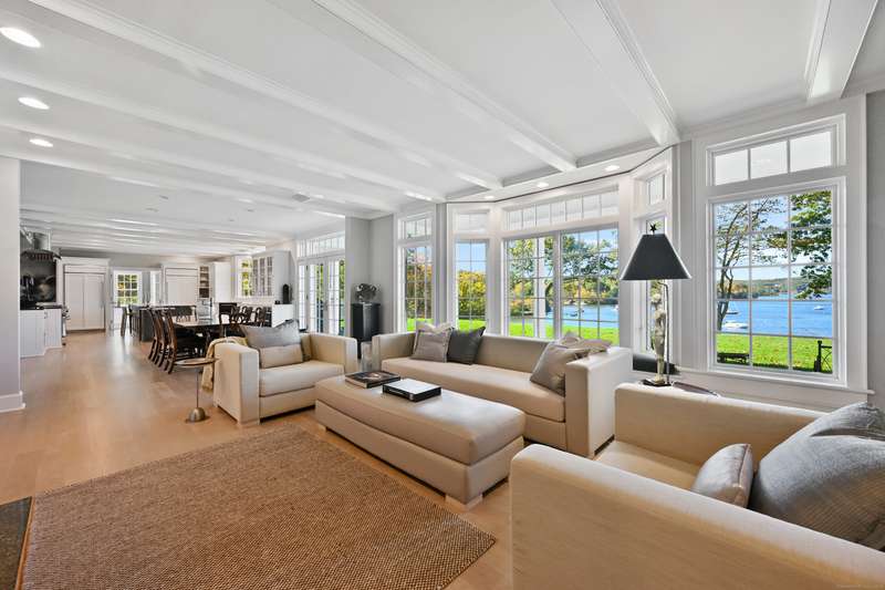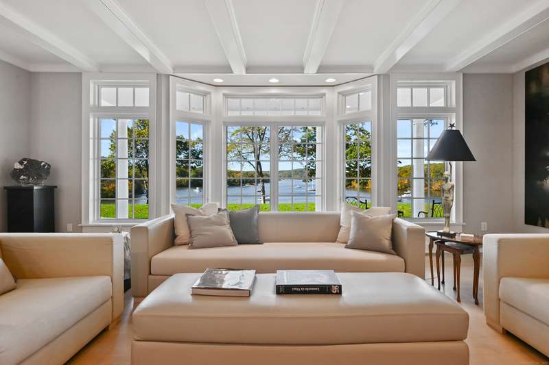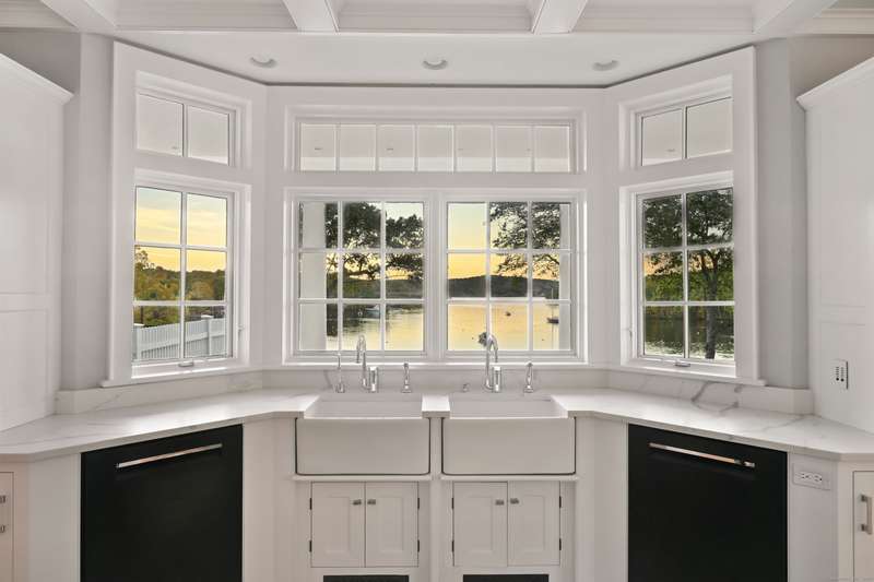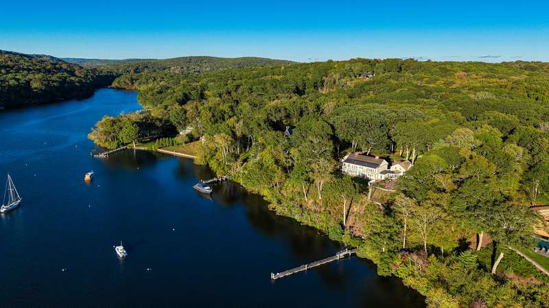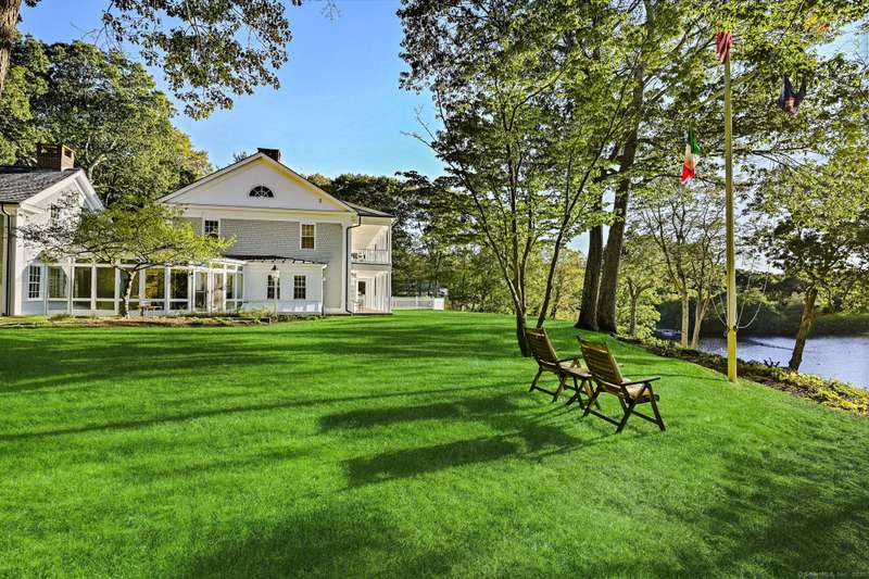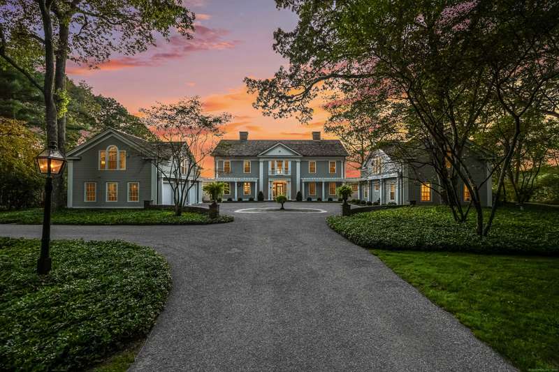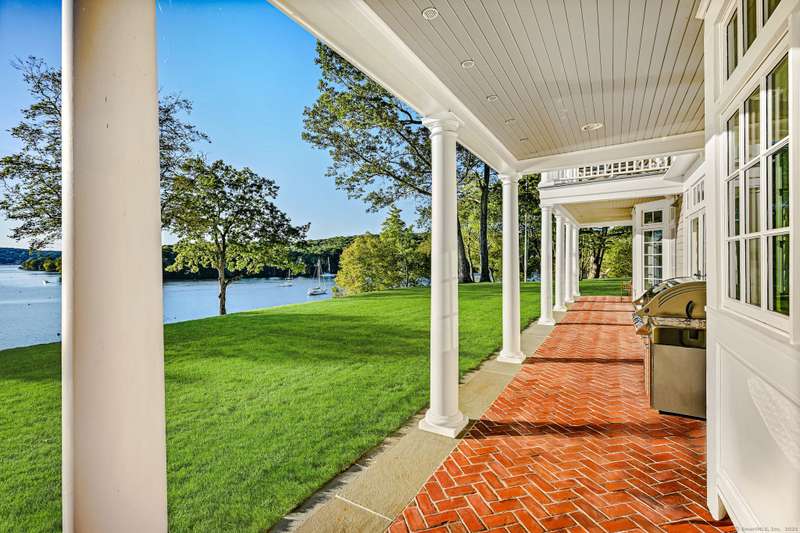 Architect-designed and inspired by Palladio's symmetry and Mount Vernon's timeless colonial grace, the essence of classic balance, symmetry, and luxury. A center-columned portico anchors the perfect proportion between two grand wings, while the interiors reveal artistry at every turn-gleaming wood floors, custom millwork, and walls of windows framing Hamburg Cove's deep-water yacht basin-where sails and yachts drift across shimmering water lusters reflecting a symphony of mystical moorings that capture what is widely considered the most breathtaking panorama on the Cove. Two magnificent semi-rotunda sunrooms at each end bathe the space in natural light, blending formal entertaining and cozy private havens that are elegant yet casual and comfortable. The chef's kitchen features a large center island and commercial-grade appliances. Two primary suites-one on each level. A large guest apartment rests over three of the six garages. The finished lower level includes a gym, billiards, and a