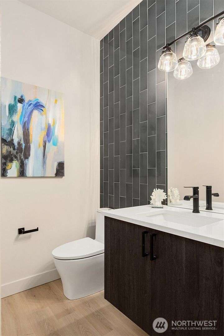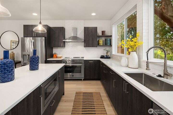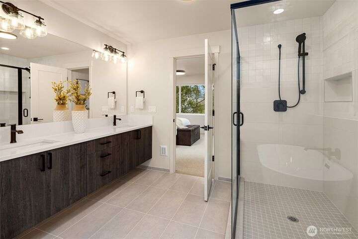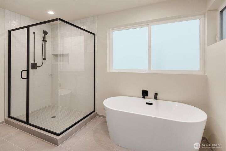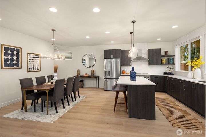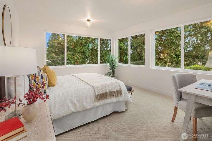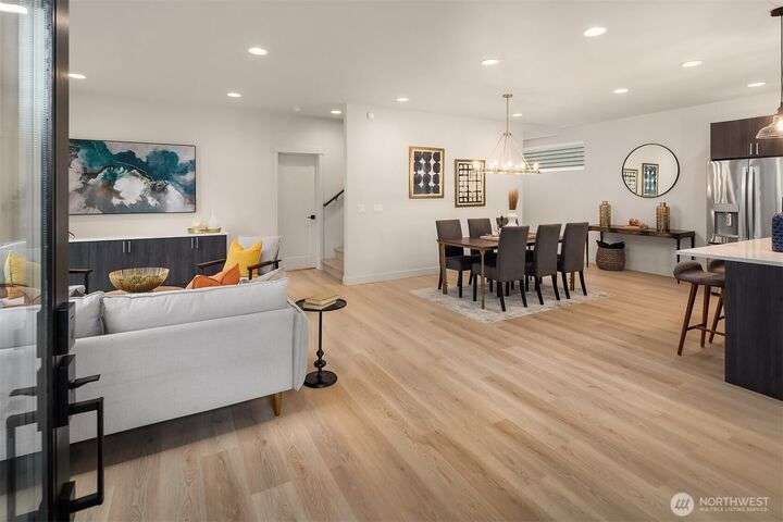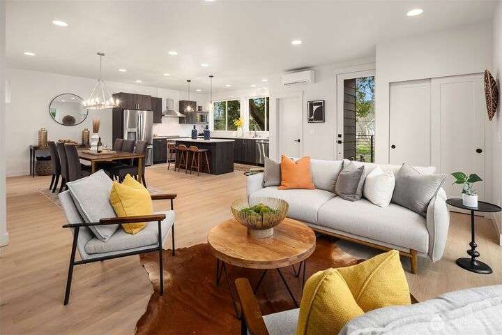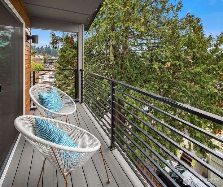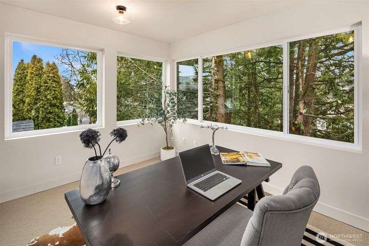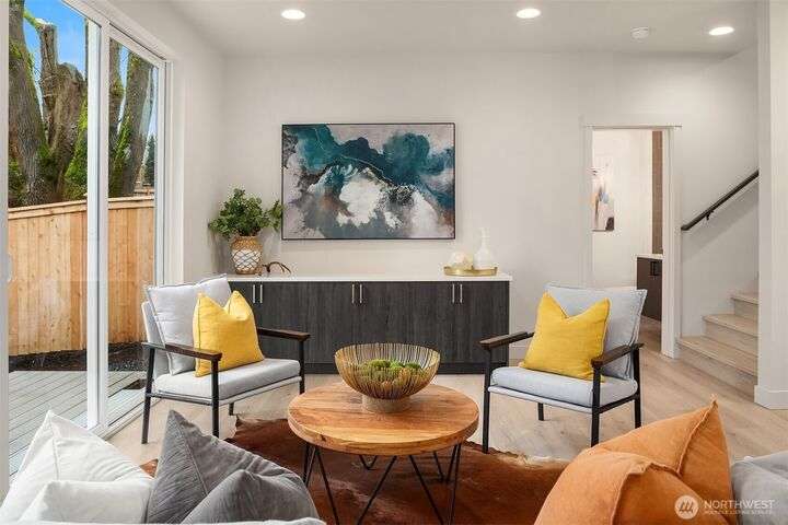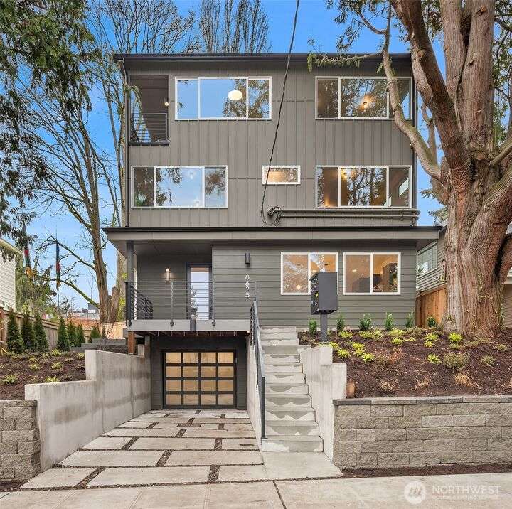 From Ashworth Homes, a spacious new residence near Green Lake. Nestled in the trees on a quiet street, this home checks all the boxes. Light-filled open-concept living and dining with convenient built-ins. Kitchen includes large island and walk in pantry, perfect for group gatherings. Sliders open to private, fenced patio and yard. Powder room completes this level, accommodating guests. Second level offers two bedrooms, full bath and large laundry room. Top floor primary boasts territorial views, slider to private deck, walk in closet and full bath. Additional upstairs room could function as nursery or office. EV-ready attached garage. Approximately 1/2 mile to Green Lake and 1 mile to Northgate Link Light Rail plus quick I-5 access.