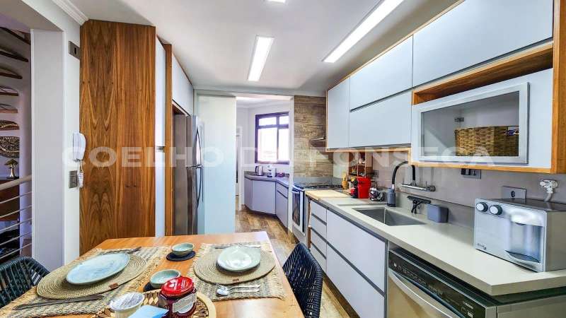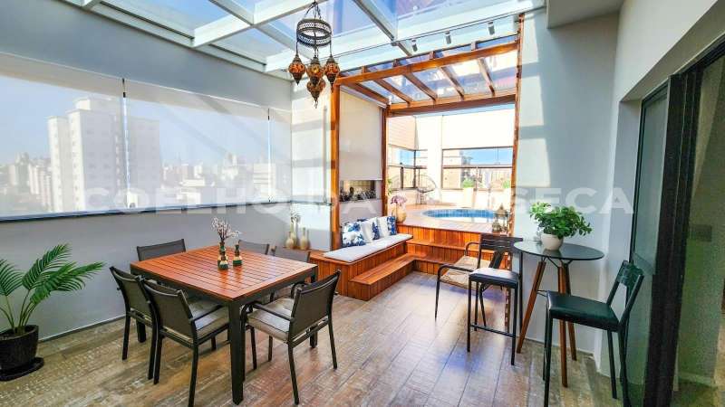 Cobertura duplex, reformada, com área de lazer. 4 suítes, sendo a master com closet, todas com ar condicionado, marcenaria planejada em todos os cômodos, Ambientes muito iluminados e ventilados, lavabo, dependência de funcionária, área externa gourmet coberta com piscina aquecida e churrasqueira. Localização excelente próximo das melhores escolas e faculdades e a todas facilidades que o bairro pode oferecer, como padarias, farmácias. Prédio com lazer completo!