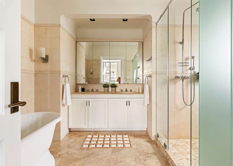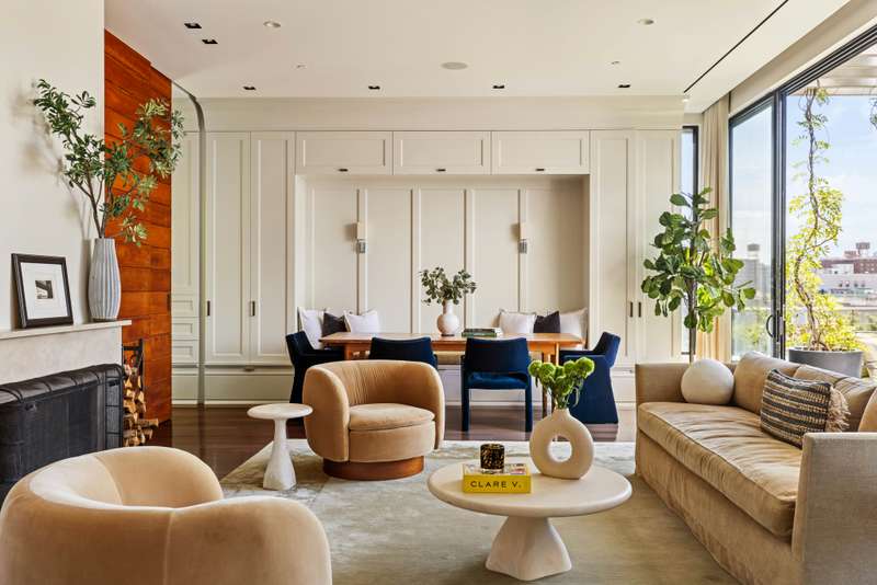 This unique home has a distinctly modern design. A keyed elevator opens directly into a gracious entry foyer with thoughtfully built-in coat closets. Upon entry into the living space you will find an expansive, south-facing, and exceptionally wide, sun-drenched living/dining room. This space features a wood-burning fireplace, custom millwork, substantial built-in storage and floor-to-ceiling sliding glass doors which open onto a vast terrace offering open sky views-perfect for entertaining or quiet morning coffee. Adjacent to the living/dining room is a spacious study with a large, south-facing window and French doors opening to the terrace. This large room, currently used as a private office, can also function as a sixth bedroom.