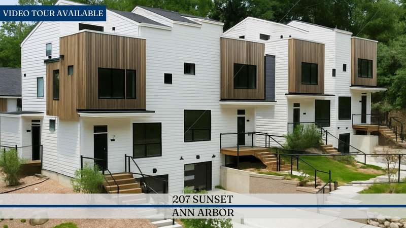Nestled in Ann Arbor's sought-after Water Hill neighborhood, this modern new construction home exemplifies meticulous craftsmanship and thoughtful design. Situated on a prominent lot, the residence offers views from every window, capturing the Huron River and downtown Ann Arbor. The home's prime location provides immediate driving access M14 and walking to the natural beauty of Hunt Park and the Bluffs Nature Area, both just steps away via Sunset Road. A short walk leads to the vibrant Kerrytown district, renowned for its farmers market, boutique shops, and restaurants. Inside, the open floor plan is adorned with warm white oak flooring and custom built-ins, creating a harmonious blend of comfort and style. Expansive windows flood the space with natural light, enhancing the home's inviting atmosphere. The bathrooms feature elegant quartz countertops and durable tile flooring, and the second floor laundry room boasts ample counter space with cabinet storage. The primary bathroom offers a spacious double vanity, providing ample storage and convenience. The top floor offers versatile space, ideal for a home office or creative studio. Step out onto the private balcony to find yourself nestled among the treetops, offering a serene retreat with stunning views. This exceptional home combines modern amenities with a prime location, offering a unique opportunity to experience the best of Ann Arbor living. Please adhere to showing protocols established by the State, MAR, REO, and the seller. A licensed Michigan Realtor must be present for the duration of all showings. Photos are from next door unit with a reverse floor plan.