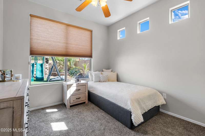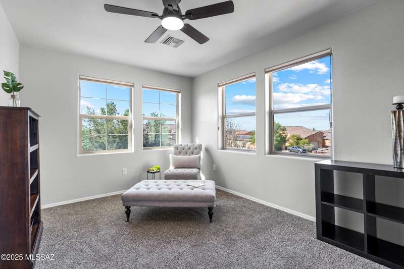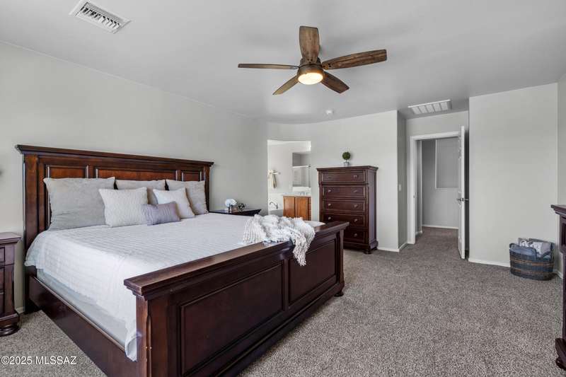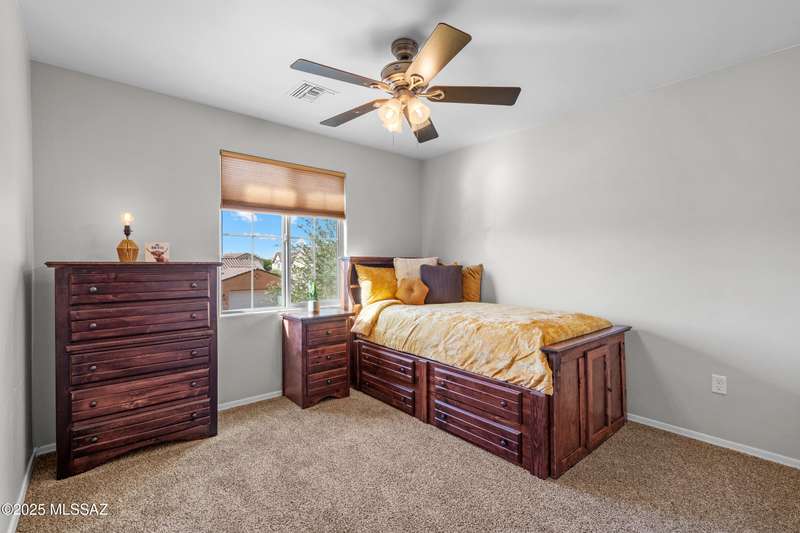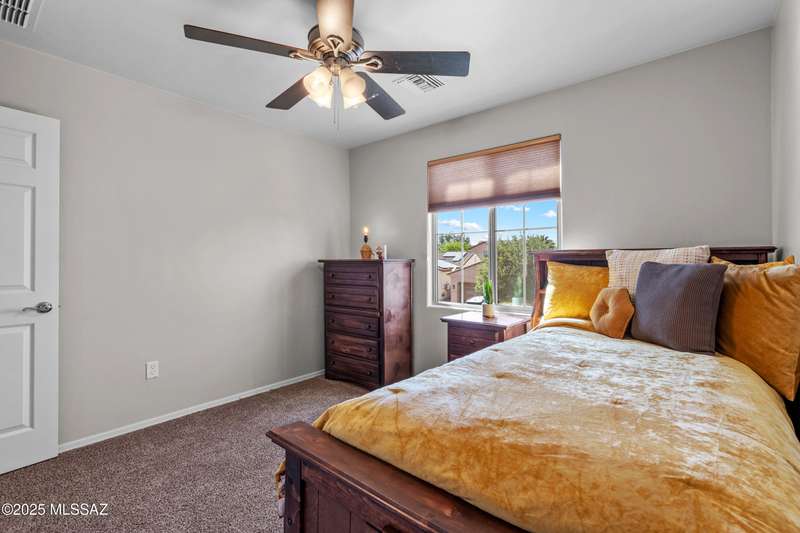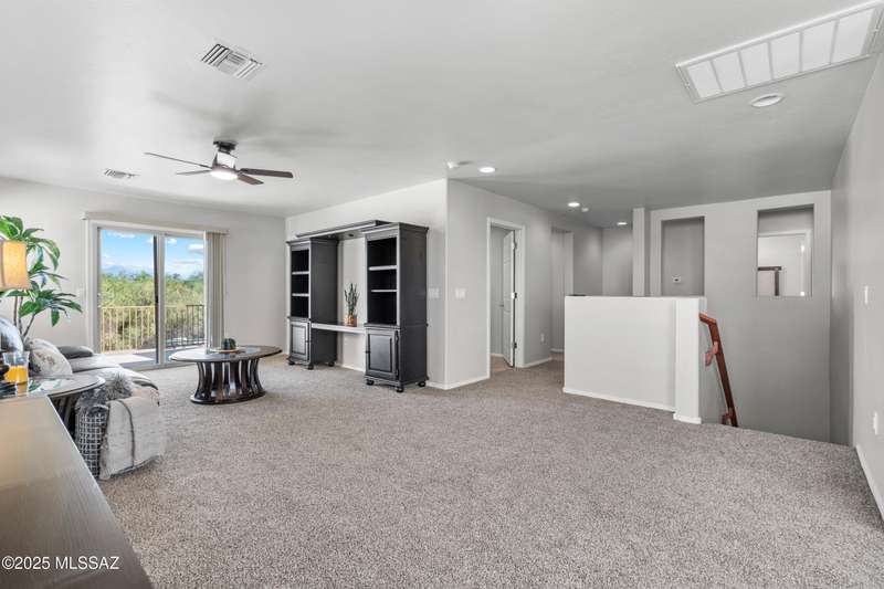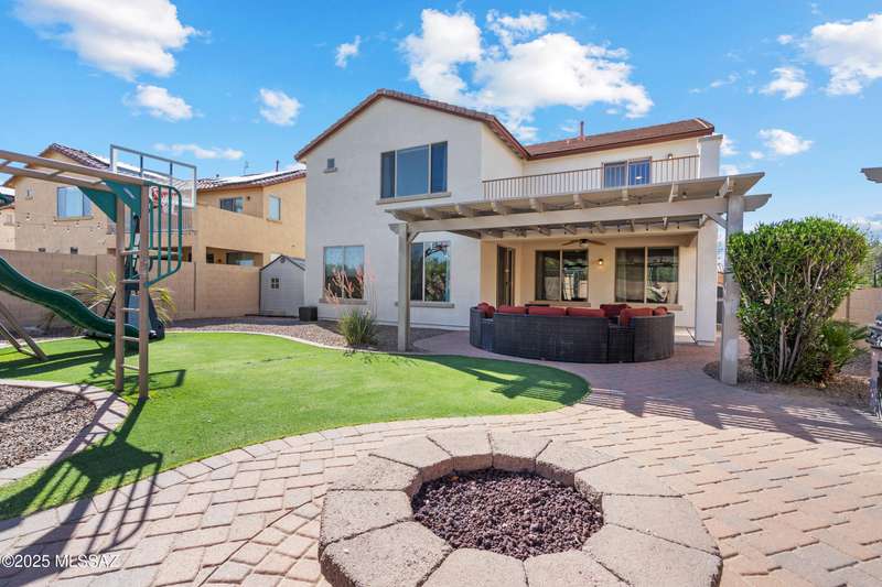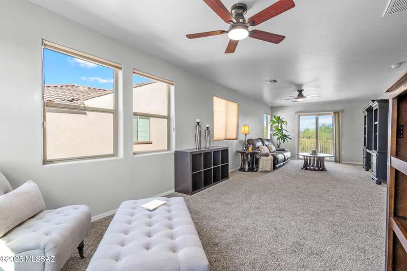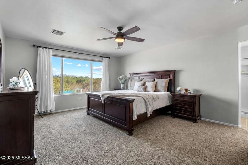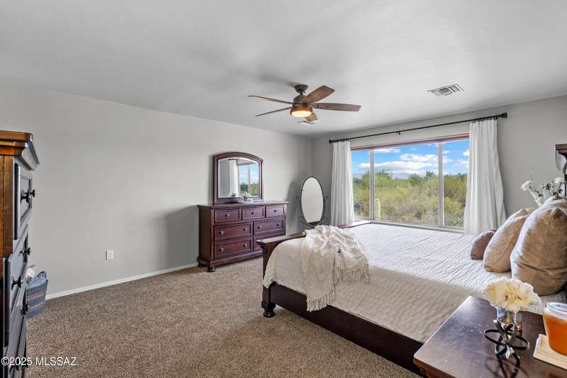 $5K towards rate buydown! Spacious home with NEW paint inside & out. Beautiful ceramic tile flooring dwnstrs & brand-new carpet upstrs. Convenient dwnstrs bedrm & full bathrm make for a perfect in-law quarters. Upstairs, you'll find a huge loft ideal for 2nd living area, game rm, or hmschool classrm w/private balcony. The expansive primary suite offers a peaceful retreat w/beautiful desert landscape views- perfect for enjoying serene mornings or sunset views. The backyrd is designed for year-round enjoymnt & entertaining, with large pergola, built-in BBQ, fire pit, & low-maintenance turf--all set against the backdrop of no rear neighbors & direct views to natural desert scenery & the scenic Safari Trail. Additional highlights include new water softener & a spacious 3 car tandem garage...
