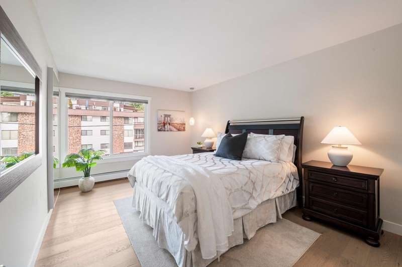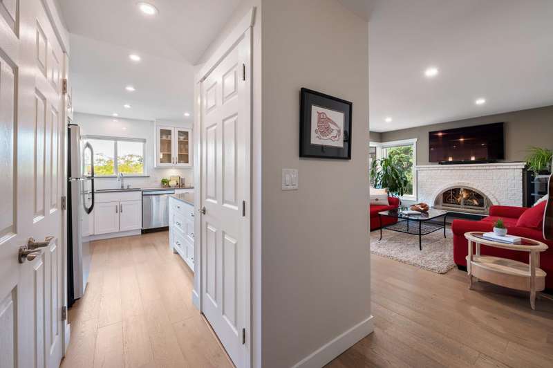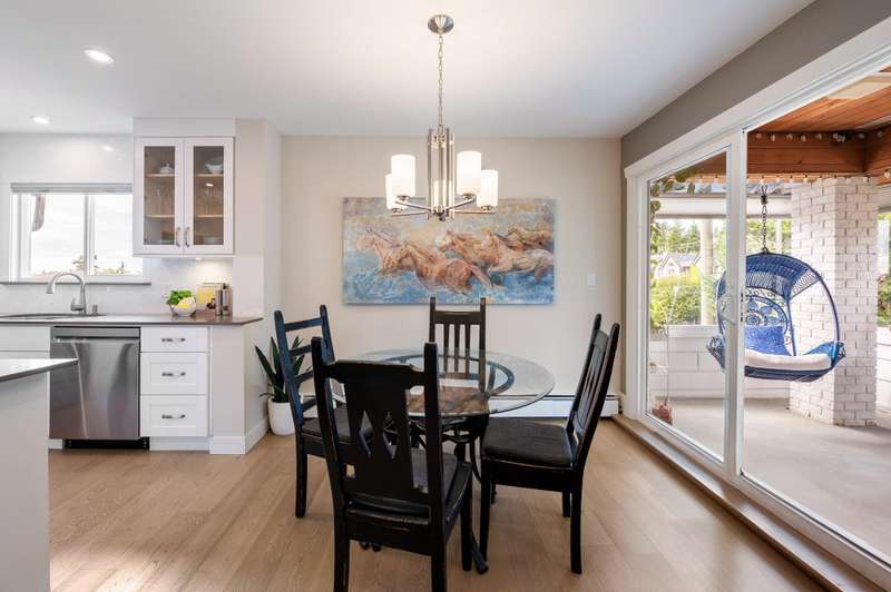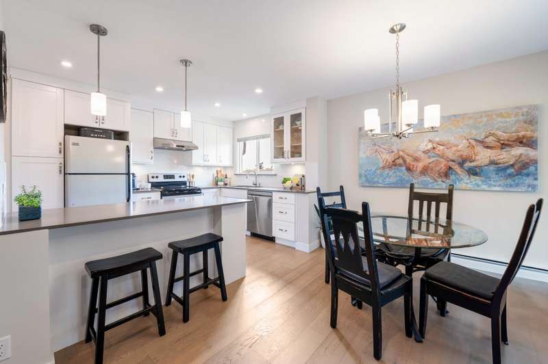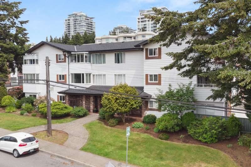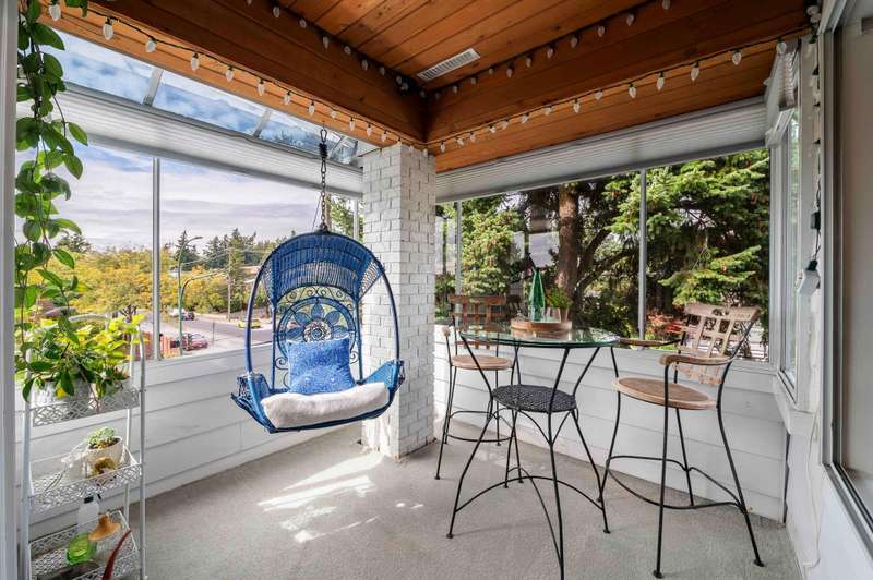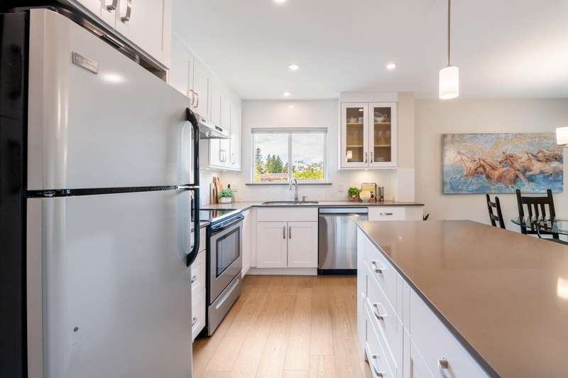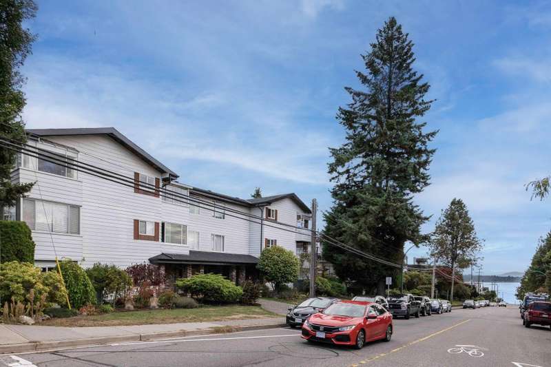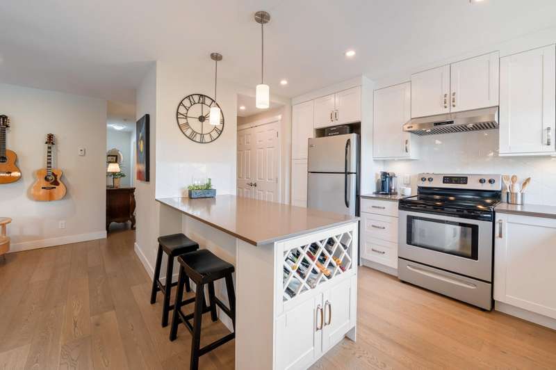 Stunning and spacious TOP FLOOR CORNER unit in sunny White Rock, this 2 BR, 2 BATH home shows as a "perfect 10". Fully renovated in 2020 ($90k), it features a desirable 1000+ sq ft layout with large entryway, extra storage and lots of light. Kitchen w/ counter bar opens to dining/living area with a charming gas fireplace. Updates: engineered hardwood floors, kitchen, bathrooms, blinds, lighting, ceiling, doors, trim & more! Primary bedroom easily fits king bed, has walk thru closet & 3-piece ensuite with large shower. In-suite laundry. Solarium to enjoy all year round. Well managed strata, roof (2021), newer windows. Heat & hot water included in monthly fee. Excellent walkable neighbourhood close to shops, dining, transit, beach & the WR Pier! All ages welcome, 2 pets (cats/dogs) allowed.