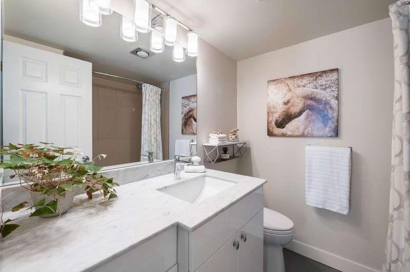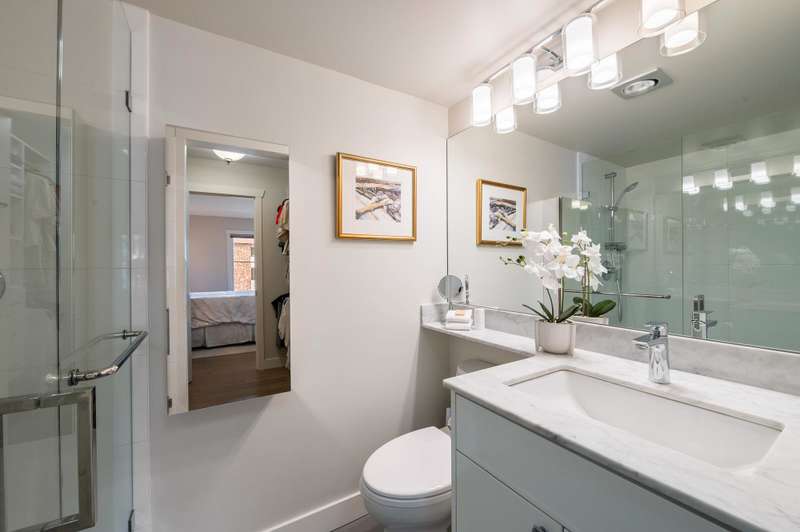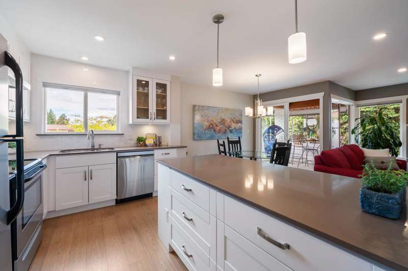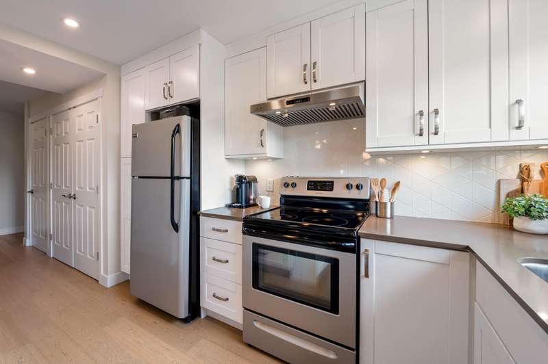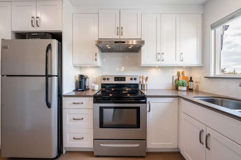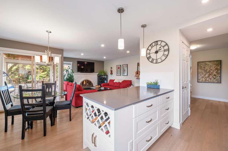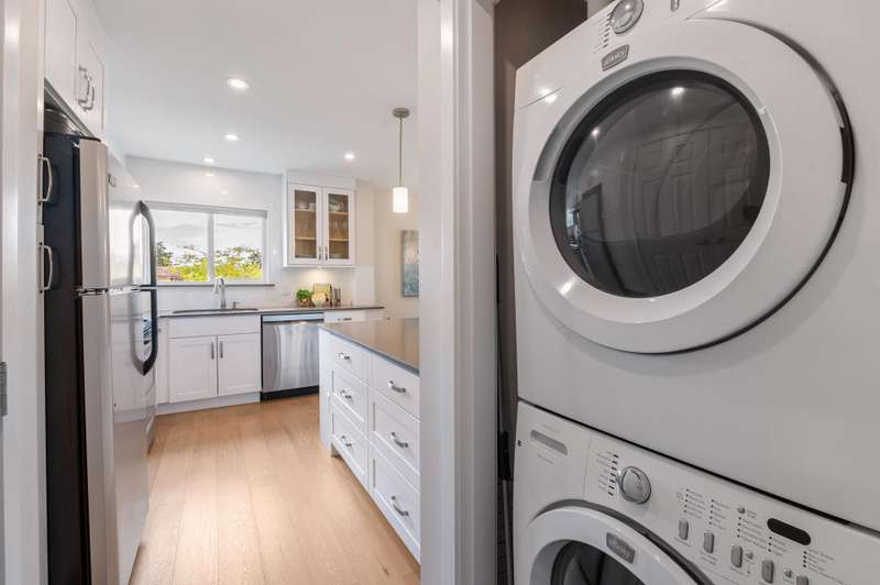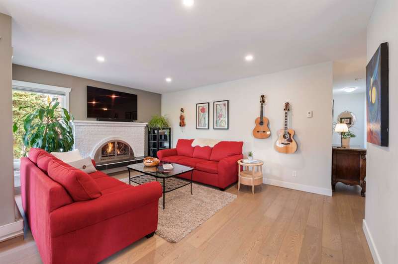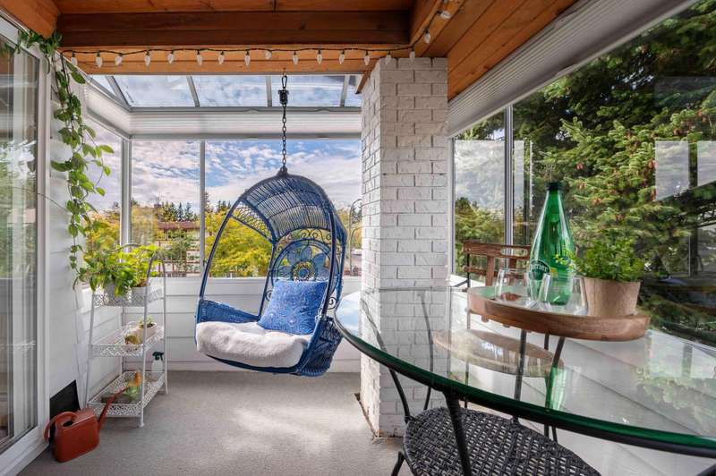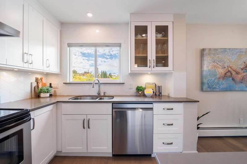 Stunning and spacious TOP FLOOR CORNER unit in sunny White Rock, this 2 BR, 2 BATH home shows as a "perfect 10". Fully renovated in 2020 ($90k), it features a desirable 1000+ sq ft layout with large entryway, extra storage and lots of light. Kitchen w/ counter bar opens to dining/living area with a charming gas fireplace. Updates: engineered hardwood floors, kitchen, bathrooms, blinds, lighting, ceiling, doors, trim & more! Primary bedroom easily fits king bed, has walk thru closet & 3-piece ensuite with large shower. In-suite laundry. Solarium to enjoy all year round. Well managed strata, roof (2021), newer windows. Heat & hot water included in monthly fee. Excellent walkable neighbourhood close to shops, dining, transit, beach & the WR Pier! All ages welcome, 2 pets (cats/dogs) allowed.