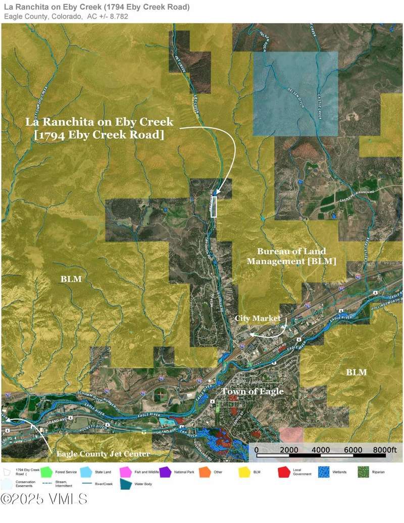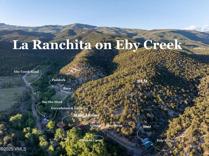 La Ranchita on Eby Creek (a.k.a. 1794 Eby Creek Road) is an 8.782 +/- acre 'live water' property in Eagle County, Colorado. La Ranchita includes a 5,559 square foot single-family home with seven bedrooms / eight bathrooms [one of the bedrooms / bathrooms being a lock-off apartment], an upper level living room, a lower level family room, a large 3rd floor flex [crafts] space, a mud room, covered decks, 'the turret', an oversized three vehicle garage, a chicken coop, an enclosed garden & yard [including a greenhouse and 'the-She-Shed'], a horse barn, and a pole barn + shed. Eby Creek [with small pools for trout] runs year-round through the property. The 'Eby Creek' area is one of the most unique, beautiful, private, yet convenient locations in the Vail Valley. La Ranchita on Eby Creek is situated in unincorporated Eagle County [zoned rural residential] but is only 1.8 miles from City Market [Kroger] and 2.3-miles from the Town of Eagle. Other distances include 25-miles to Beaver Creek [skiing], 31-miles to Vail [more skiing], and 8-miles to the Eagle County Regional Airport & Jet Center [EGE]. The La Ranchita offering includes water rights. A custom interactive map of the property and the surrounding area is available upon request. Additional photos are forthcoming.