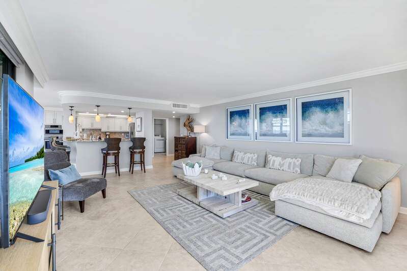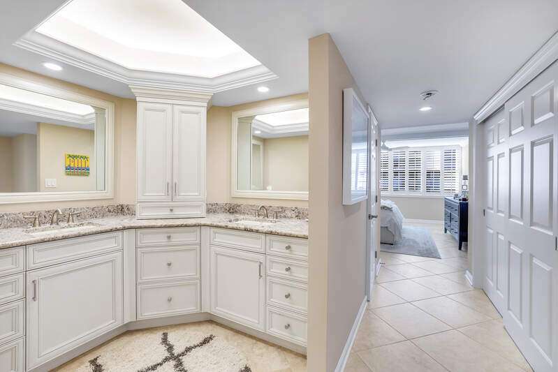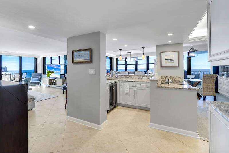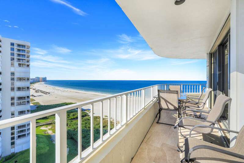 Experience luxurious beachfront living in this 3-bedroom, 3-bath residence at Summit House on Marco Island. This south-side, front-facing unit offers a wraparound balcony with breathtaking sunrise-to-sunset views of the Gulf of Mexico and beach. The open floor plan features a spacious kitchen with custom cabinetry, granite counters, and a built-in wet bar with wine cooler. The primary suite includes his-and-her closets with custom built-ins, a large bath with dual vanities, and walk-in shower. Two expansive guest suites each offer en suite baths and space for two queen beds. Additional highlights include impact windows and sliders, accordion shutters, tile flooring throughout, abundant storage with multiple closets, a walk-in storage room inside the unit, and a private storage area near the elevator. Summit House provides a private path to the beach and resort-style amenities including a pool, spa, fitness center, social room, bike storage, and grill area, plus plenty of covered parking for owners and guests.
