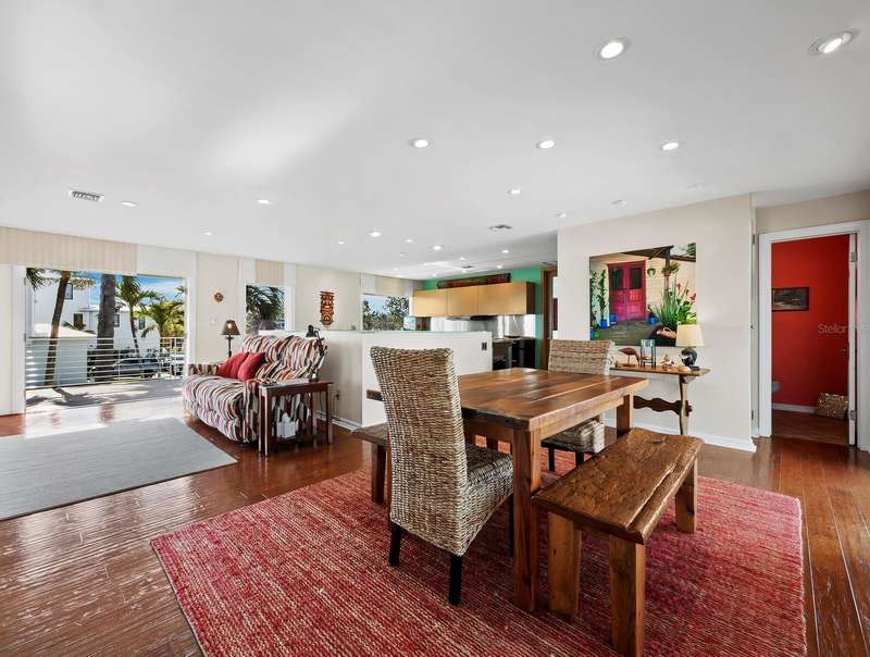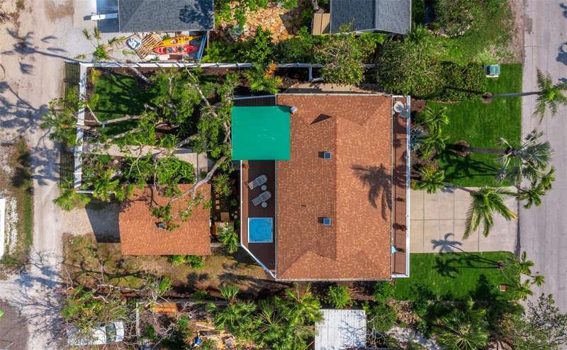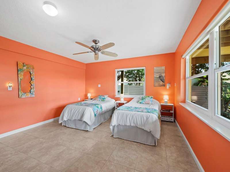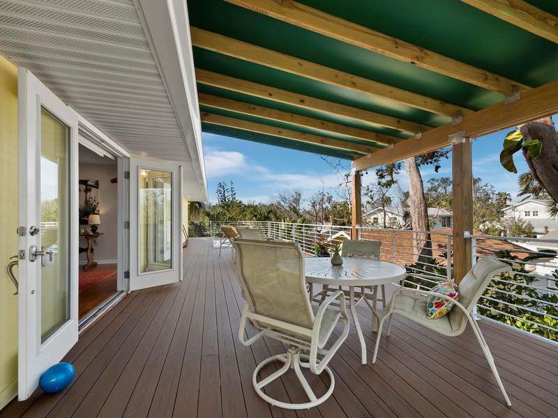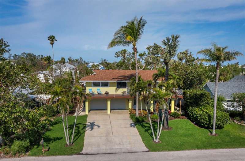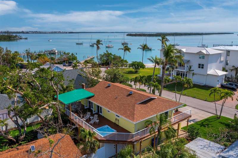 HUGH PRICE REDUCTION!!!Welcome to historic Longbeach Village, the first neighborhood, established on Longboat Key in 1885. As you enter The Village you will notice a variety of architectural home styles from the 1930s to the present day reflecting the diversity of the folks who live here. This wonderful home has stunning water views of Sarasota Bay, The Village harbor with its small public beach, the town dock, and the boat ramp all of which serve as community gathering spots to launch your boat, kayaks, canoes, and view sunrises, sunsets, dolphins, manatees, and aquatic birds. Pelicans love this placid harbor. Capture and immerse yourself in these magical surroundings from the spacious elevated second level front deck. The open concept great room with the three sets of French doors and seven windows is flooded with natural light. The kitchen offers bay views and will be the envy of amateur as well as gourmet cooks. Here you will enjoy a Sub-Zero refrigerator, two drawer Sub Zero freezer, Wolf 5 burner range, large Wolf oven, Miele steam oven, Tanzanian granite counter tops, custom German cabinets, large and deep storage drawers, workstation, and travertine floors. The great room includes an abundance of recessed lighting and a free-standing wood burning fireplace on a raised hearth as well as a dining area with a distinctive wood table, benches, and chairs. The primary bedroom has water views, access to the wrap around deck through sliding glass doors, and a large walk-in closet, en-suite bathroom with striking wood vanity and marble-like glass sink and dual rainfall shower heads. The powder room off the great room has high end fixtures. The guest bedroom has twin beds, a ceiling fan and rolling shades to keep the light out. The adjoining room could function as an office, art studio, or an extra bedroom. The bathroom has a shower stall and a walk-in closet. The oversized two car garage has hurricane reinforced doors, windows, a work bench, ample shelving throughout and peg boards for tools. A composite “wood” deck that is impervious to rot and insects, surrounds the entire house creating massive outdoor living space. The back deck, overlooking a beautifully landscaped yard, has a heated hot tub, a dining area which has a new awning, and a staircase leading to the backyard, guest house/studio, and new two-person barrel sauna in 2023. The guest house/studio was totally renovated by current owners in 2015 with new Hardi Board siding and insulation. It could also serve as a recreation room with pool table etc. All windows throughout the structures are hurricane compliant. Meticulous and impeccable pride in ownership can be found in every detail throughout! From this lovely home you can walk to the beach, five restaurants, and Whitney Beach shopping center. The Centre Shops with dining, boutiques, hair salon, UPS store are about three miles south. Bradenton Beach, with its multiple attractions, is less than 1 mile north. Famous St. Armands Circle is eleven miles south. The Villagers meet once a month from October to April for socializing and gathering updates on LBK activities. Offered furnished, completely outfitted, and move in ready excluding original artwork and some personal items.