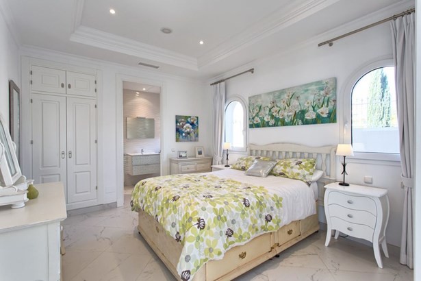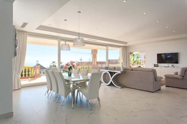 Spacious quality built villa in Los Flamingos Golf Resort, Villa Padierna. Built in 2013, south facing, with spectacular views to the coast and the Mediterranean.Main floor: Large living and dining area, open plan fully fitted kitchen with Siemens and AEG appliances and breakfast corner, laundry, guest toilet, one guest bedroom en suite. Direct access to the covered and open terraces. Elevator to all floors.Upper floor: Master bedroom with his and hers bathroom en suite and two guest bedrooms en suite.Lower floor (basement): Four further bedrooms en suite with living area and cinema room.Parking for 4 cars (carport).Private garden with pool.Close to all amenites, golf and the beach.