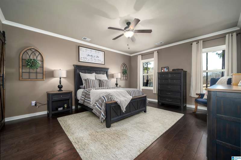 Welcome home to this beautiful 4-bedroom, 3-bath retreat in the gorgeous Ballantrae Glen Iris Community with stunning golf course views. From the moment you step inside, you'll love the newly painted interior, soaring ceilings, warm hardwood floors, and upgraded light fixtures that give this home such character. The main level primary suite is a private oasis with a spa-like ensuite featuring a garden tub, oversized shower, and double vanities. The kitchen is truly the heart of this home, with a large island, granite countertops, stainless steel appliances, and slate backsplash. Main level also offers guest bedroom and bath. Upstairs, you'll find two more bedrooms, a full bath, and a flex space that can be your game room, home office, or play area. Step outside to take in the golf course views from your screened-in porch and open patio-perfect for entertaining. 1-year Home Warranty offered by Seller. Schedule your showing today!