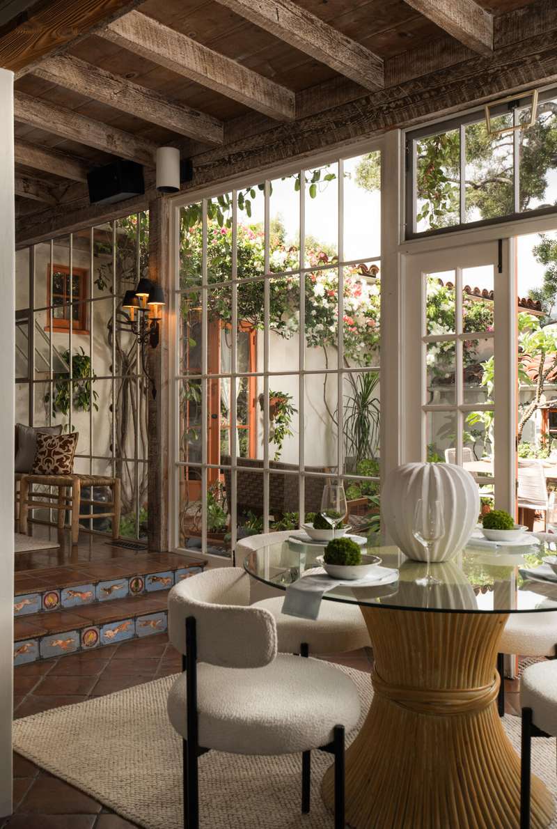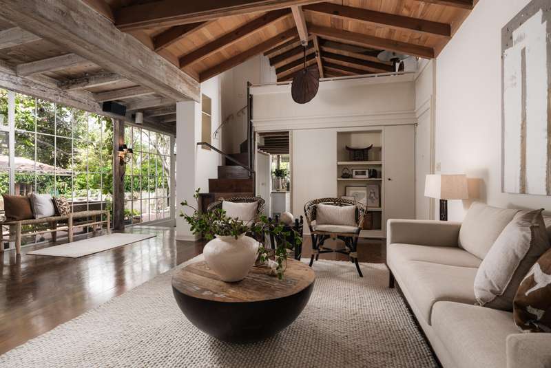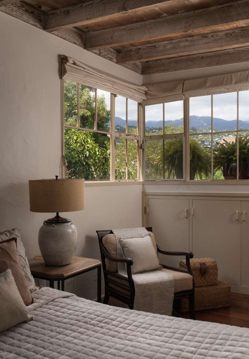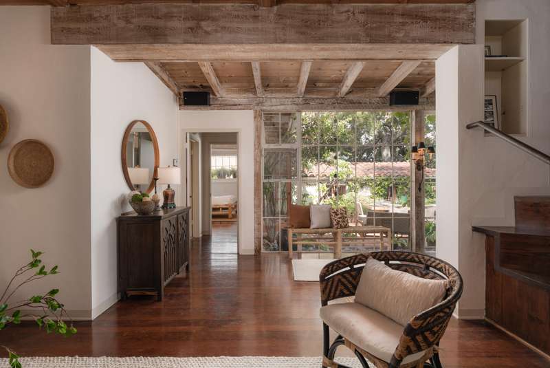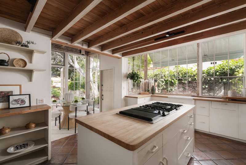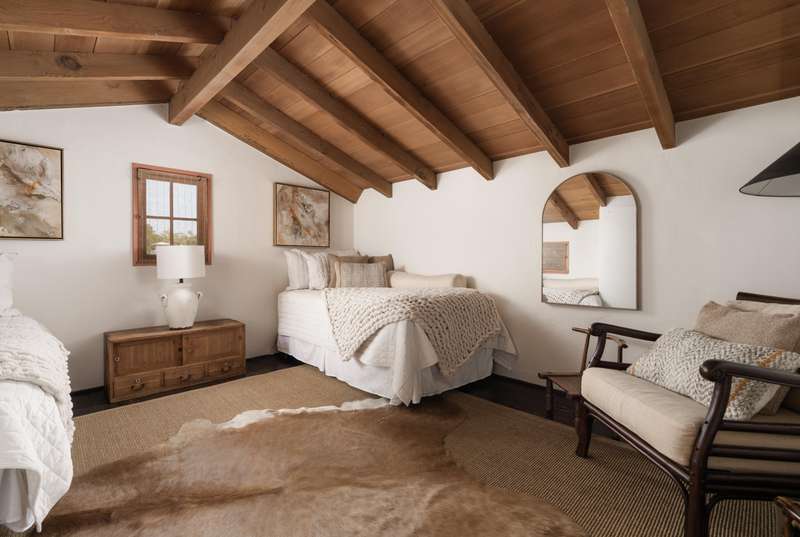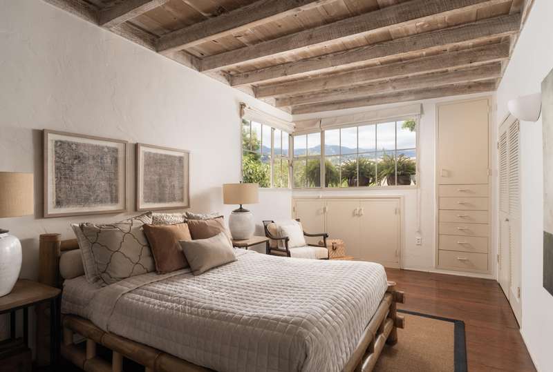 Clean, whitewashed interiors showcase original exposed beams and handcrafted details. The living spaces flow to a secluded, sun-filled brick courtyard, wind-protected, and ringed with low-maintenance plantings created when Riggs linked the once-separate structures with a new primary suite. French doors spill from the bedroom to the patio, inviting morning coffee and golden-hour dinners.